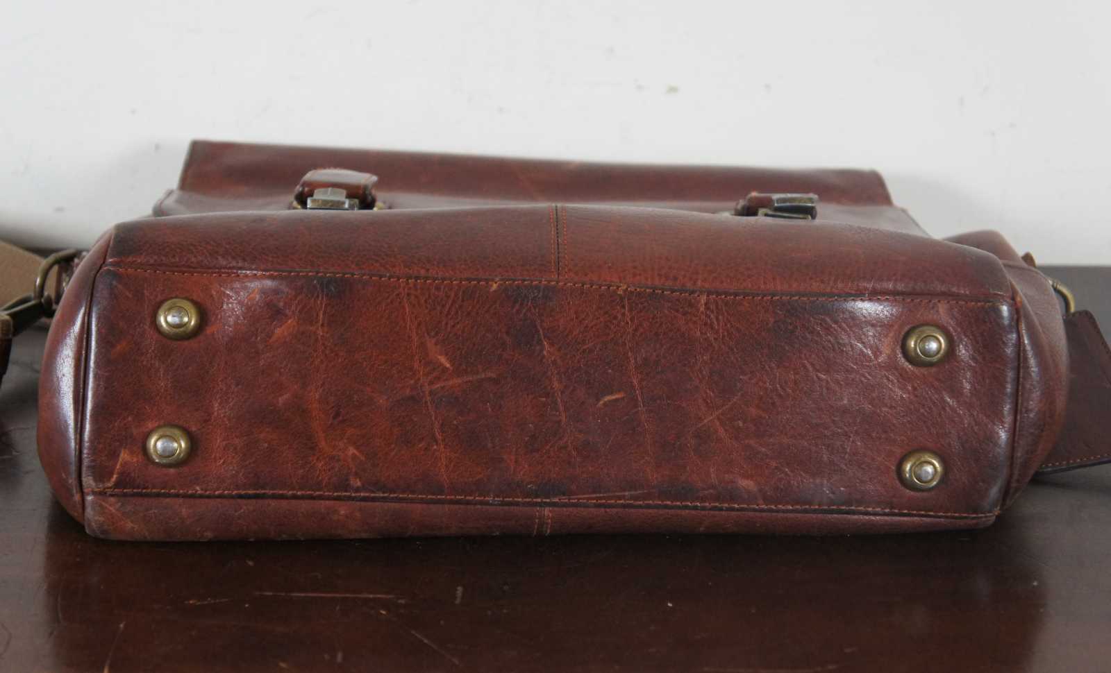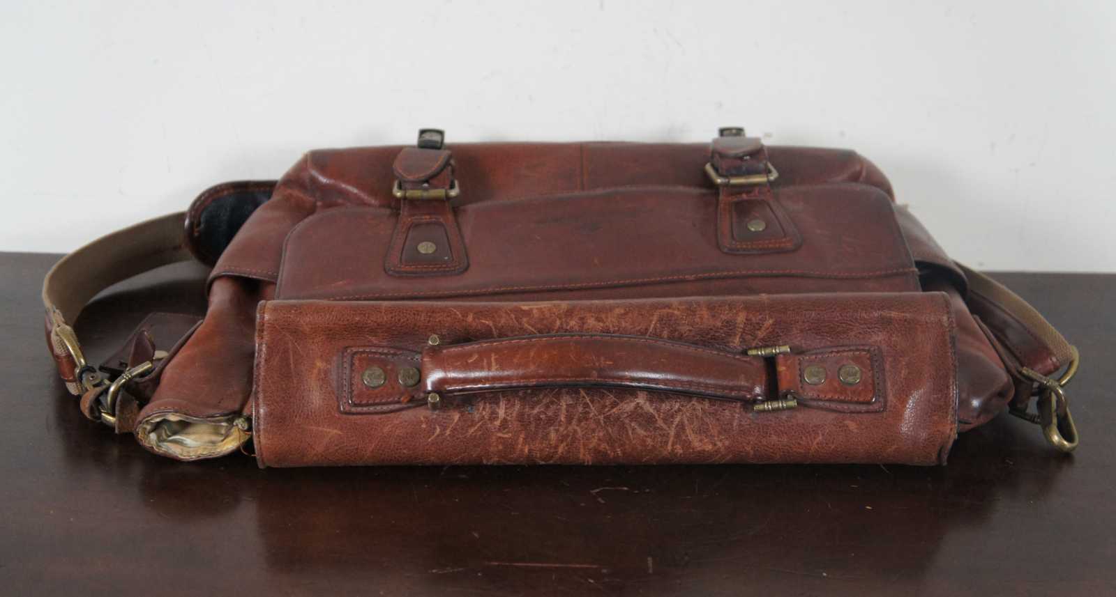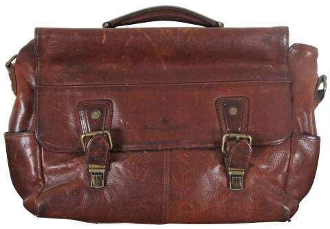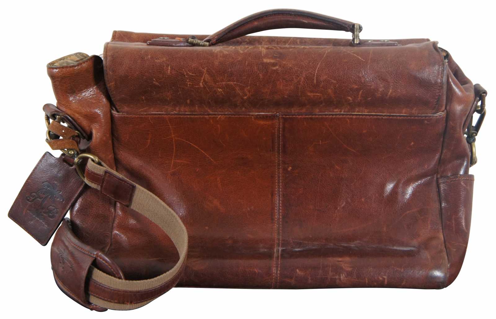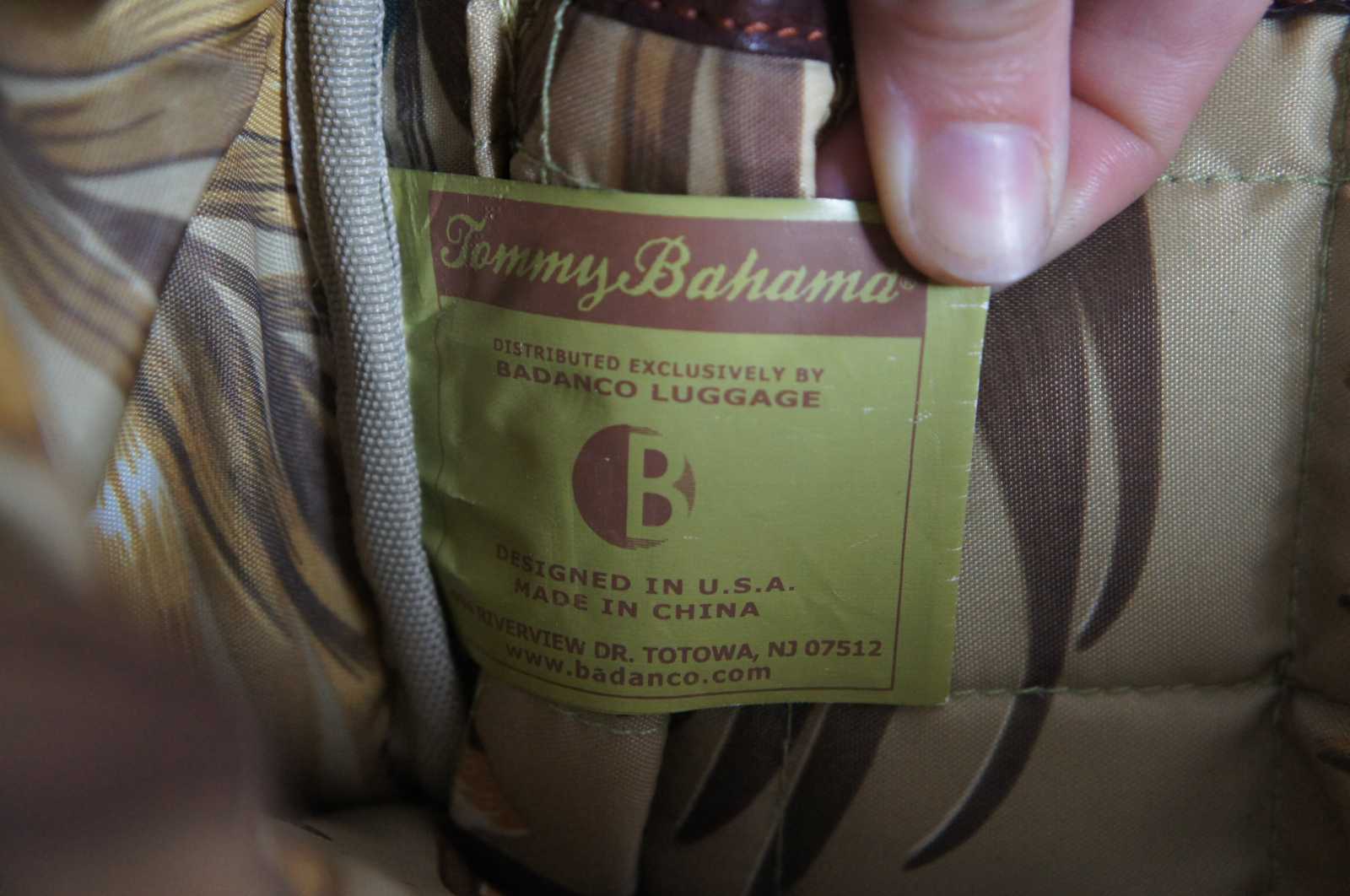 Tommy Bahama for Badanco Luggage brown leather shoulder bag with padded section for laptop computer, assorted card and pen pockets inside, two side pockets, and included luggage tag.