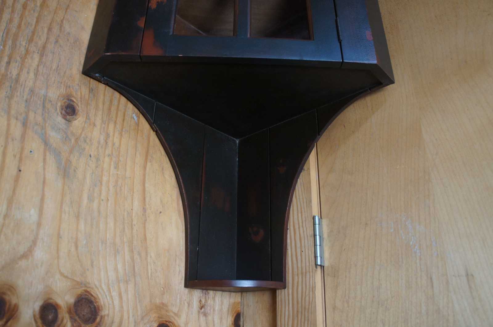 Late 20th century J.L. Terharn corner cabinet and hanging cupboard. Made from maple with a naturally distressed black finish over reddish brown. Features a hanging cupboard with glass front and plate groovese over a lower corner cabinet with drawer.