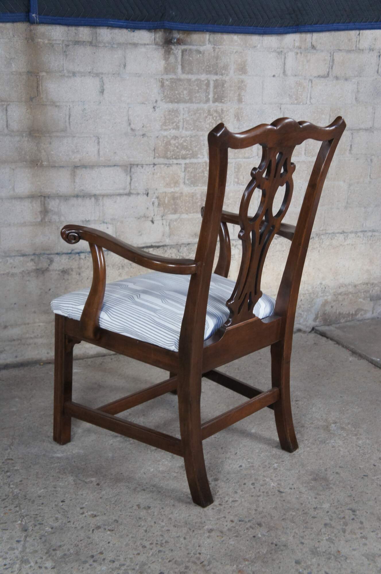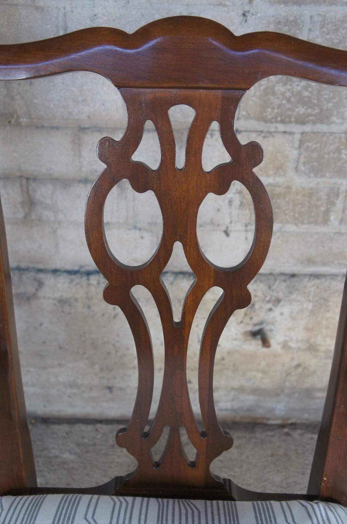 Ethan Allen Splat Back Chippendale Chair, 11-6060A. Part of the Georgian Court Collection. Made from cherry with a serpentine crest rail over pierced splat back and countoured arms. The chair is supported by straight legs with fluted accents. Seat is upholstered in a striped fabric. Circa 1980s