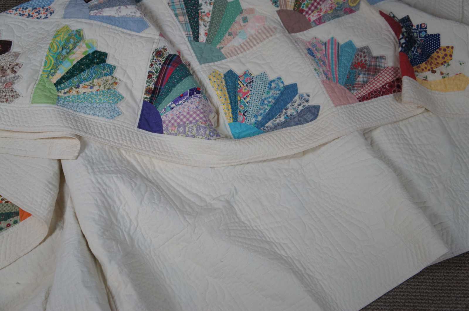 Hand quilted vintage bedspread in white cotton with a grid of patchwork fans.