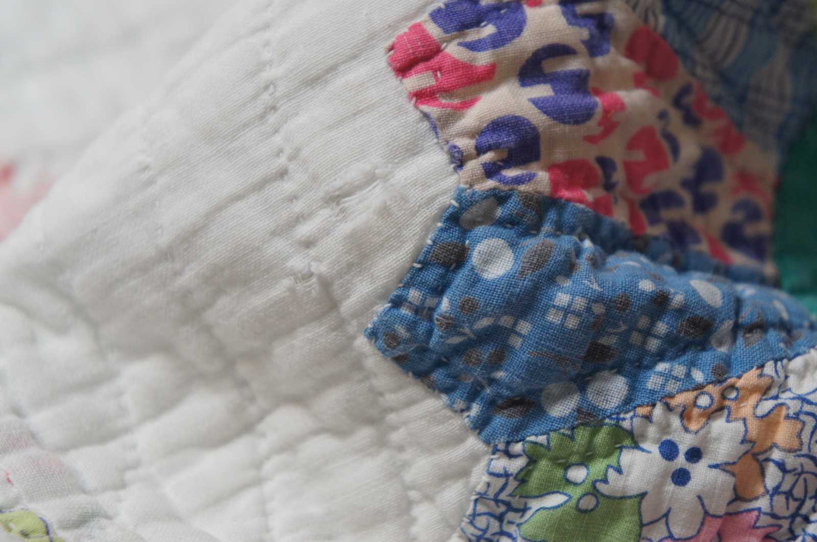 Hand quilted vintage bedspread in green and white with a scalloped edge and decorated with tumbling patchwork fans.