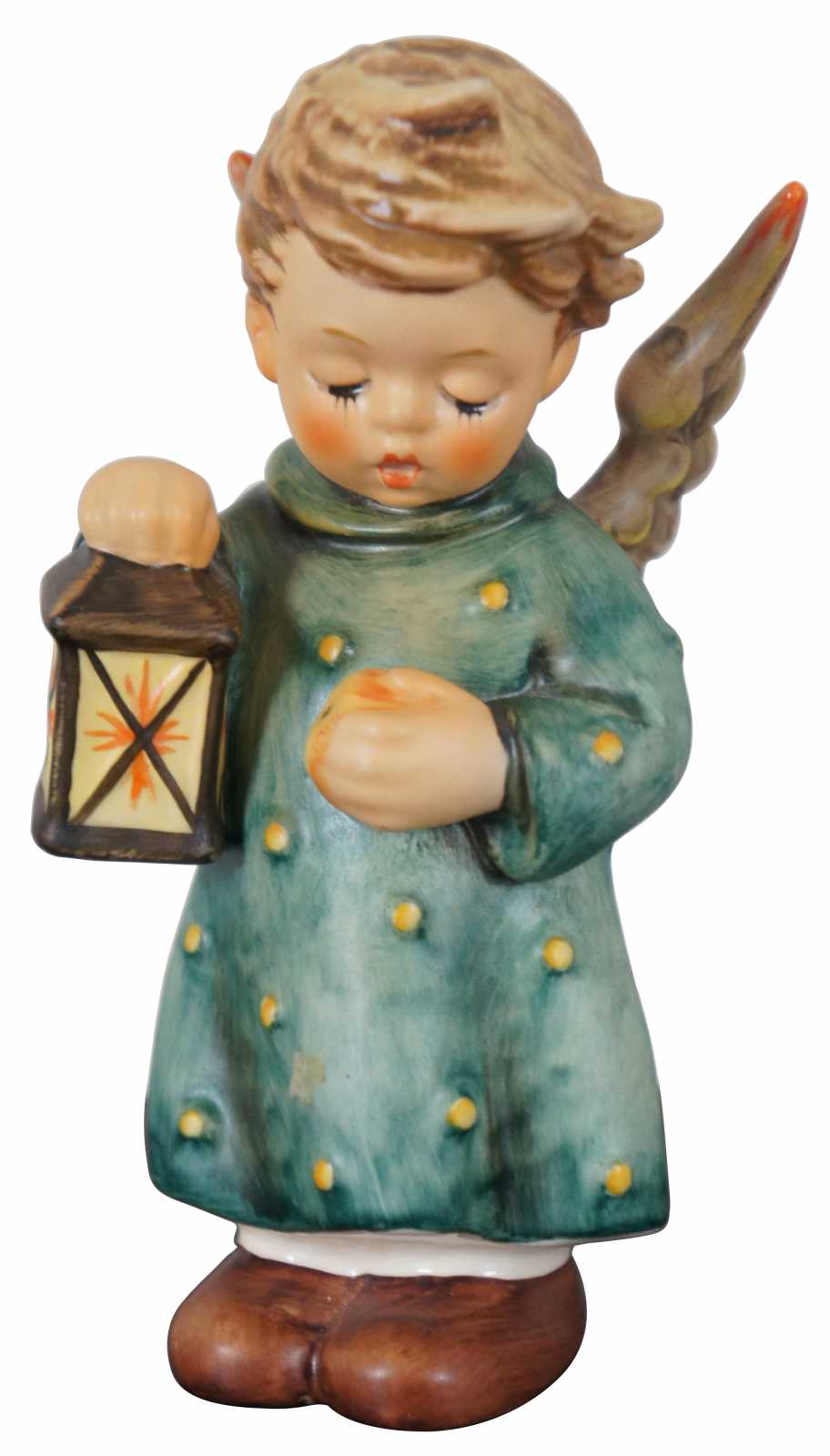 Set of four 1970s-1990s Goebel Hummel figurines: 378 Easter Greetings, 260D Goodnight Angel, 57/0 Chick Girl, and BH18 Holiday Harmony.