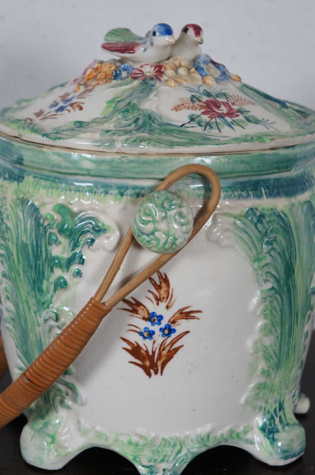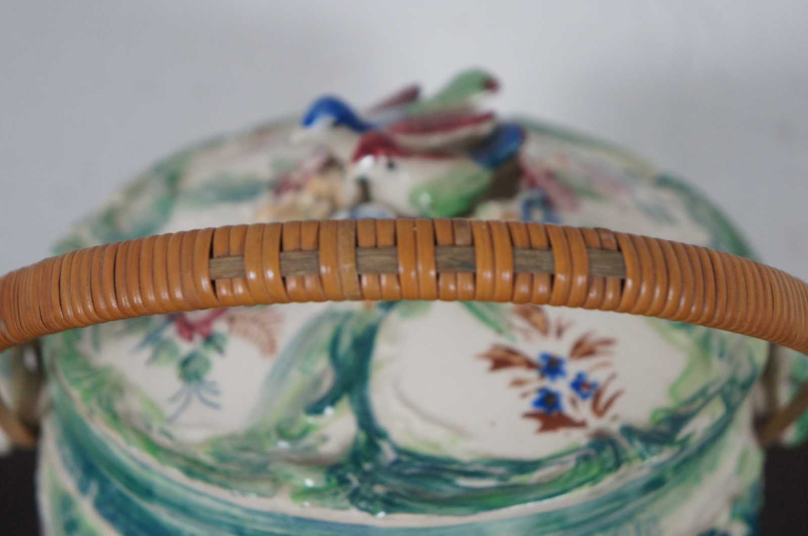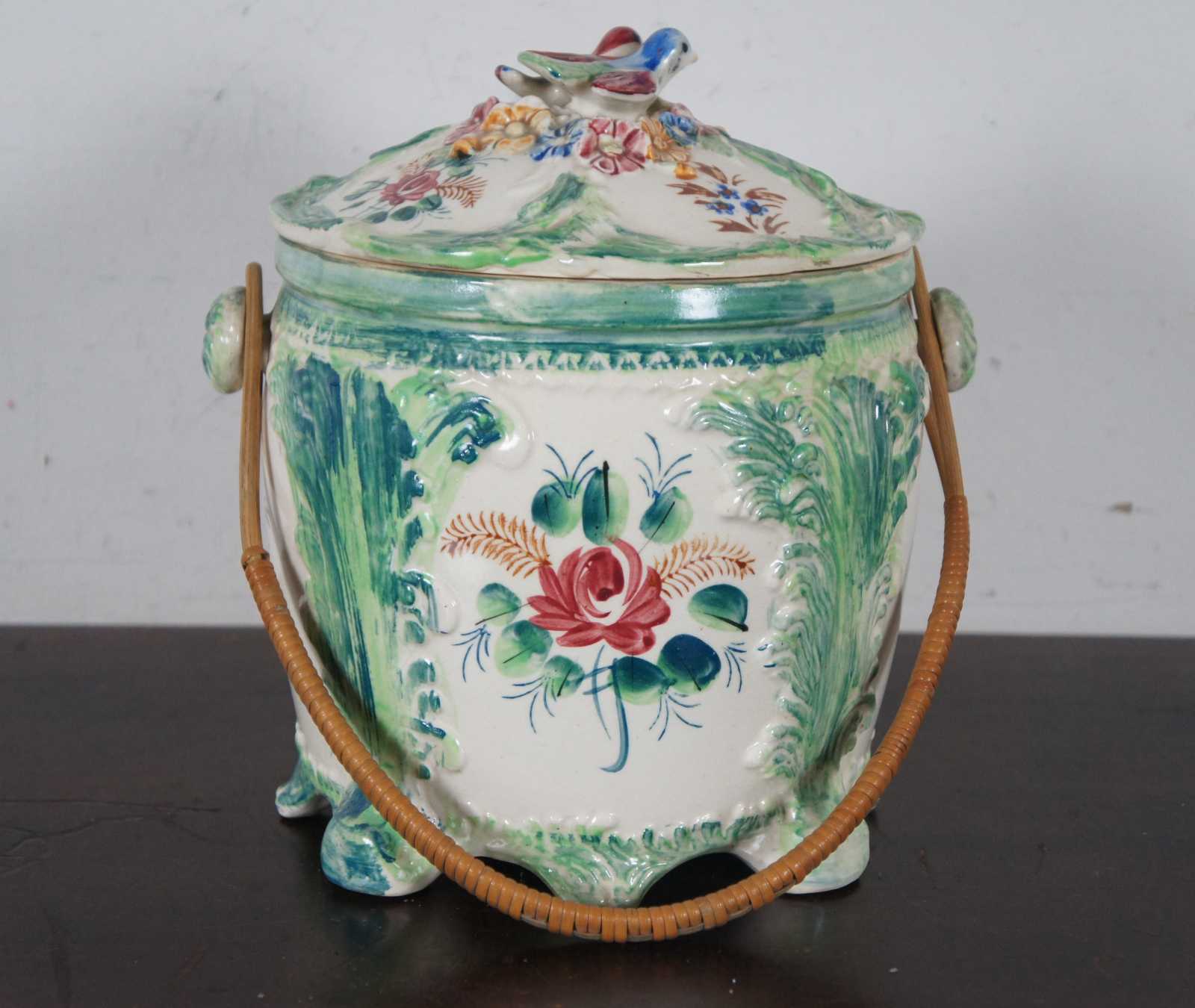 Vintage made in Japan, hand painted porcelain cookie or biscuit jar painted with leaves and flowers, topped with a pair of love birds, and a rattan wicker handle.