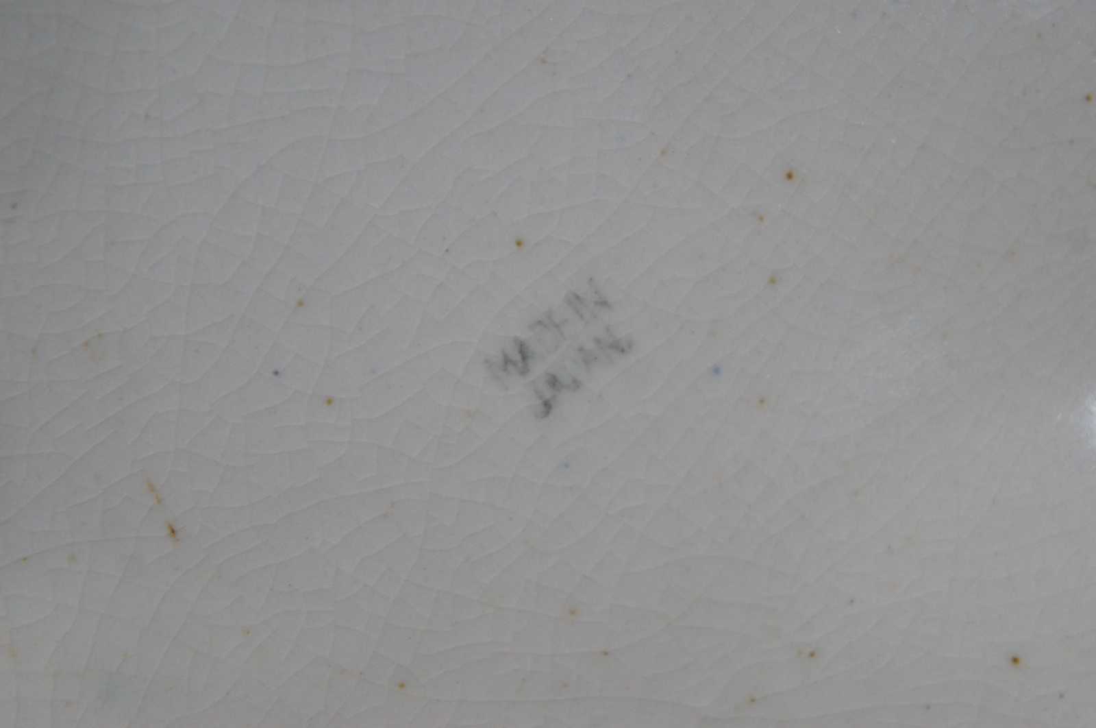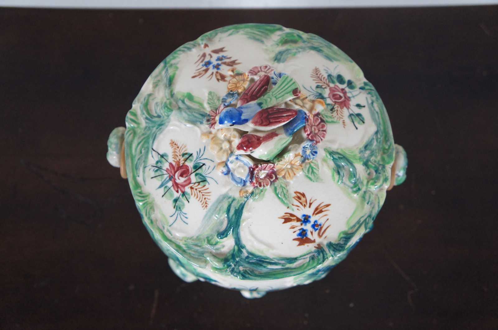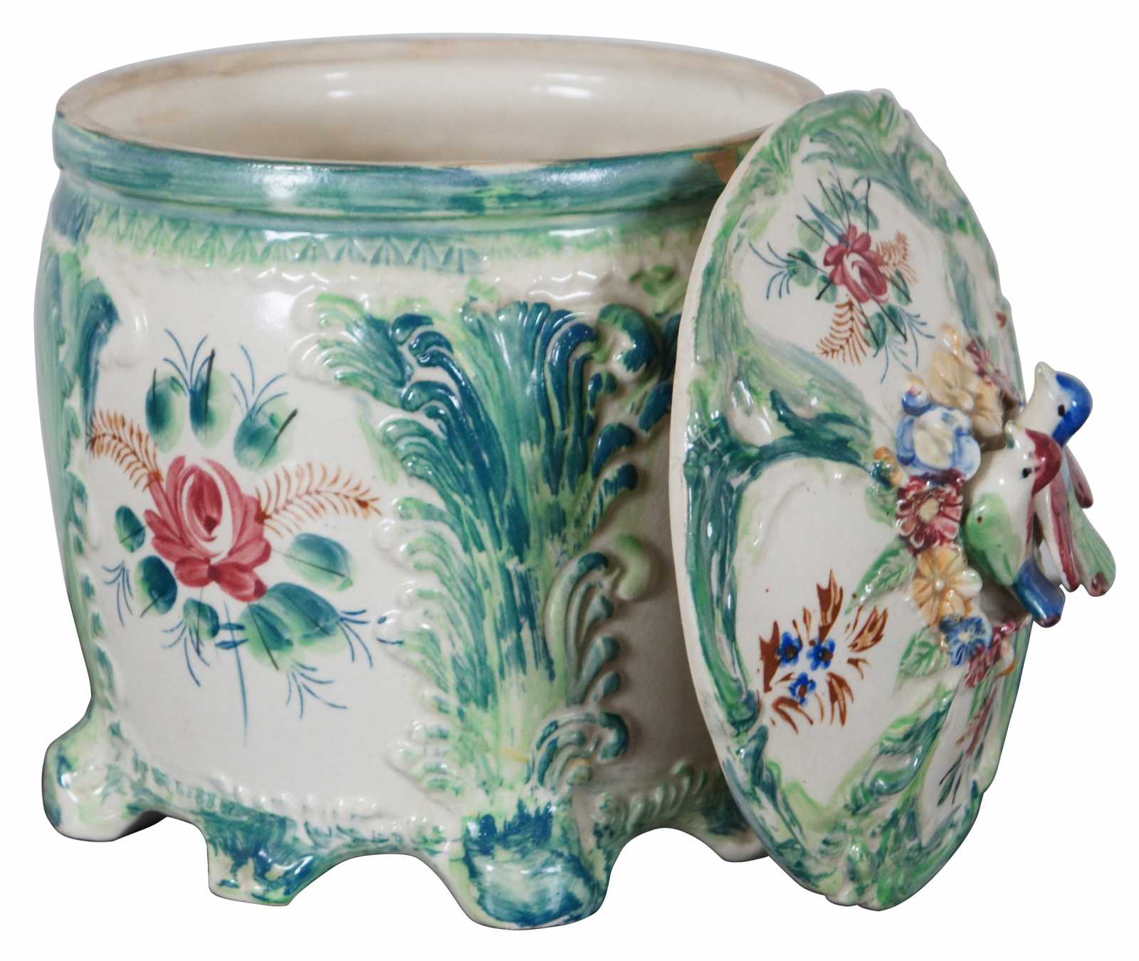 Vintage made in Japan, hand painted porcelain cookie or biscuit jar painted with leaves and flowers, topped with a pair of love birds, and a rattan wicker handle.