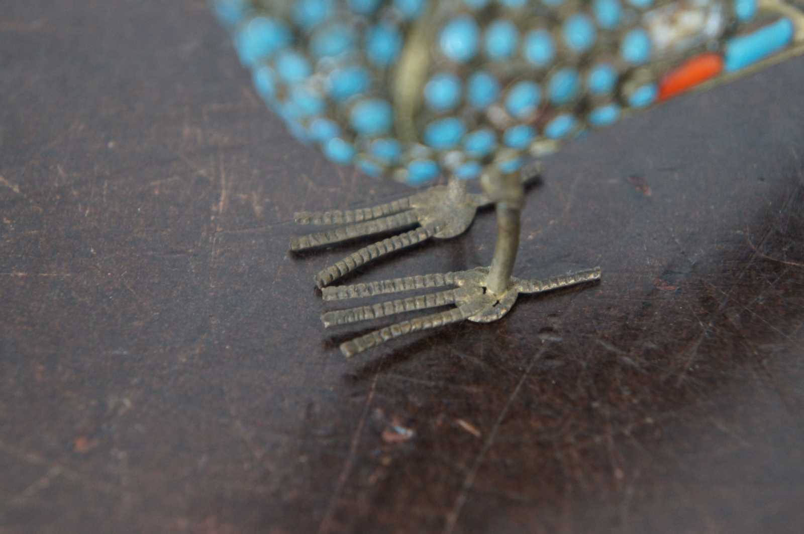 Vintage handmade Tibetan or Nepalese brass figurine in the shape of a bird with a seed in its coral beak, decorated and inlaid with red-orange coral and turquoise stones.
