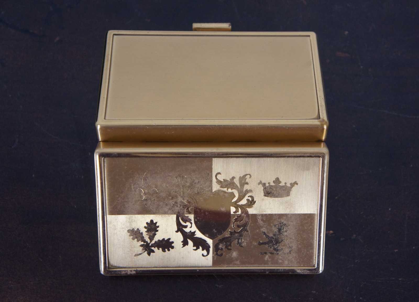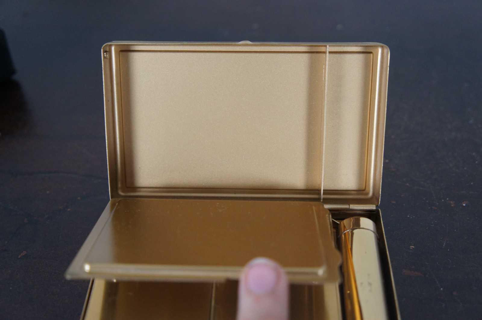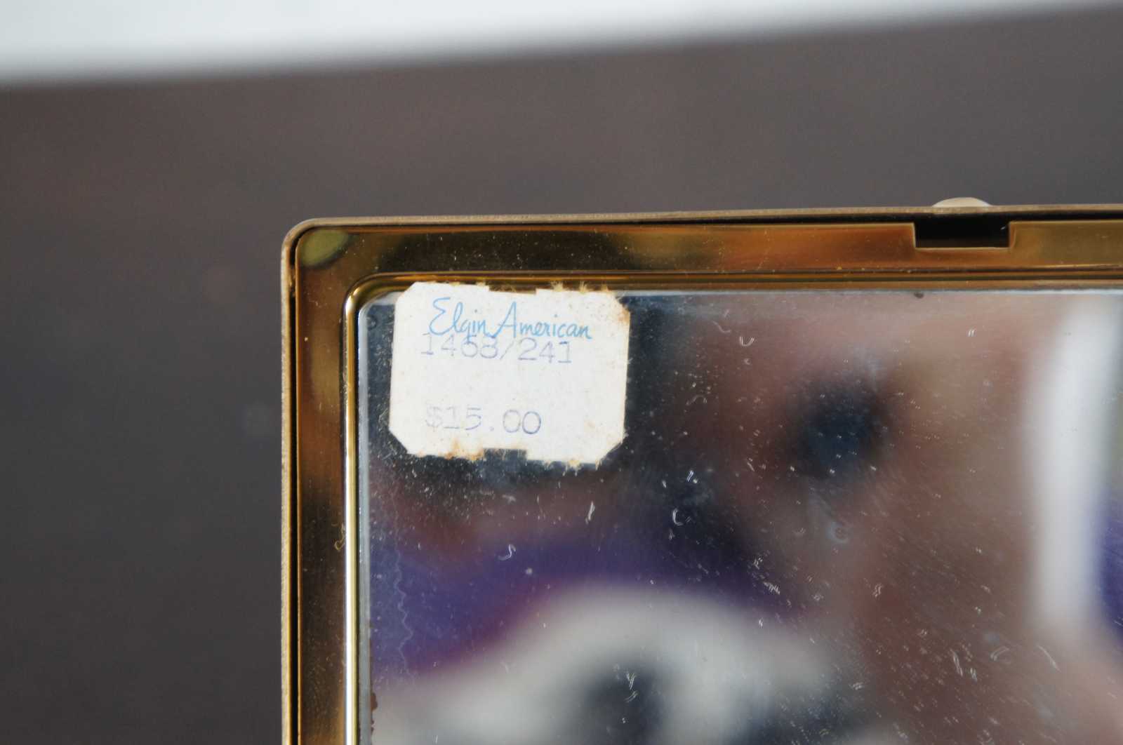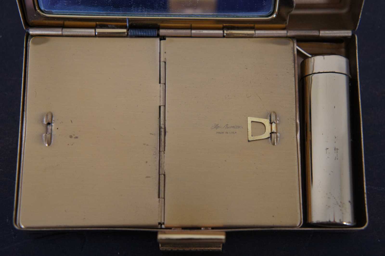 Vintage Elgin American compact make up case in brass decorated with a coat of arms, three interior compartments, powder puff, lipstick tube, and a black carrying case with bakleite comb.