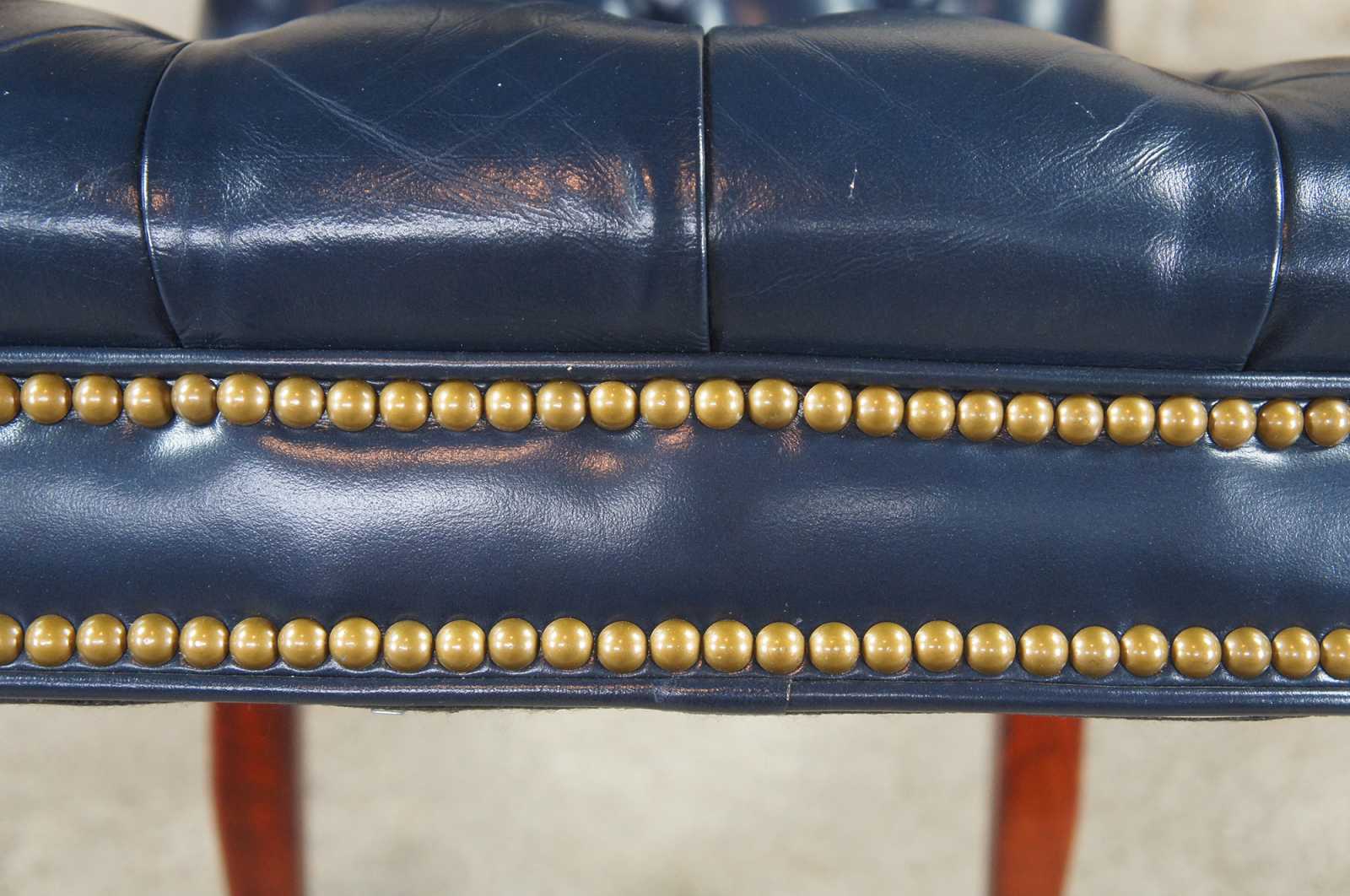 Vintage Queen Anne office or desk chair featuring tufted blue leather with gooseneck arms and nailhead trim.