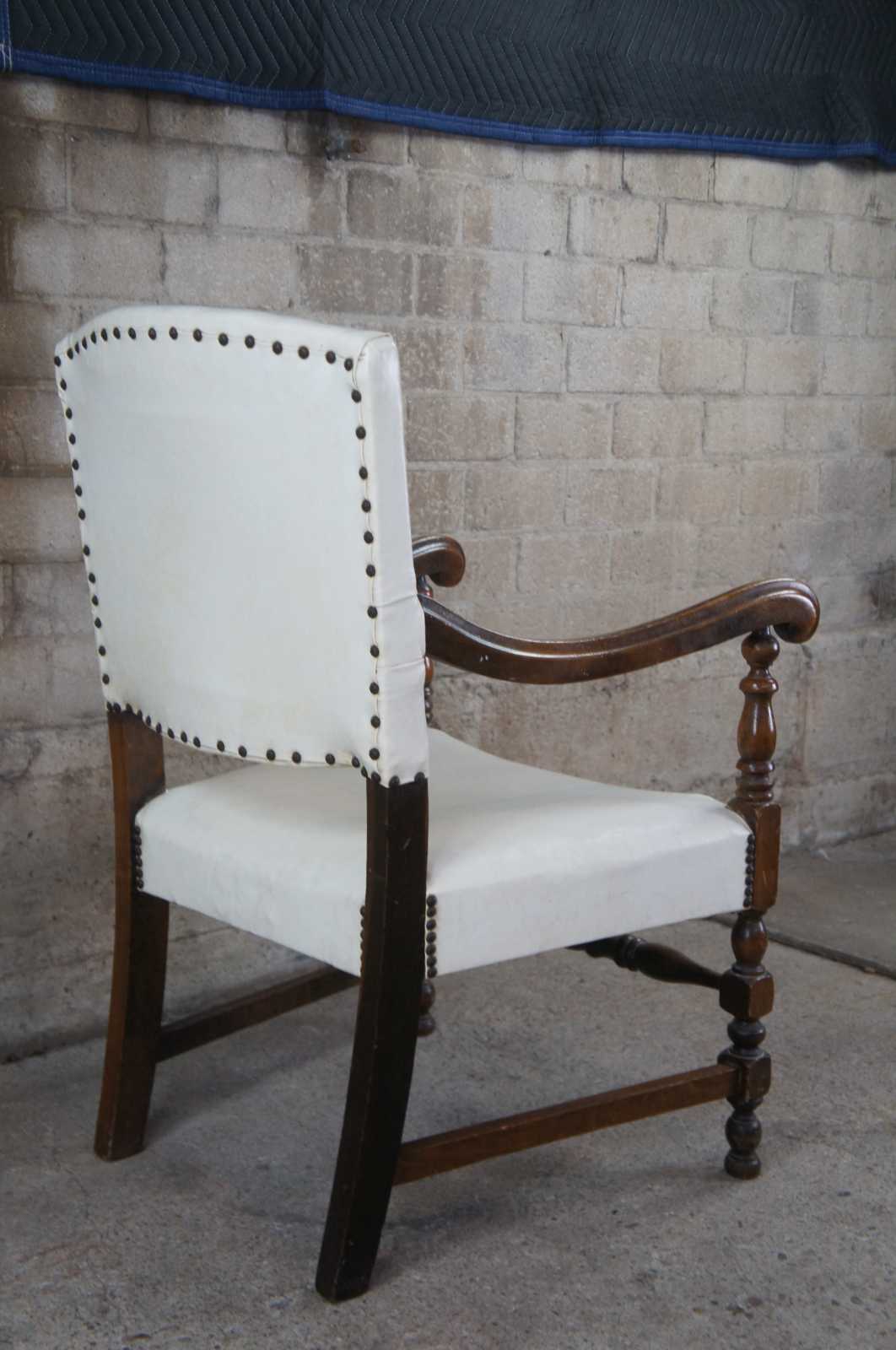 Early 20th century William and Mary arm chair. Made of mahogany featuring scrolled arms and white leather with nailhead trim.