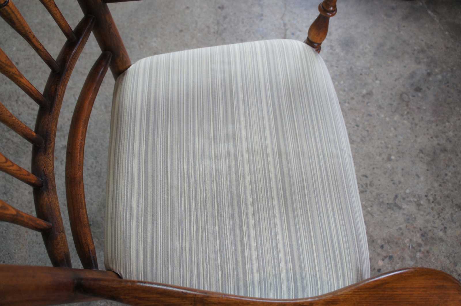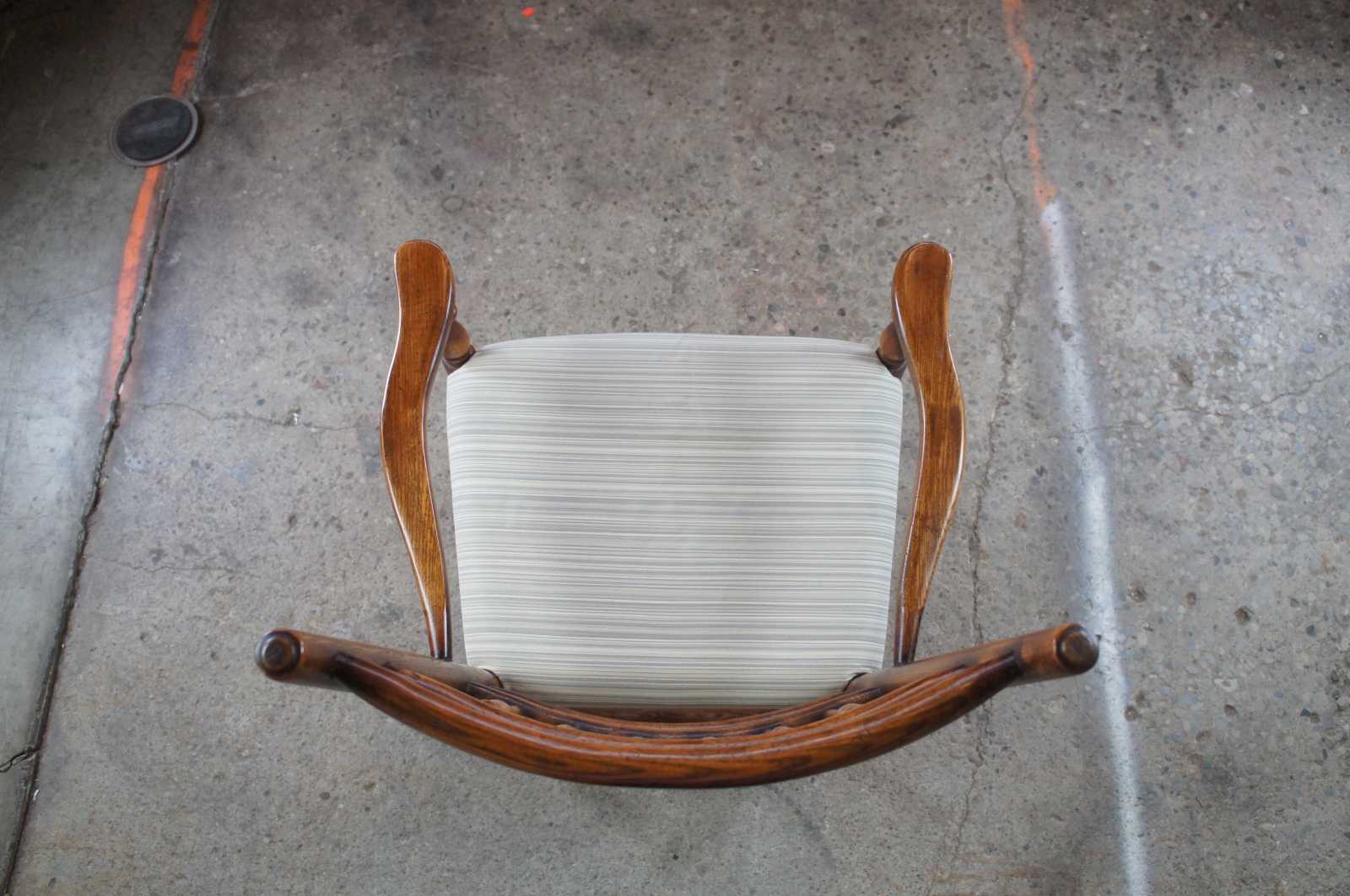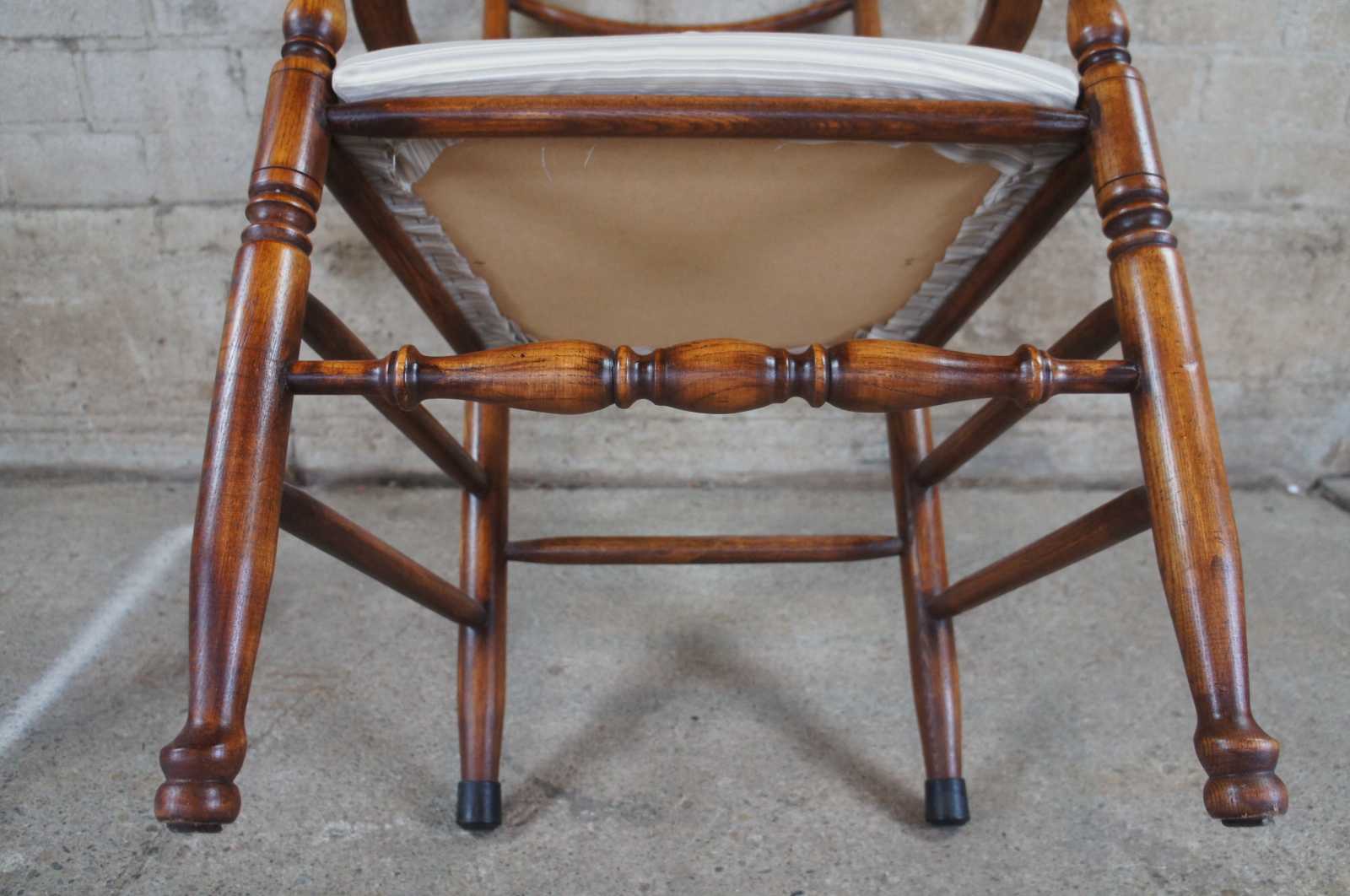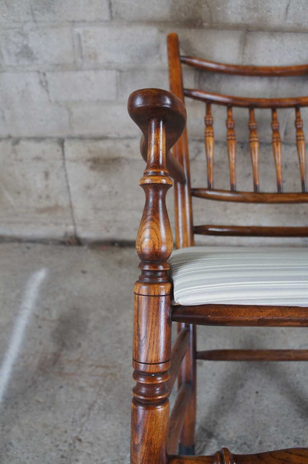 Set of four circa 1980s English Country or lancashire style arm chairs. Made of oak featuring a spindle back and turned supports.