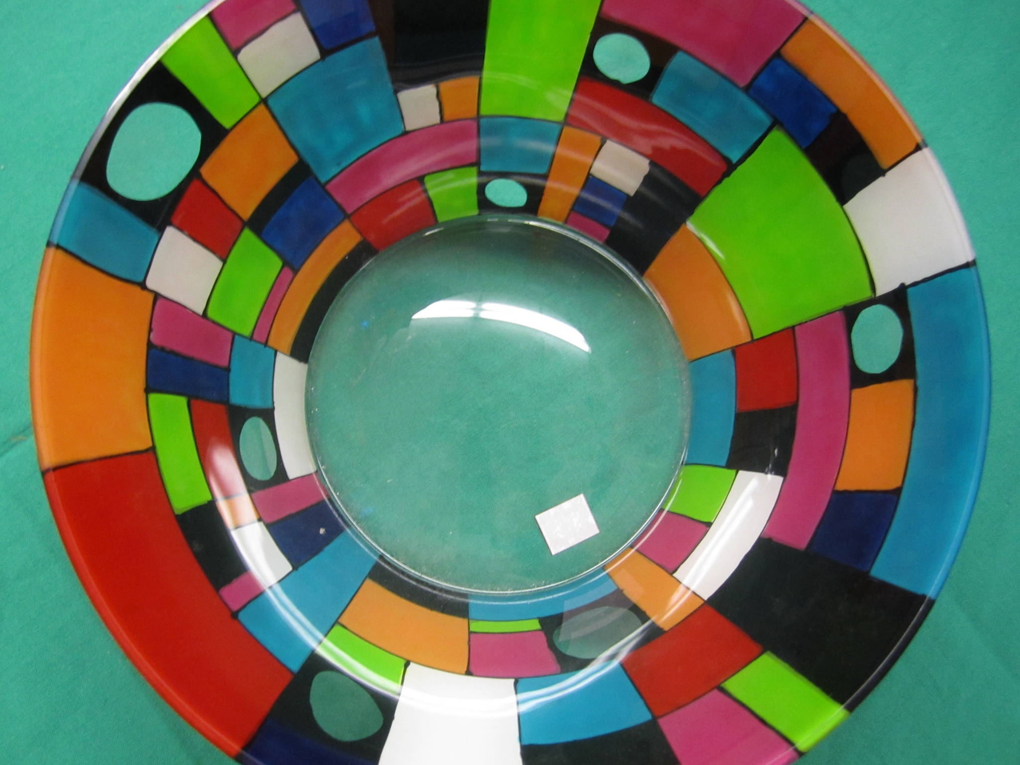 This is a really cool bowl. It is muticolored hand painted glass with a clear bottom. The bottom is cut like a magnifing glass and it magnifies things when you look through it (see pictures)! This bowl has great contemporary flair and would go great anywhere.