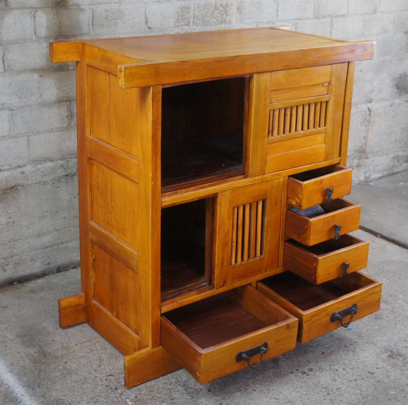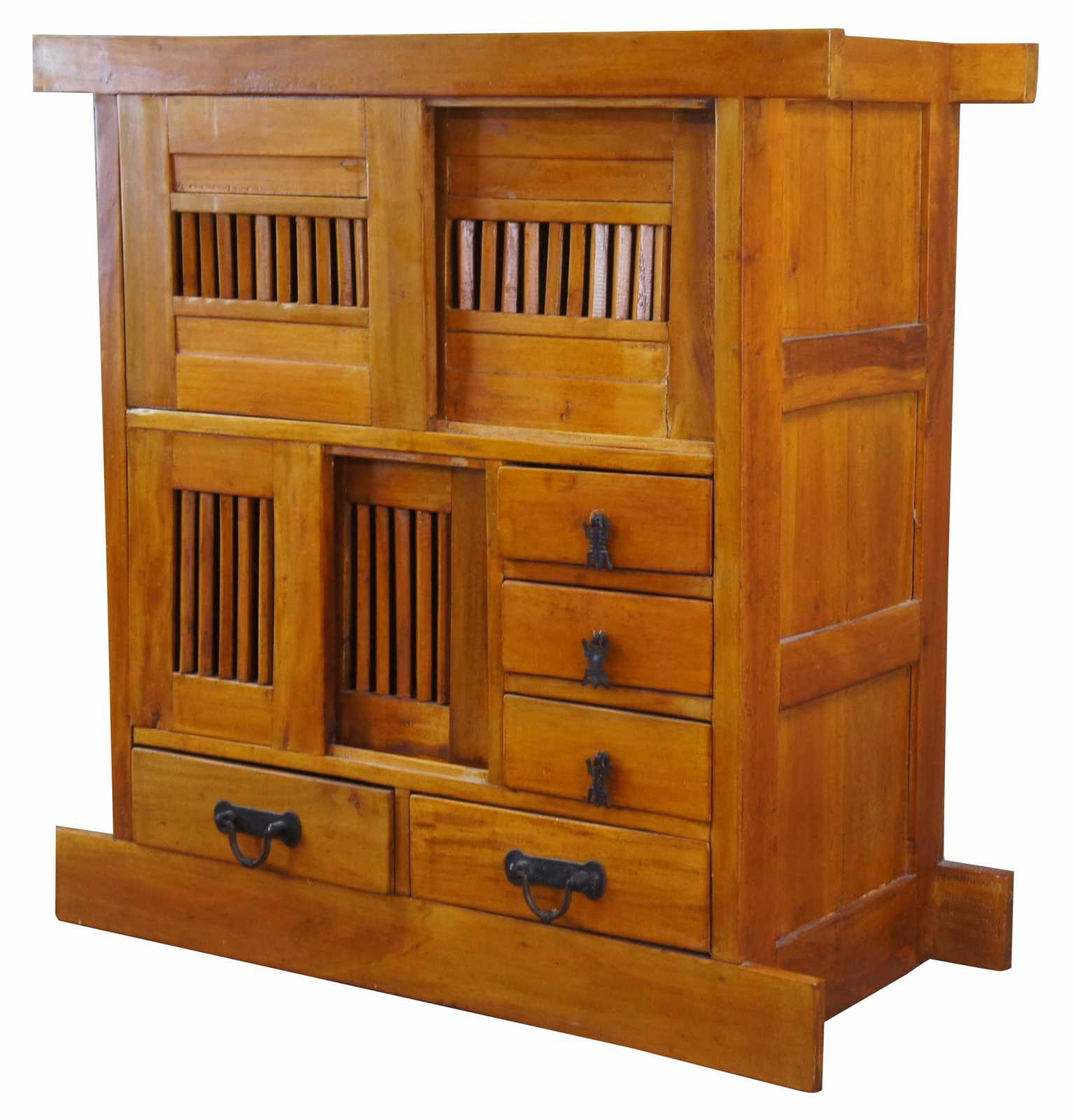 Late 20th century Tansu style cabinet. Made from birch with 2 cabinets behind pierced sliding doors over 4 drawers with iron hardware.