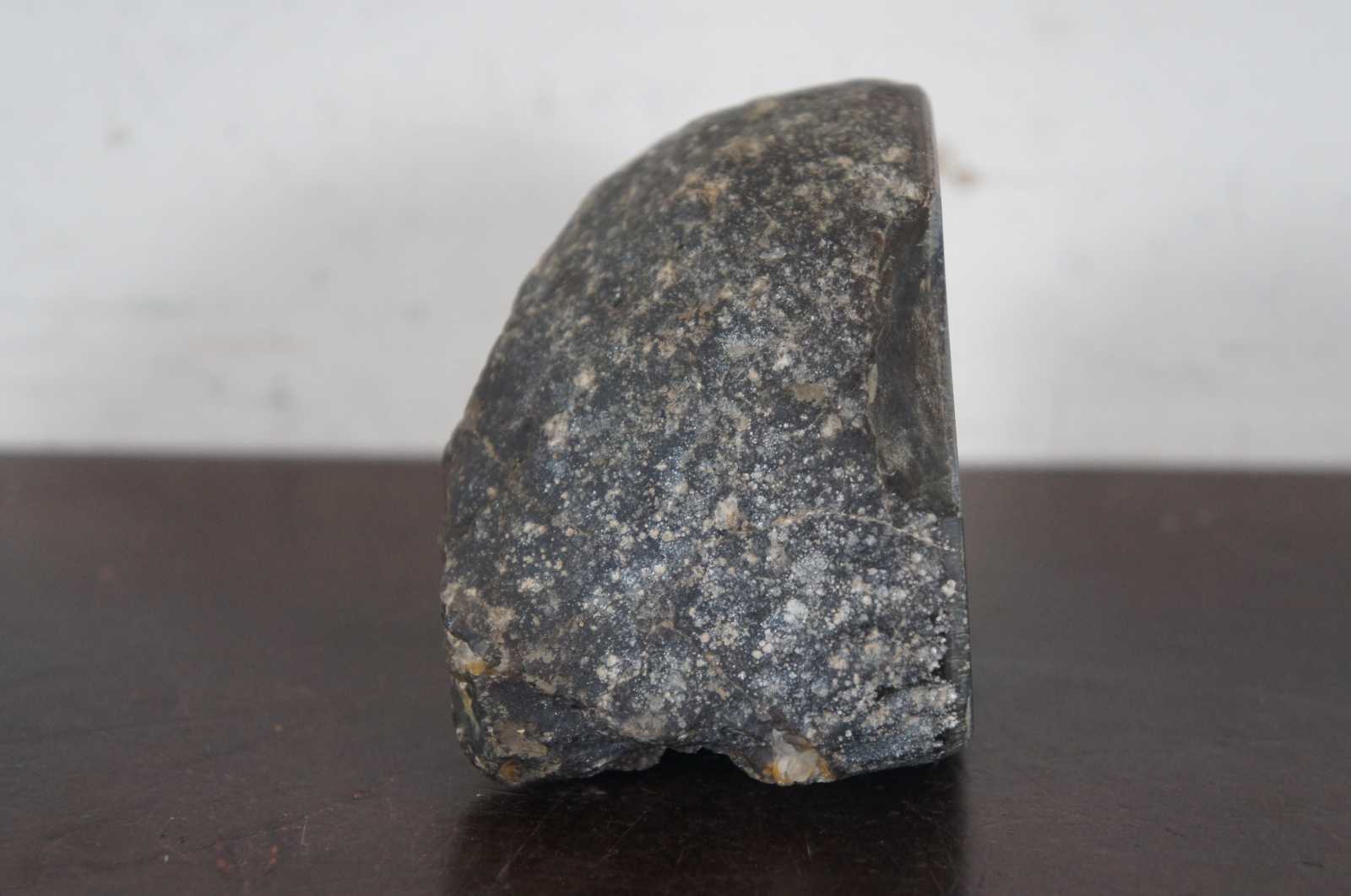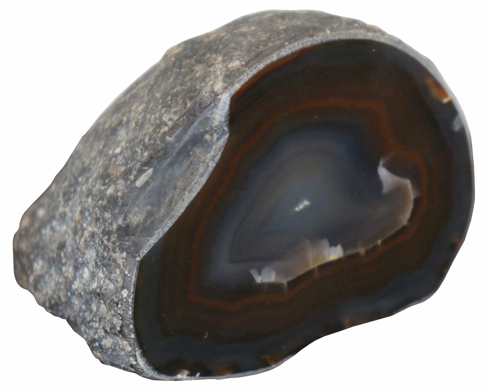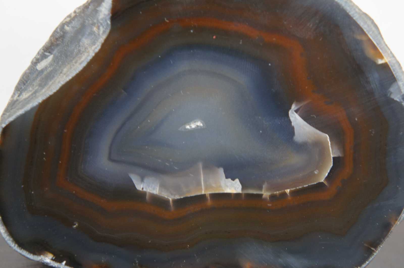 Polished half natural stone geode with alternating layers of shades of blue and rust orange.