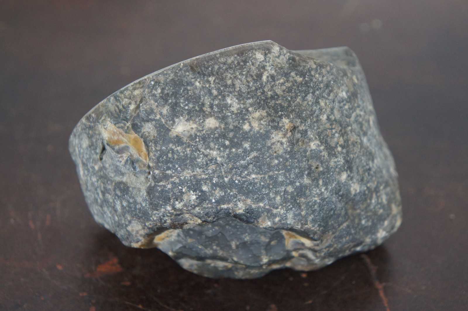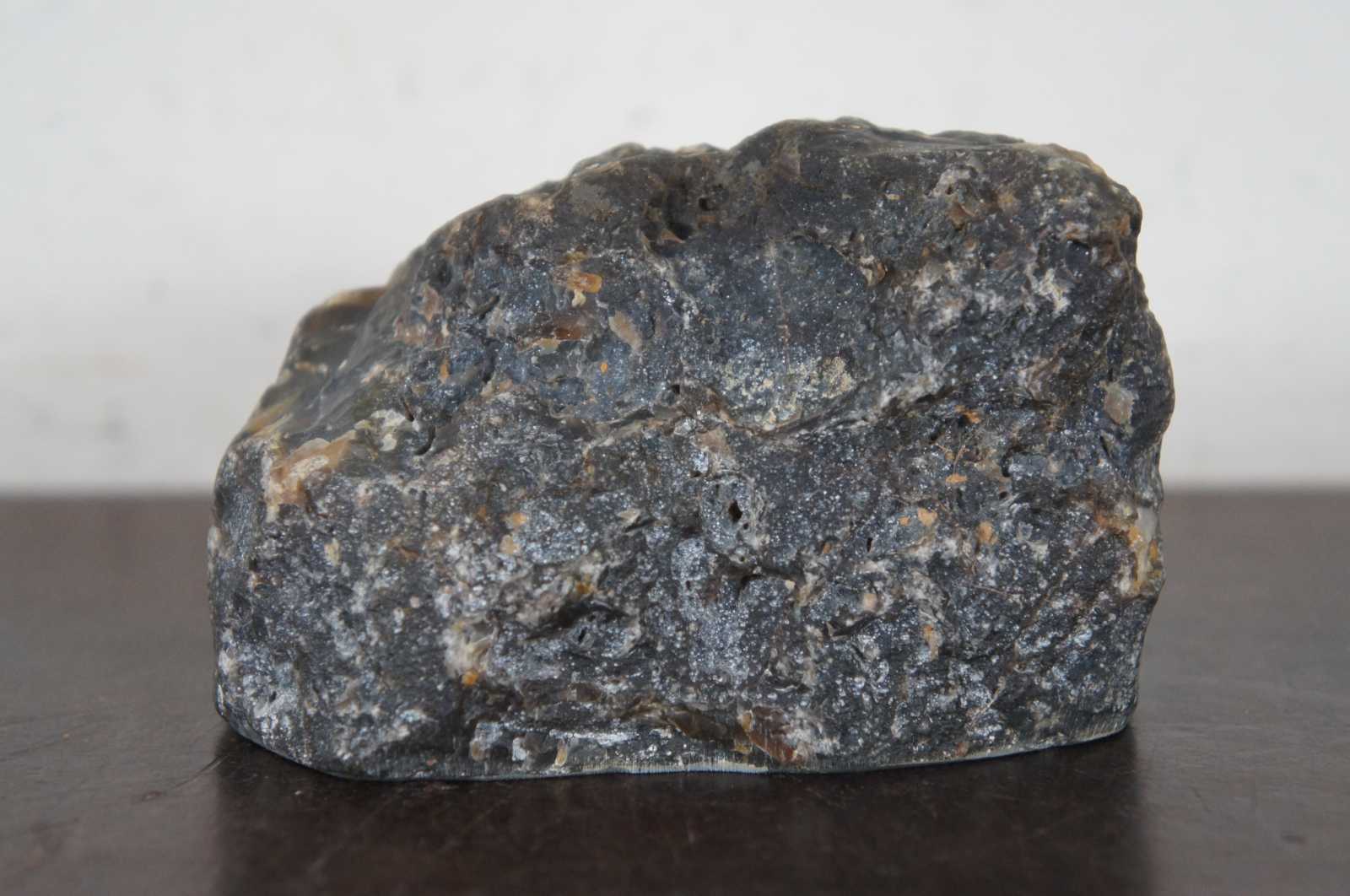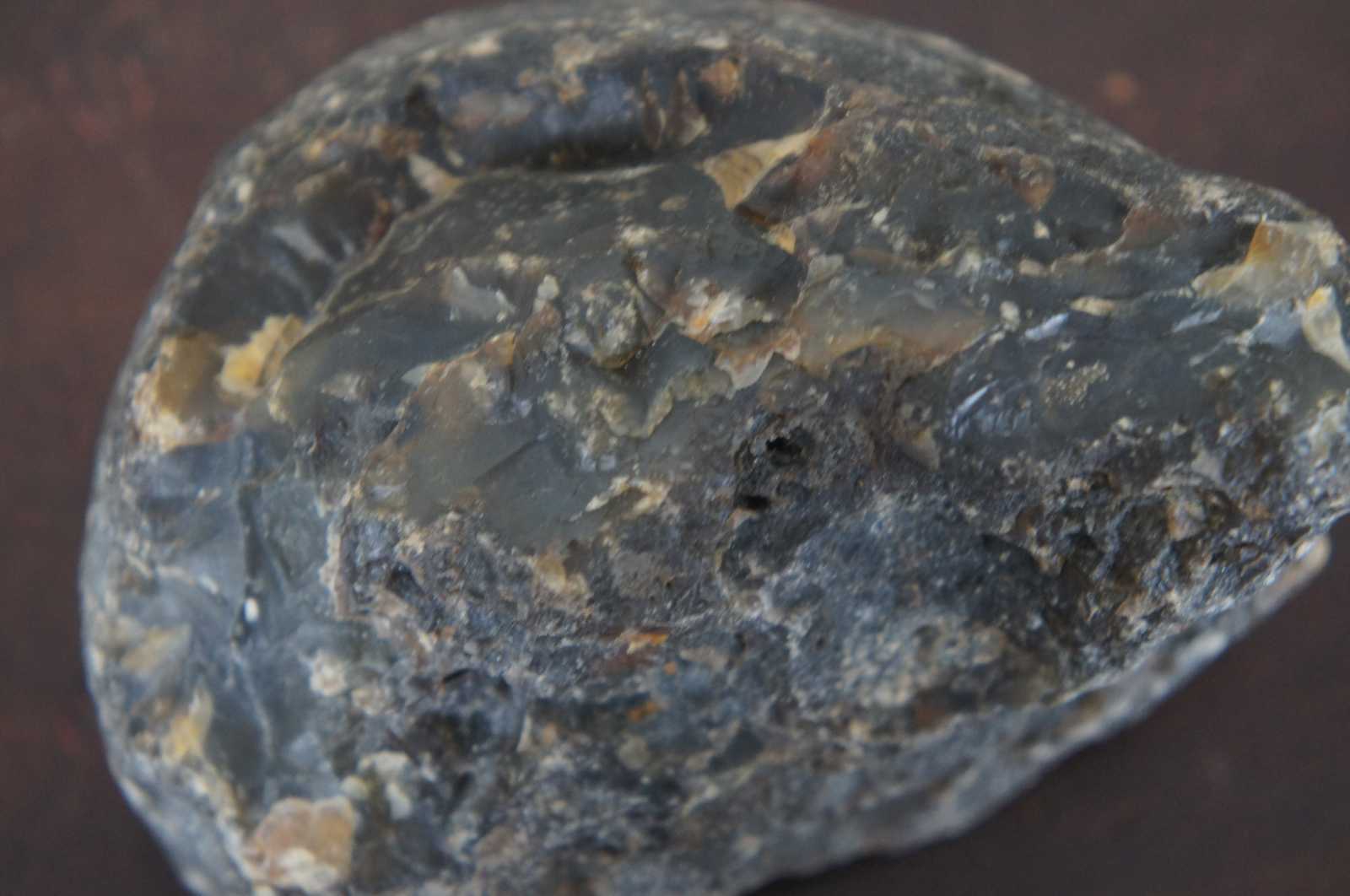 Polished half natural stone geode with alternating layers of shades of blue and rust orange.