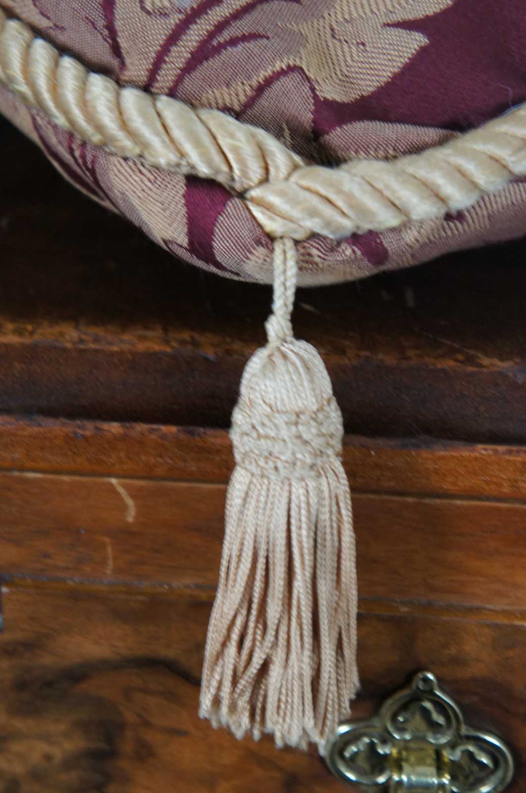 Pair of fiber filled throw pillows in red, gold, green and navy blue fabric with rope twist piping and tassels at the corners.