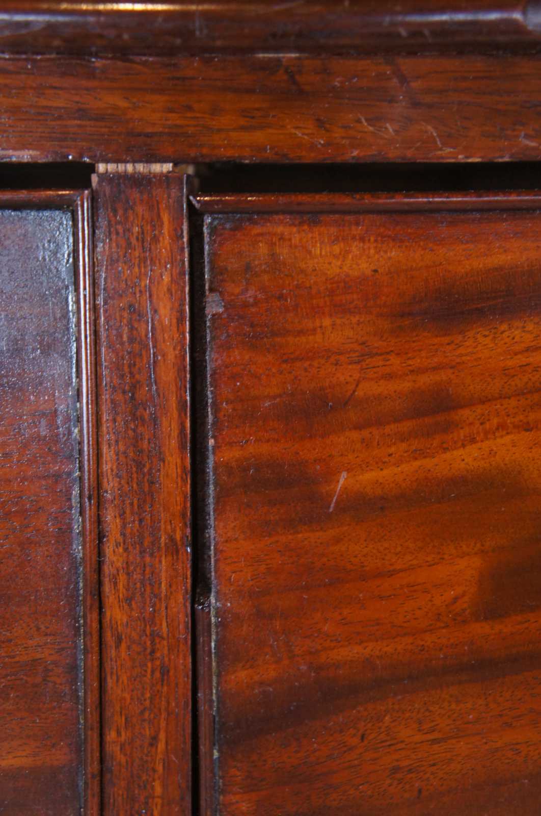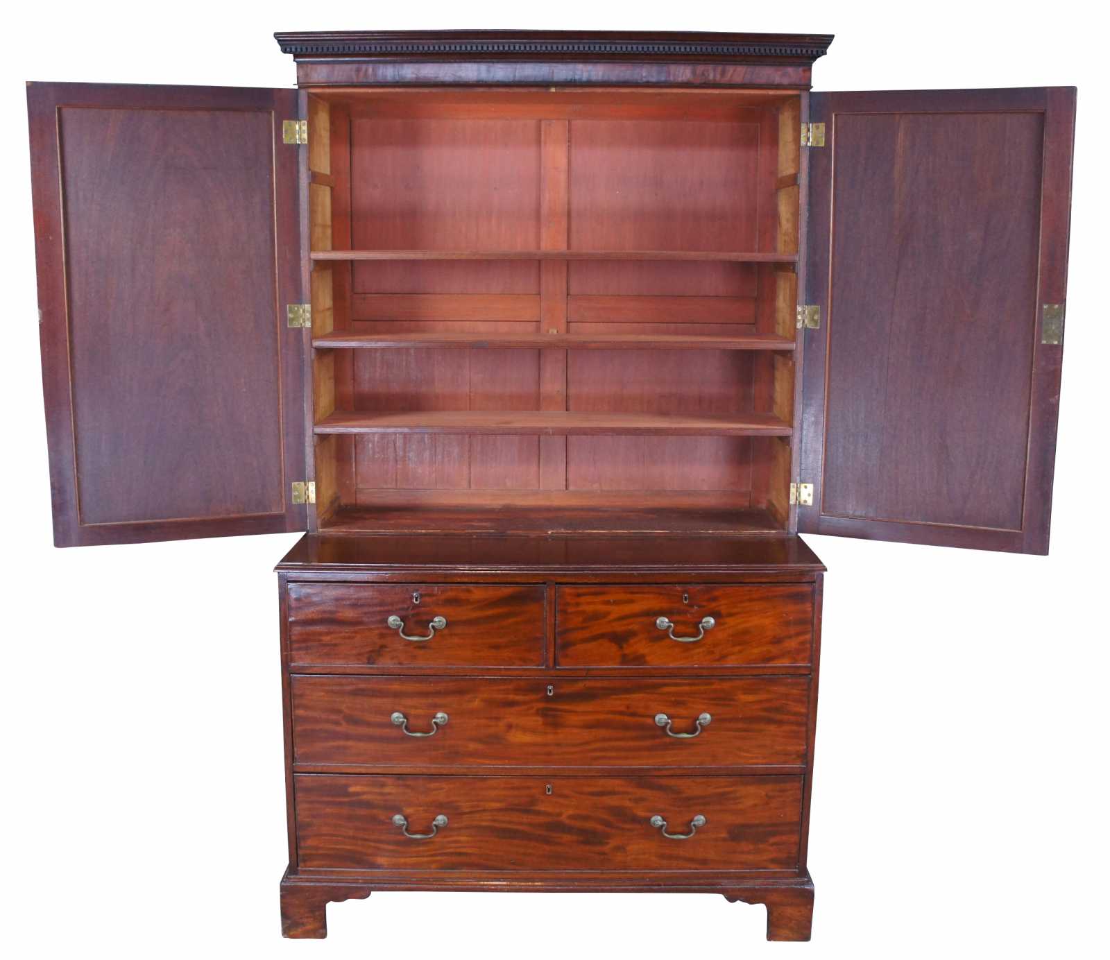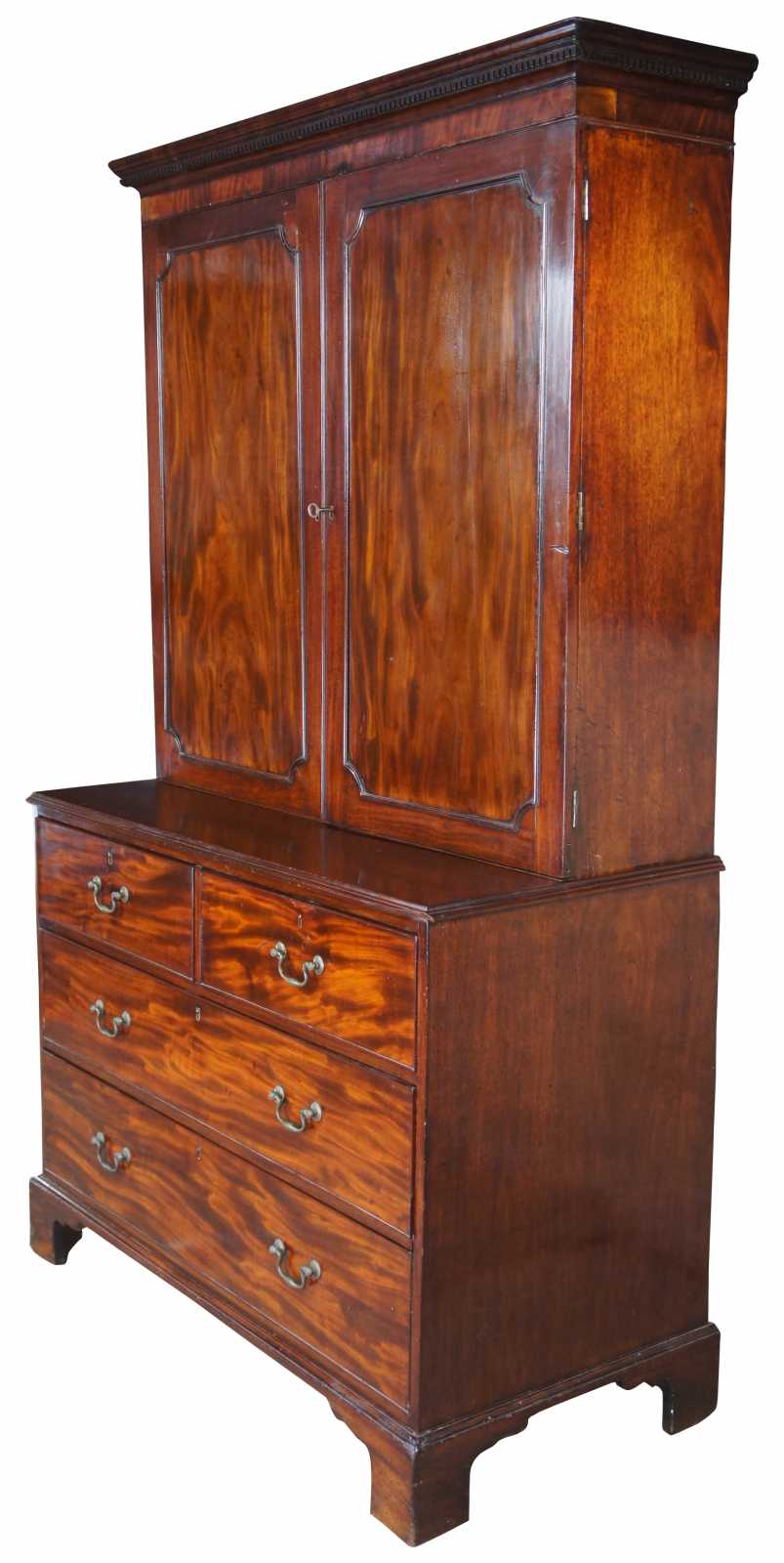 18th century George III English mahogany linen press. Rectangular form with two over three hand dovetailed drawers and stepback closet/wardrobe. Features a carved crown with ogee edge, bracket feet and brass bail hardware.