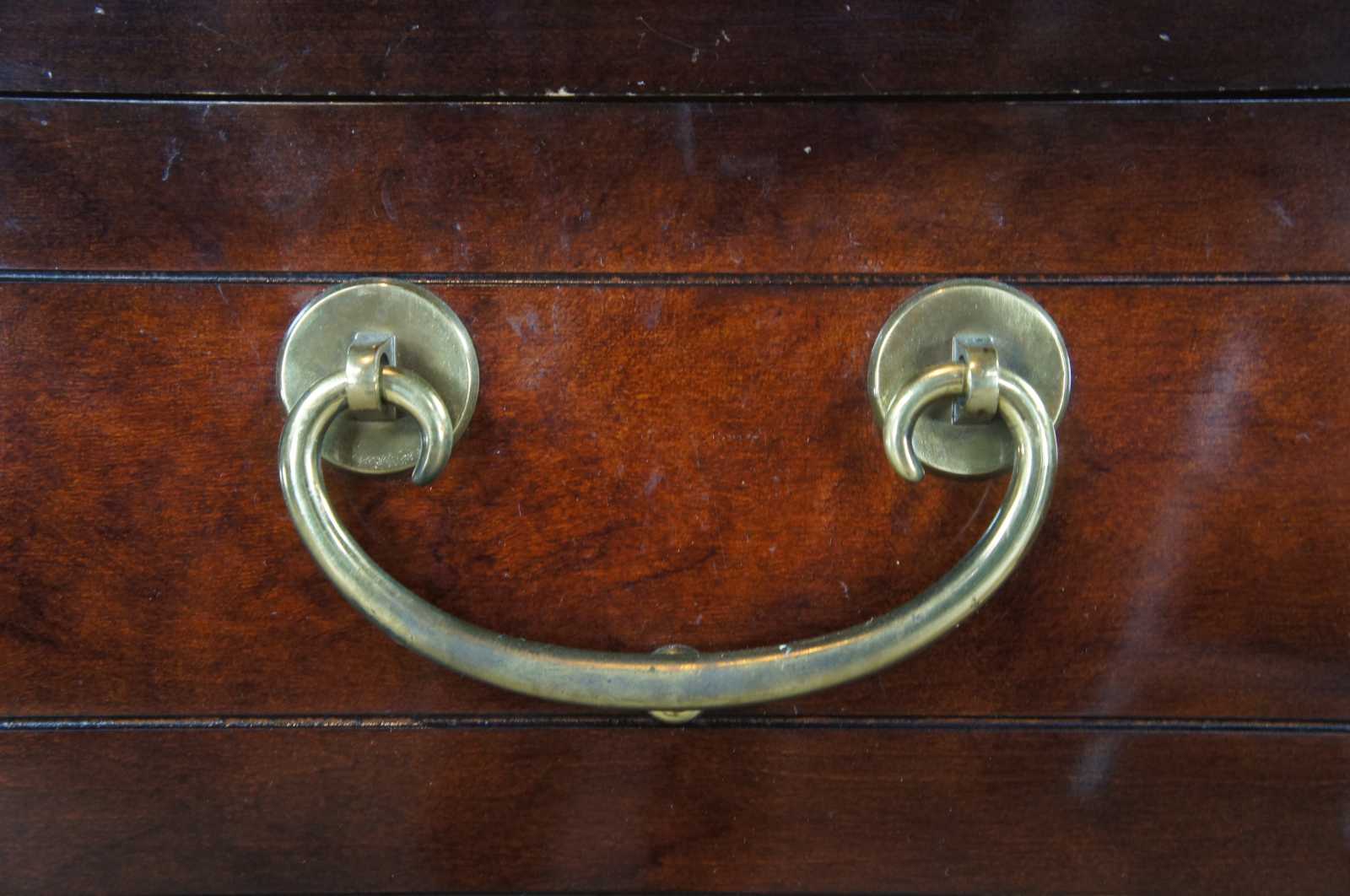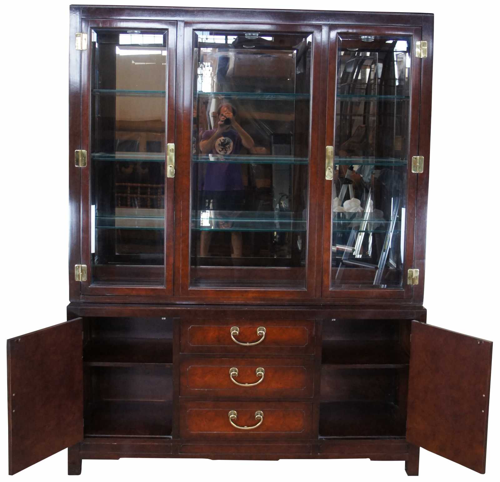 1987 White Furniture Ming Dynasty styled Mandarin China Cabinet, 330-31 Rectangular form with mahogany and burlwood paneling. Features an illumanted stepback top and brass hardware Illumination controlled by touching the of the brass hardware.