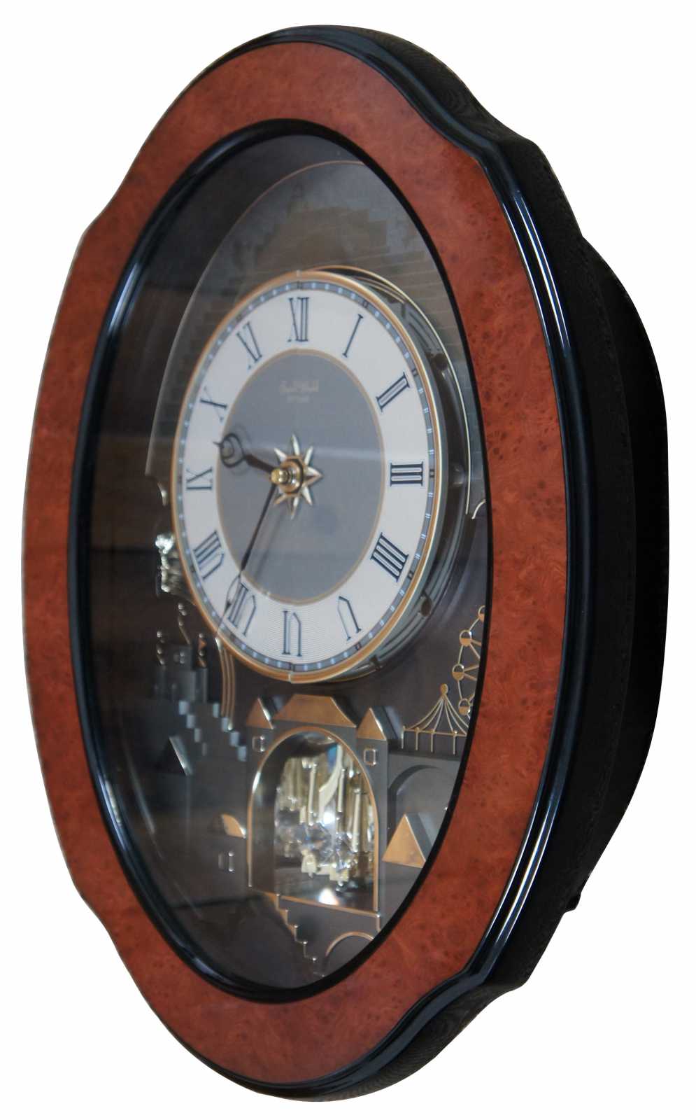 Small World battery operated musical wall clock by Rhythm, with burl wood frame, 30 different tunes, and a chrome accented carnival scene with rotating Swarovski crystals.
