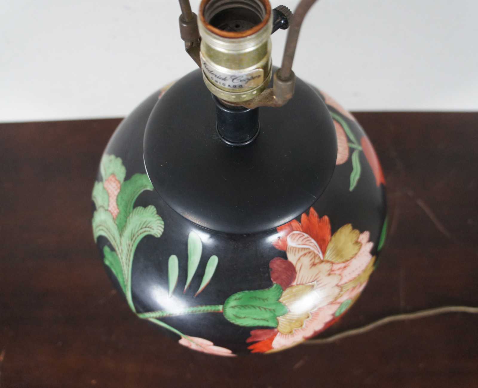 Frederick Cooper of Chicago chinoiserie porcelain ginger jar shaped table lamp with gold, red, and green flowers on a black ground. 5389.
