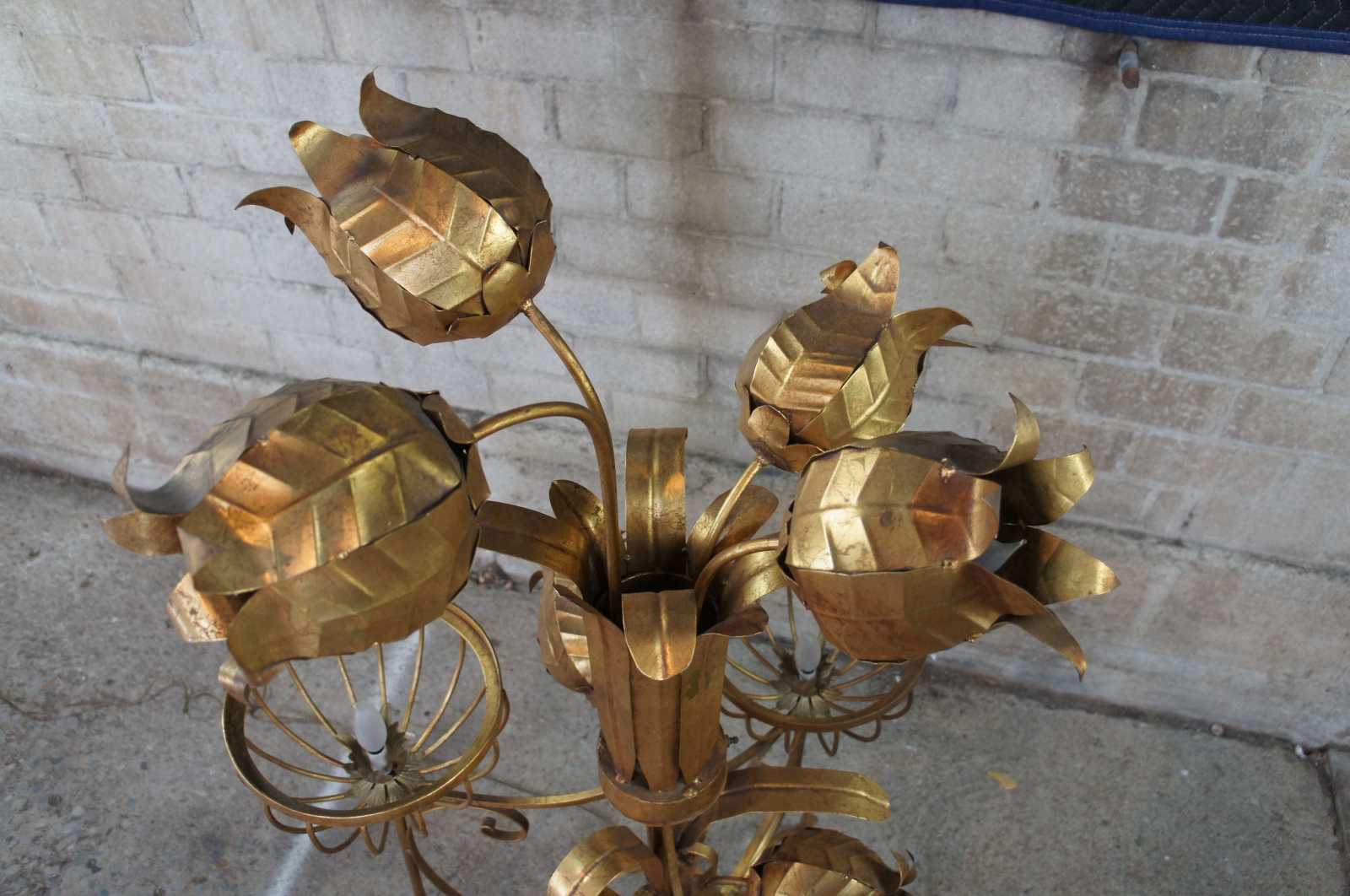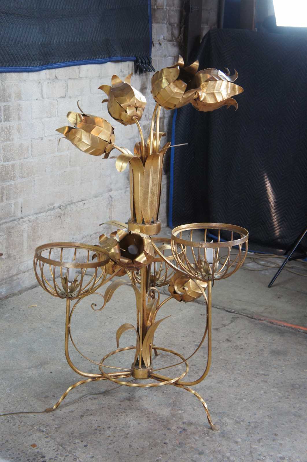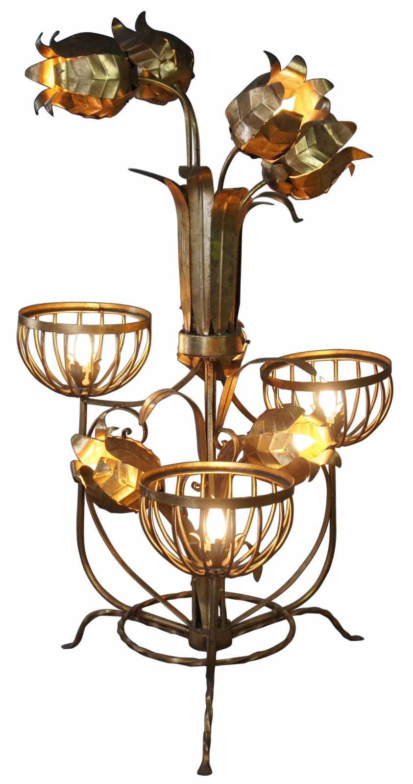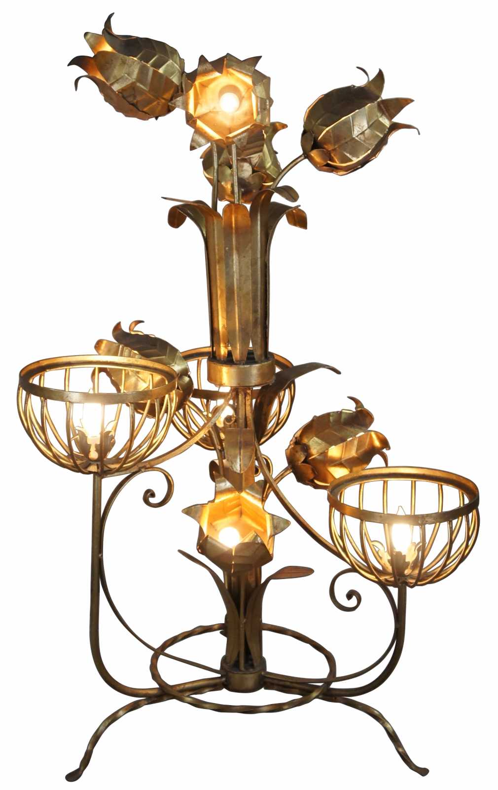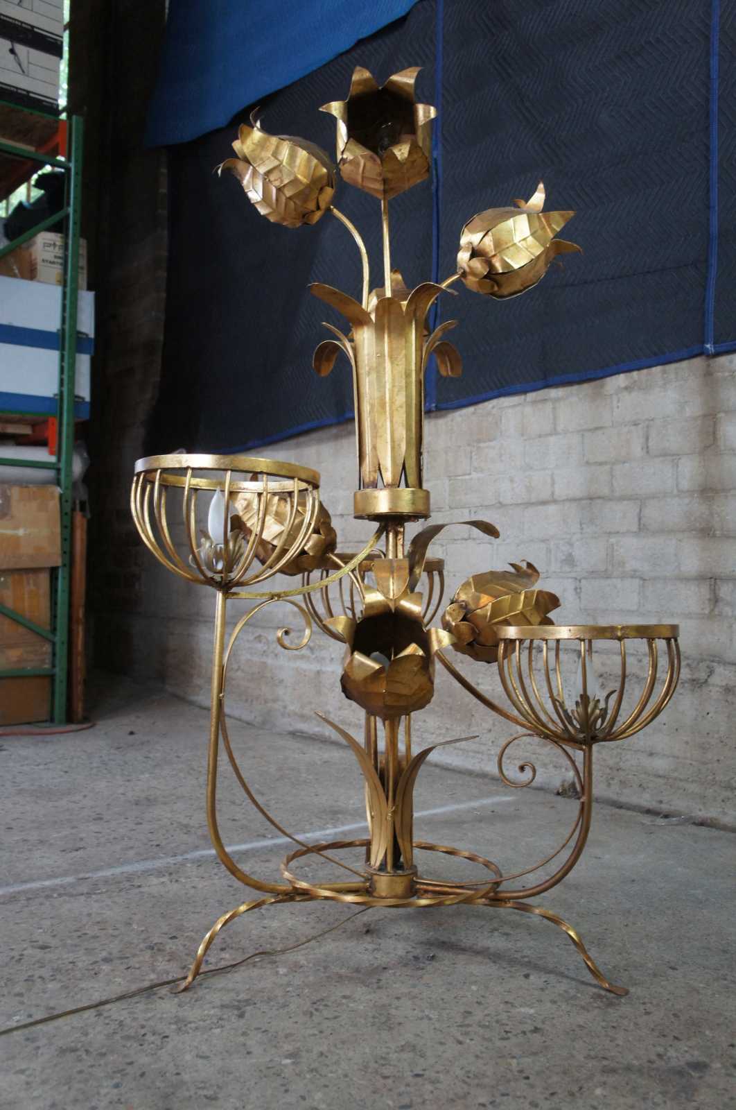 Monumental Regency style floor lamp. Made from tole and wrought iron with basket lamps and sculptural flowers over a tripod base. Includes 3 light settings.