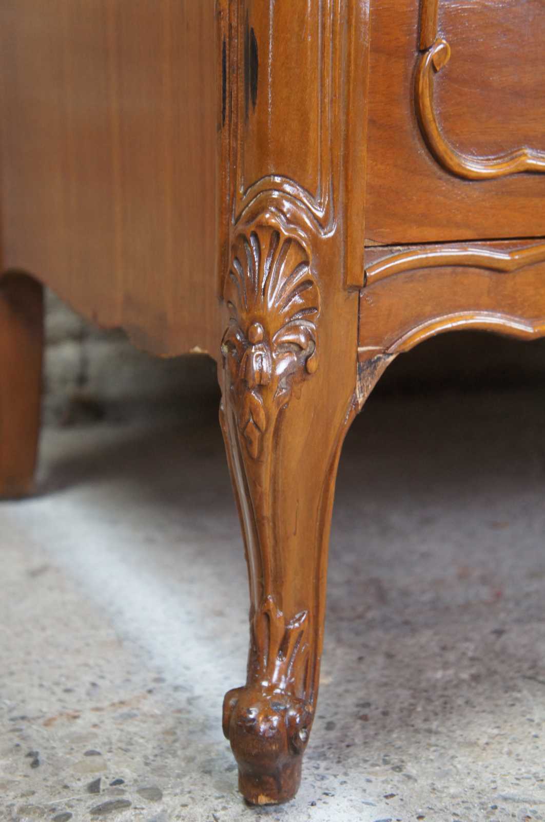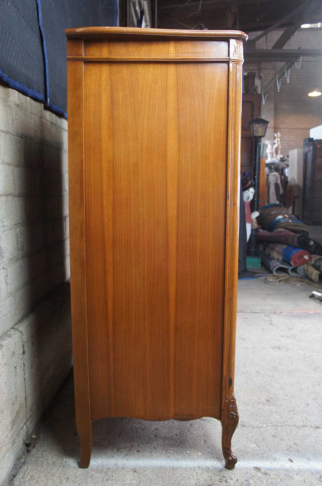 Circa 1940s French tallboy dresser or chest of drawers. Made from walnut with a serpentine front and crotch veneered drawers. Features carved accents, scalloped brass hardware, cabriole legs and glass top(not pictured)