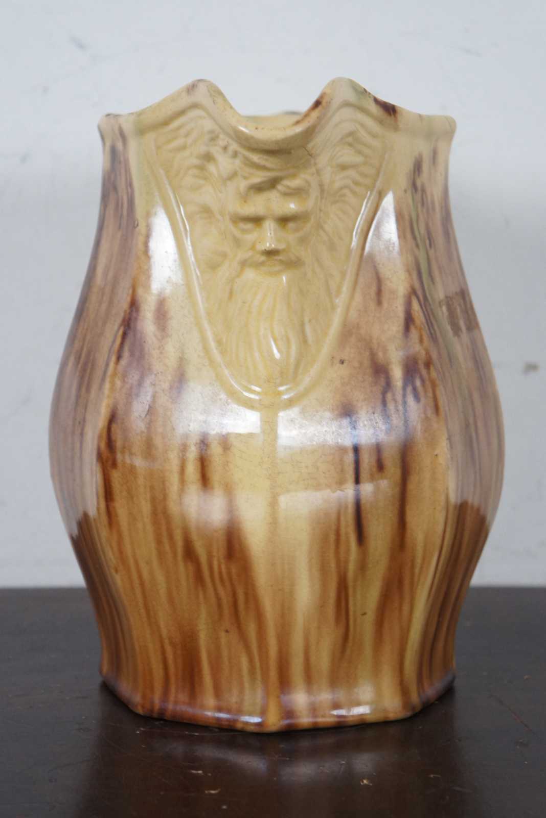 Antique Bennington pitcher with octagonal form featuring a man with a beard resembling the Northwind face under the spout, and Rockingham mottled brown on yellow ground.