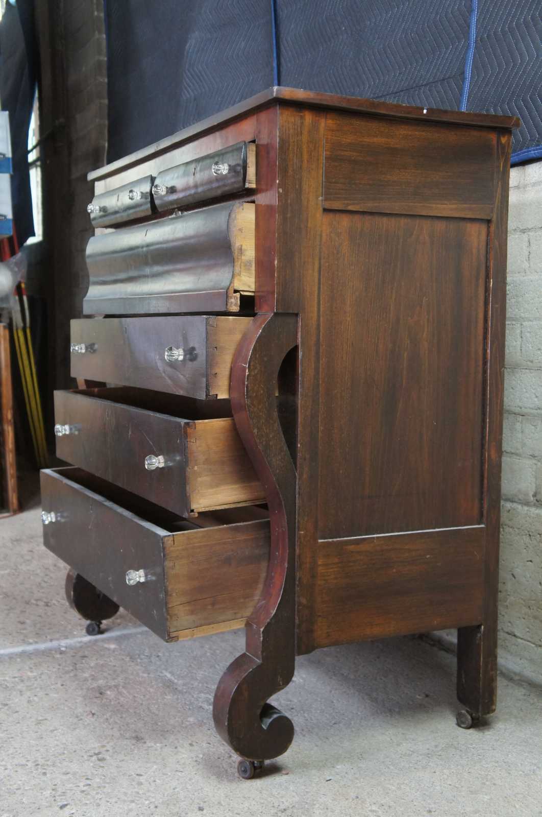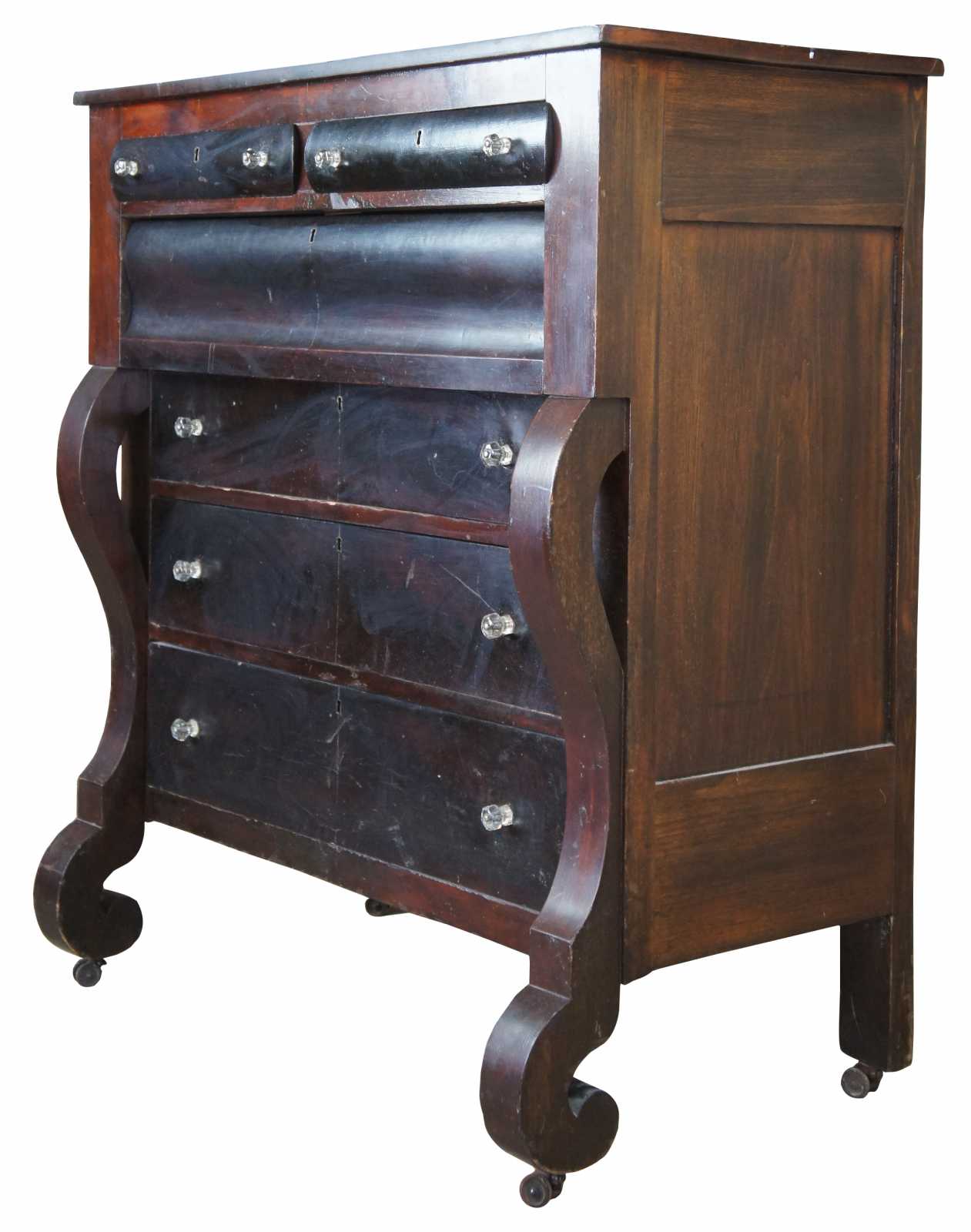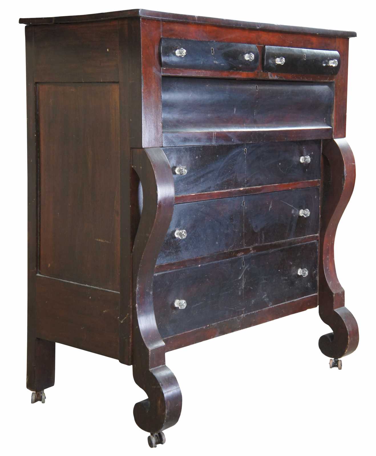Mid 19th century American Empire tall boy chest. Features a rectangular form with scrolled front. Made from walnut with 6 drawers, glass knobs and double casters.