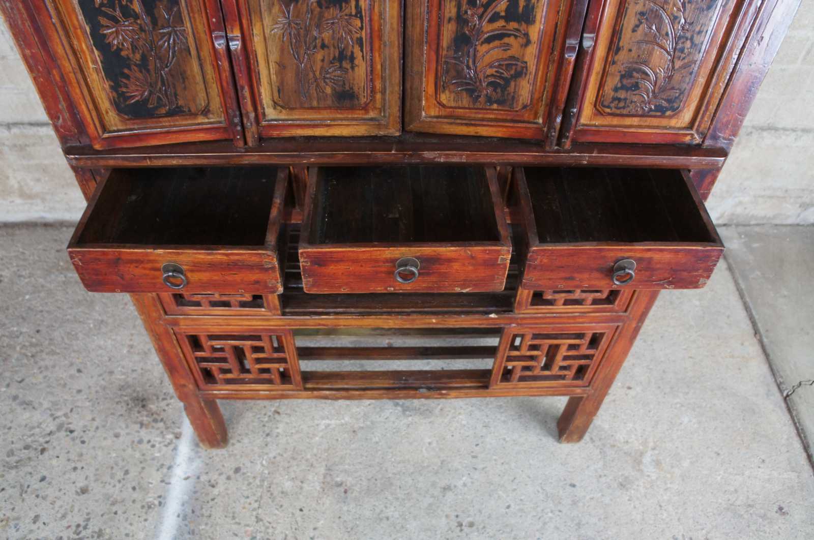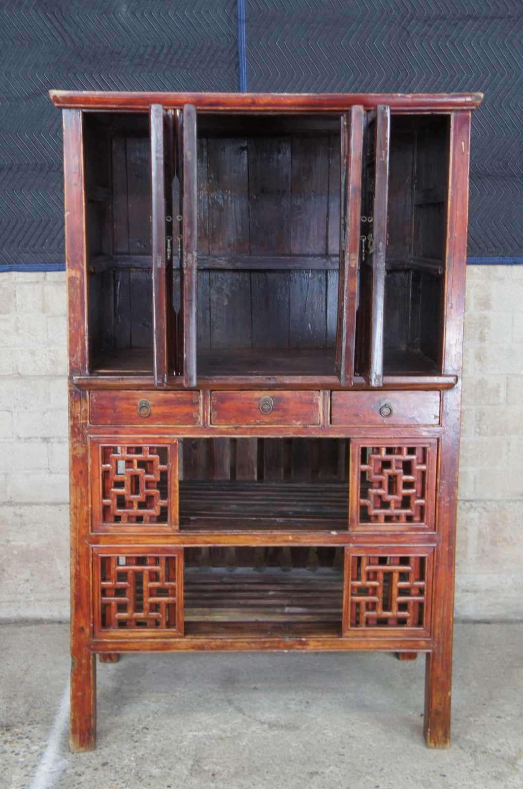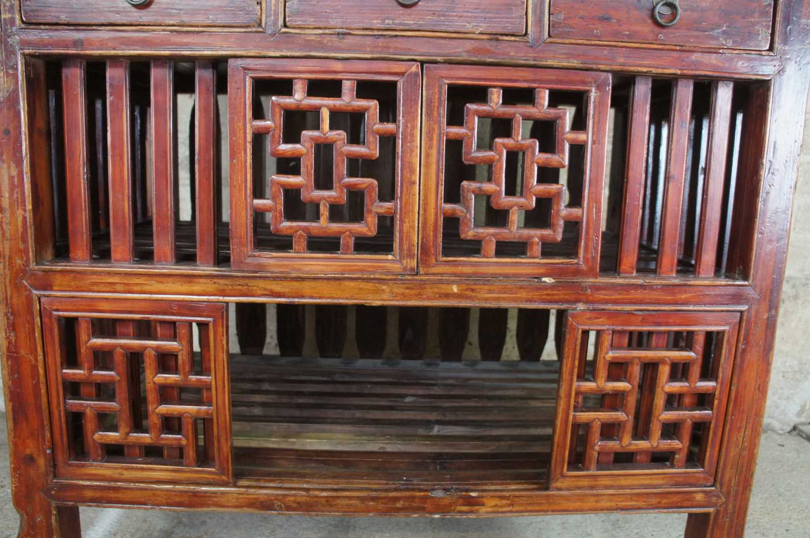 Antique Chinese Kitchen cabinet or cupboard. Made from Elm with intricate fretwork and finish in red, circa late 19th century. Features mortise and tenon joints, 3 drawers, adjustable lower panels and removable top doors.