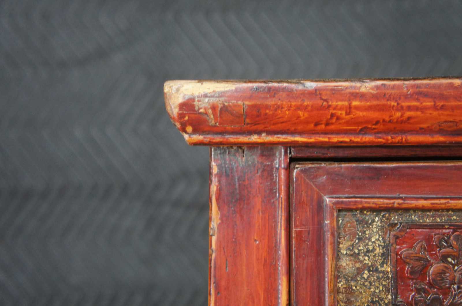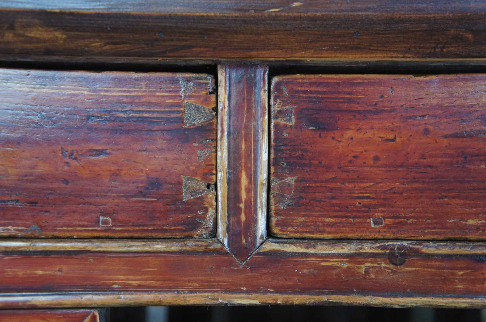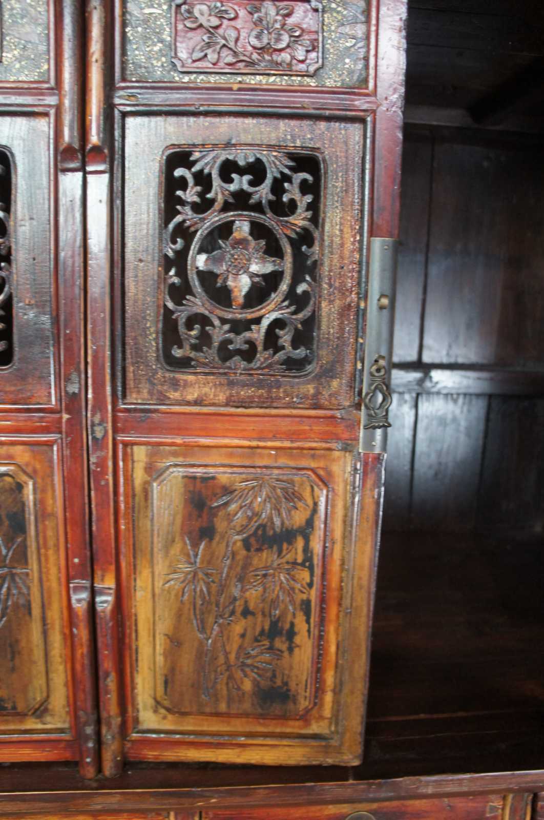 Antique Chinese Kitchen cabinet or cupboard. Made from Elm with intricate fretwork and finish in red, circa late 19th century. Features mortise and tenon joints, 3 drawers, adjustable lower panels and removable top doors.