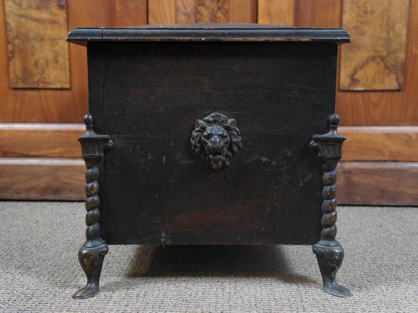 Antique Victorian Gothic style oak coal bin with leather seated top, iron feet and lion’s head handles, with tin lining.