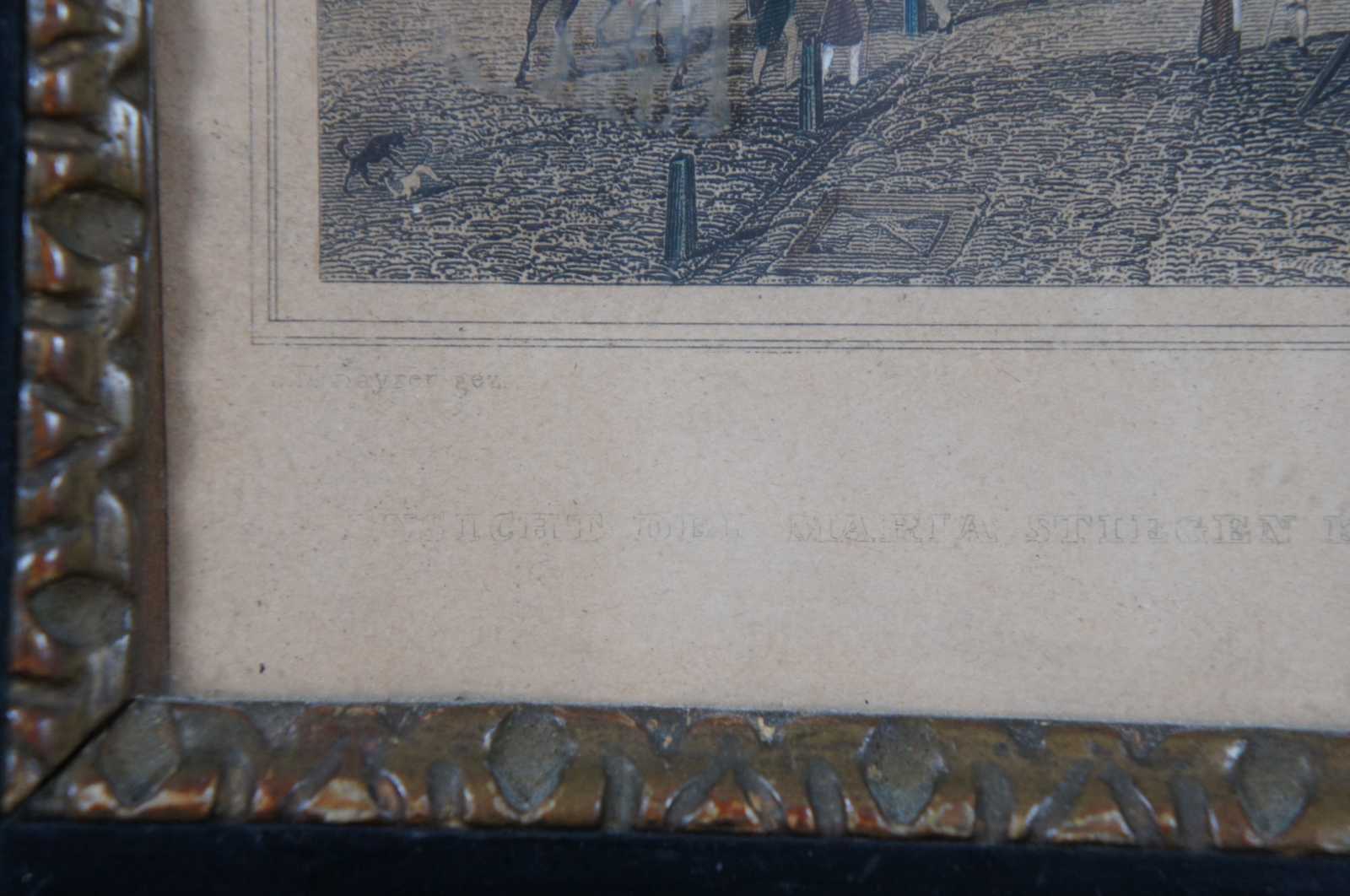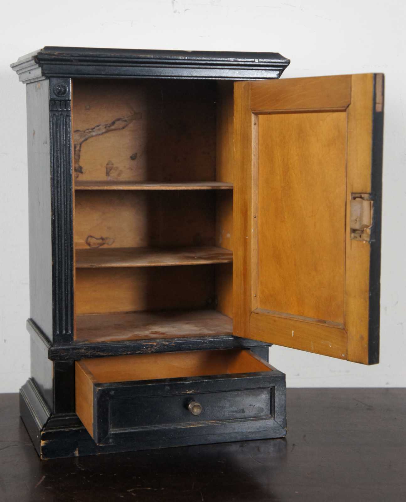 Antique black painted miniature cabinet with lower drawer, three interior shelves and door displaying an antique print by Carl Rauch titled Ansicht der Maria Stiegen Kirche in Wien (View of Mary by the Shore Church in Vienna). “Maria am Gestade or Maria Stiegen is a Gothic church in Vienna, Austria. One of the oldest churches in the city—along with St. Peter's Church and St. Rupert's Church—it is one of the few surviving examples of Gothic architecture in Vienna. Carl Rauch was born around 1804; engraver, painter and draughtsman, specialized on architectural subjects, worked in Darmstadt, Germany.”
