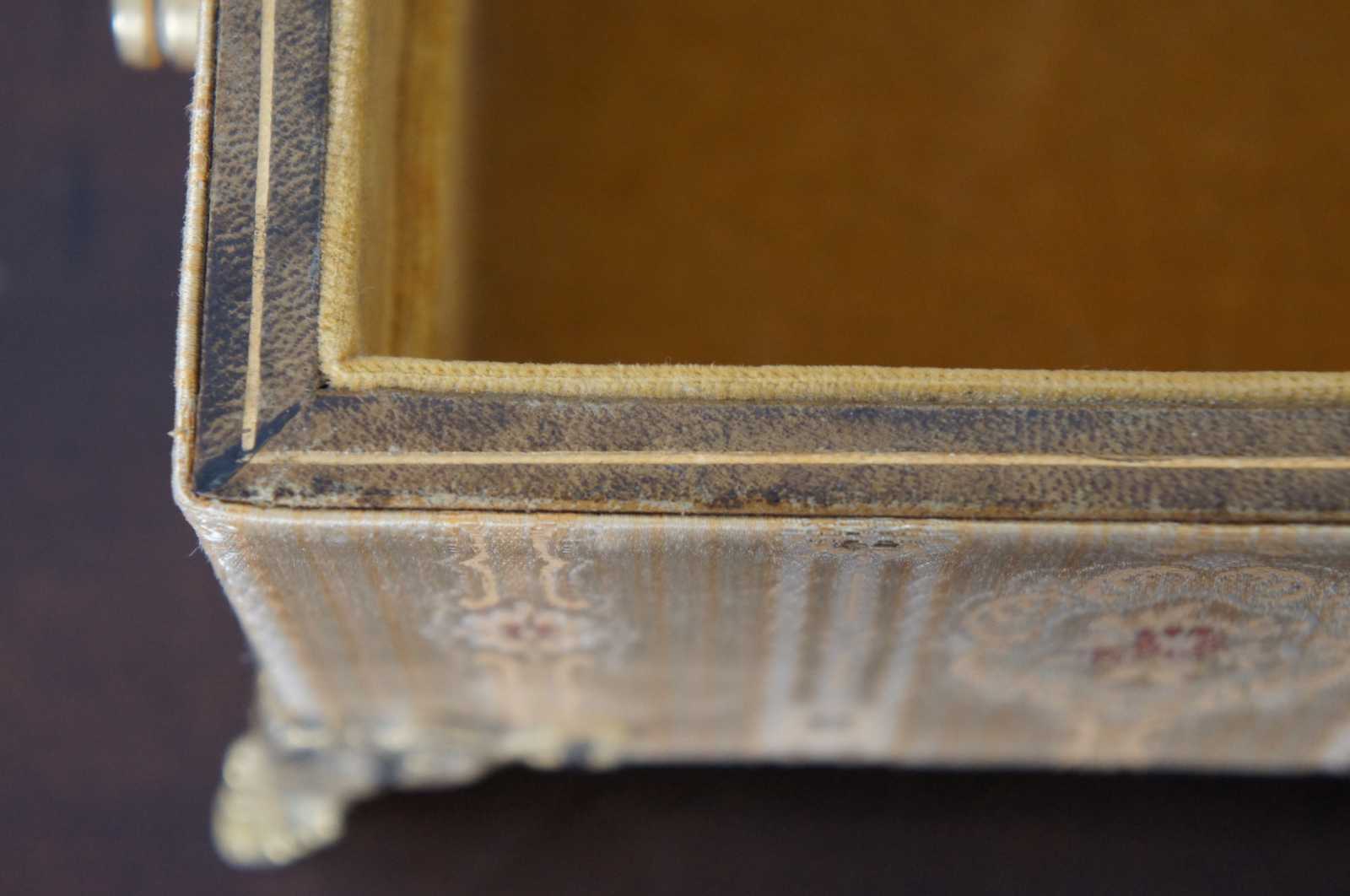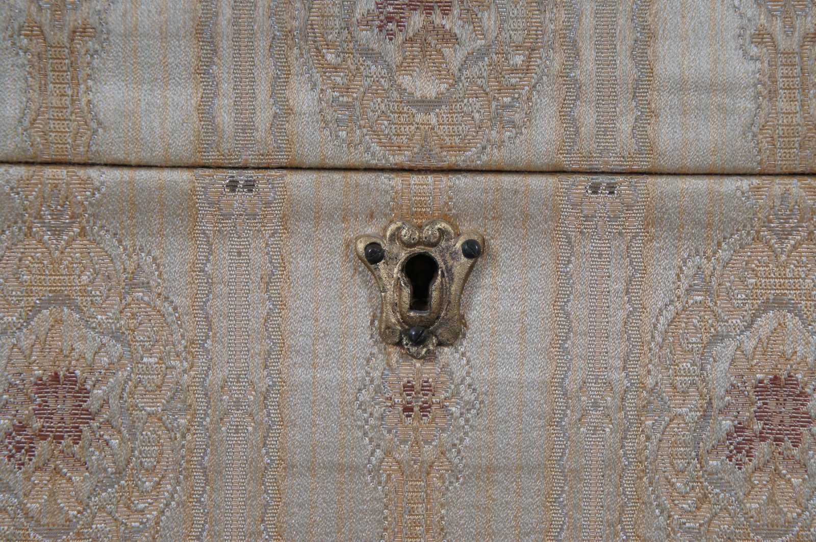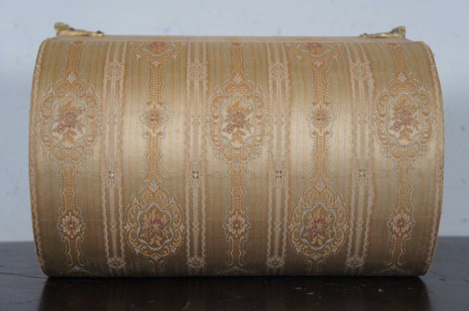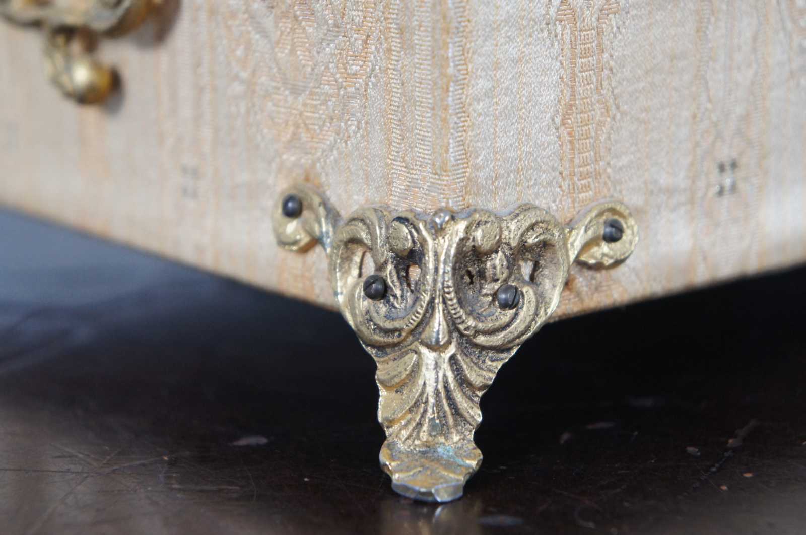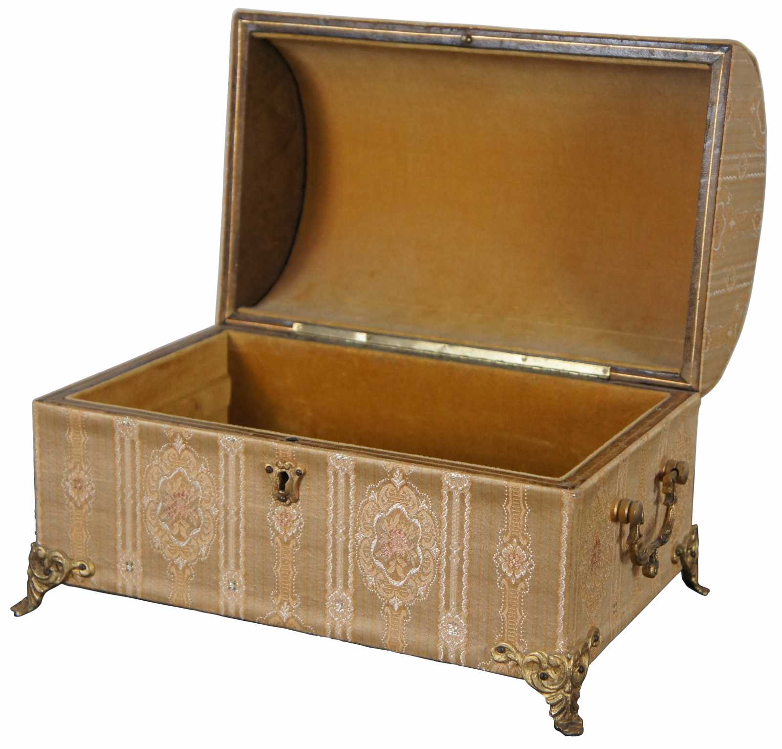 Vintage velvet lined jewelry box in the shape of a treasure chest and covered in a gold silk floral brocade with brass feet.