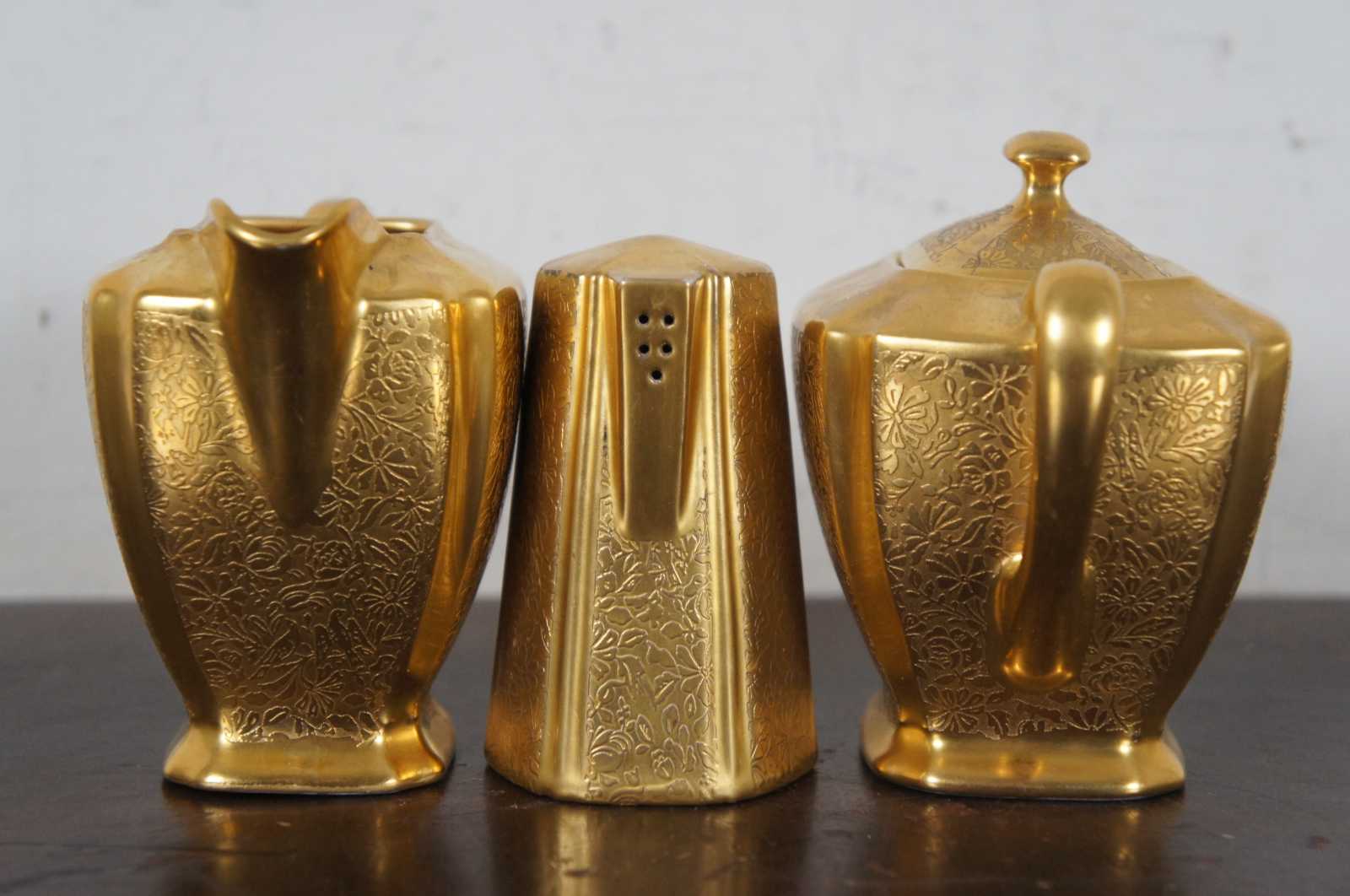 Antique 22k gold painted Wheeling Decorating Company embossed floral creamer, sugar bowl and combined salt and pepper shaker.