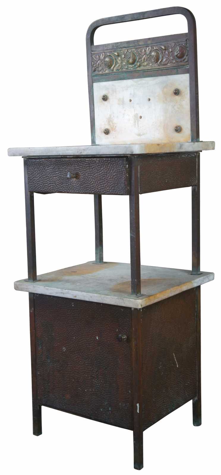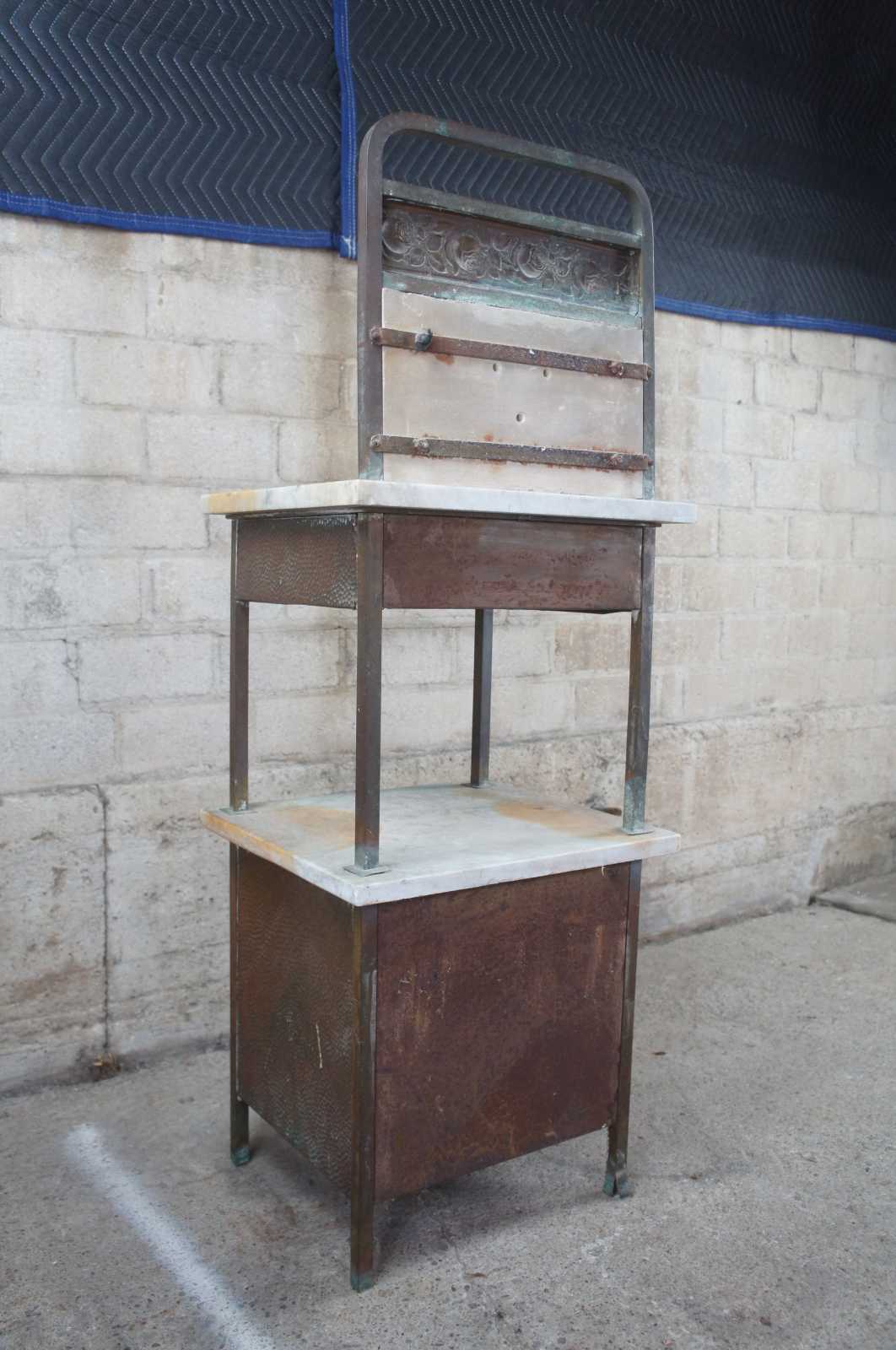 Antique two tier washstand or medical cabinet. Made of iron and marble featuring an upper drawer and lower cabinet.