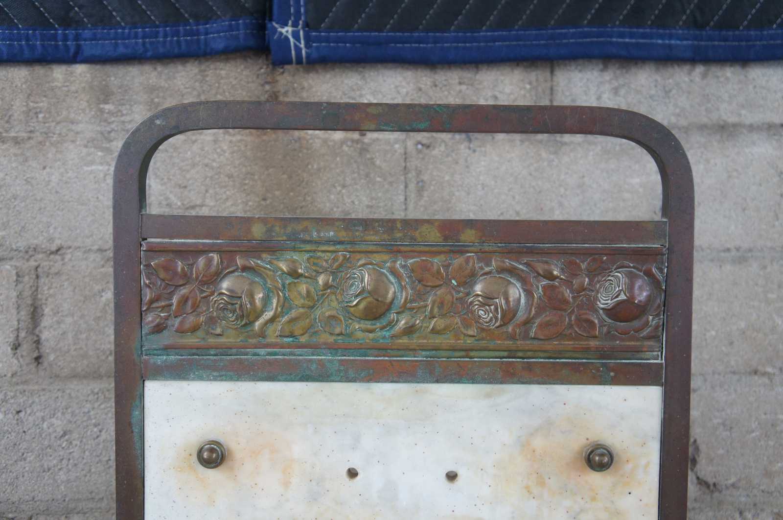 Fair condition, good structurally, one foot has fraying to casing, heavy rust and oxidation throughout, staining and discoloration to marble, edge wear, missing upper shelf on backsplash. Very heavy.