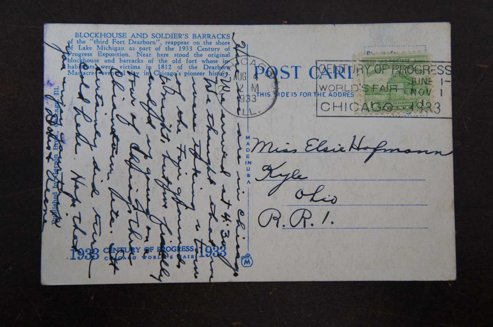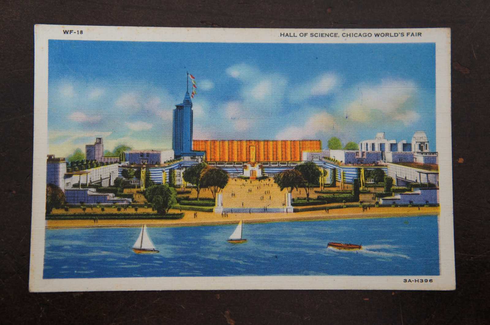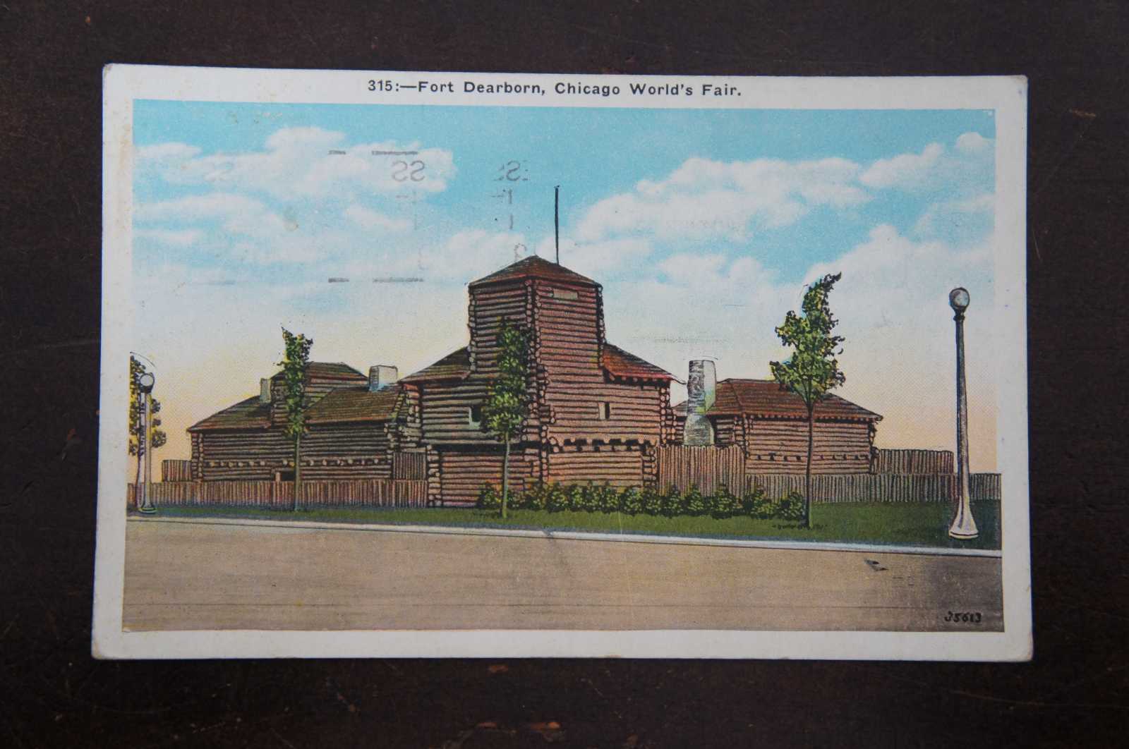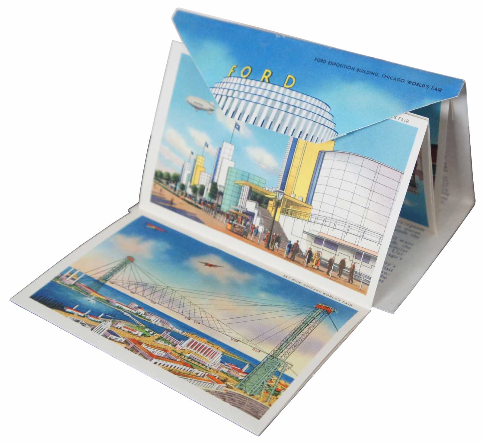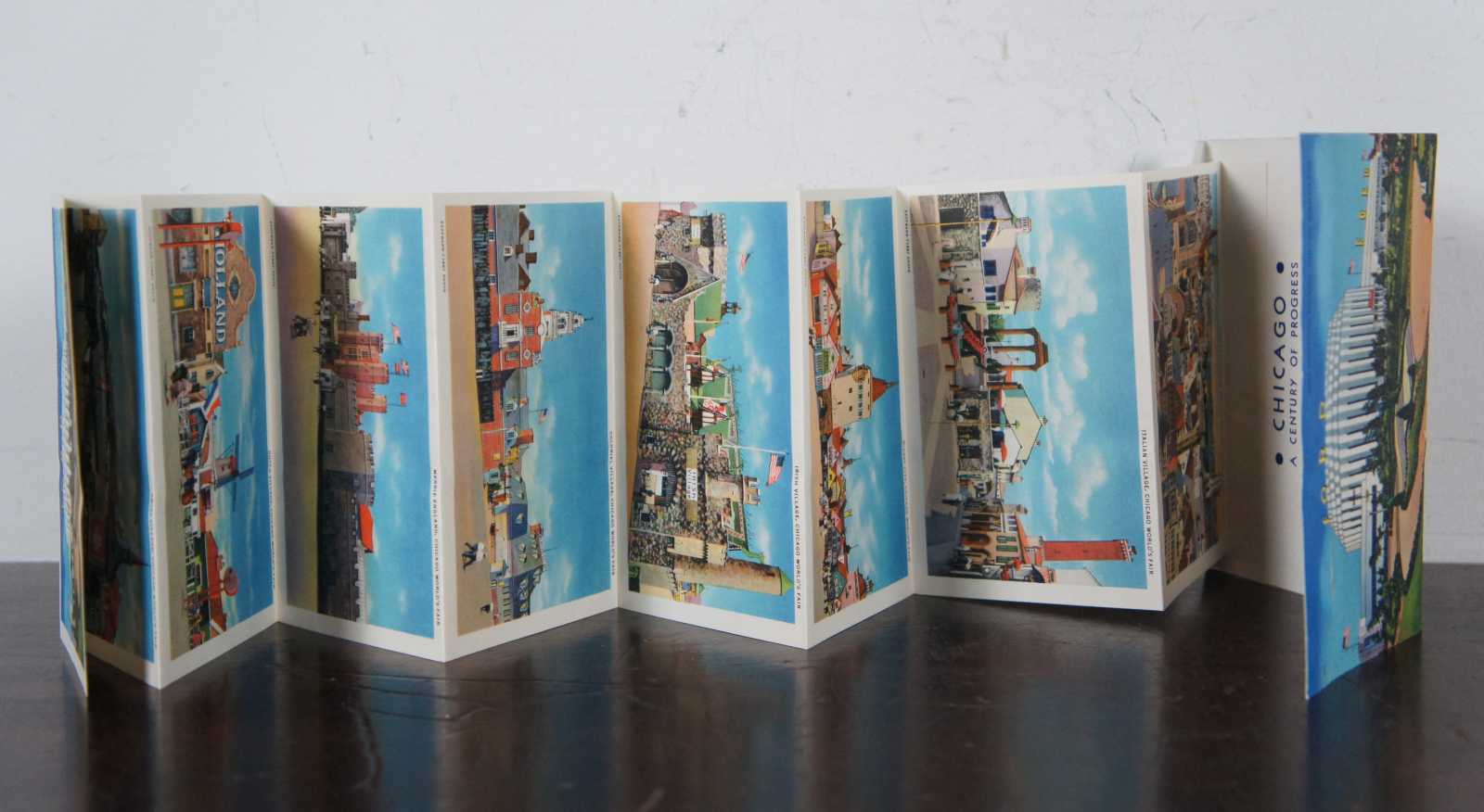 Three standard postcards (one used, two un-used) and souvenir picture postcard accordion fold booklet for the 1934 Chicago World’s Fair.