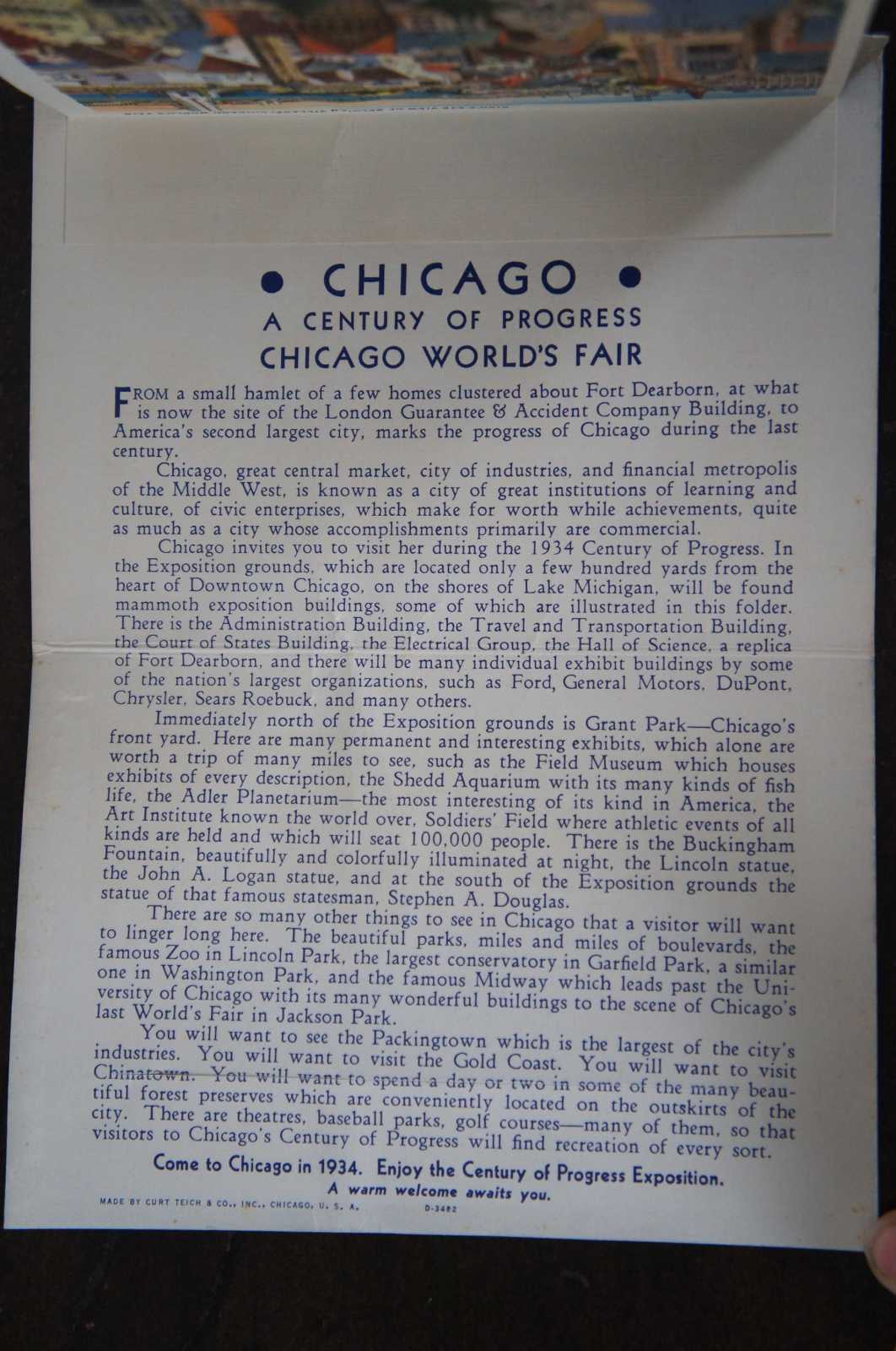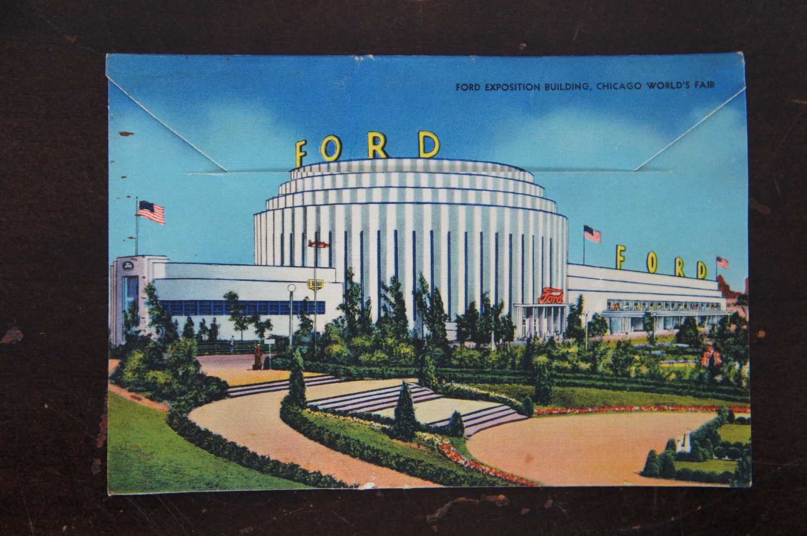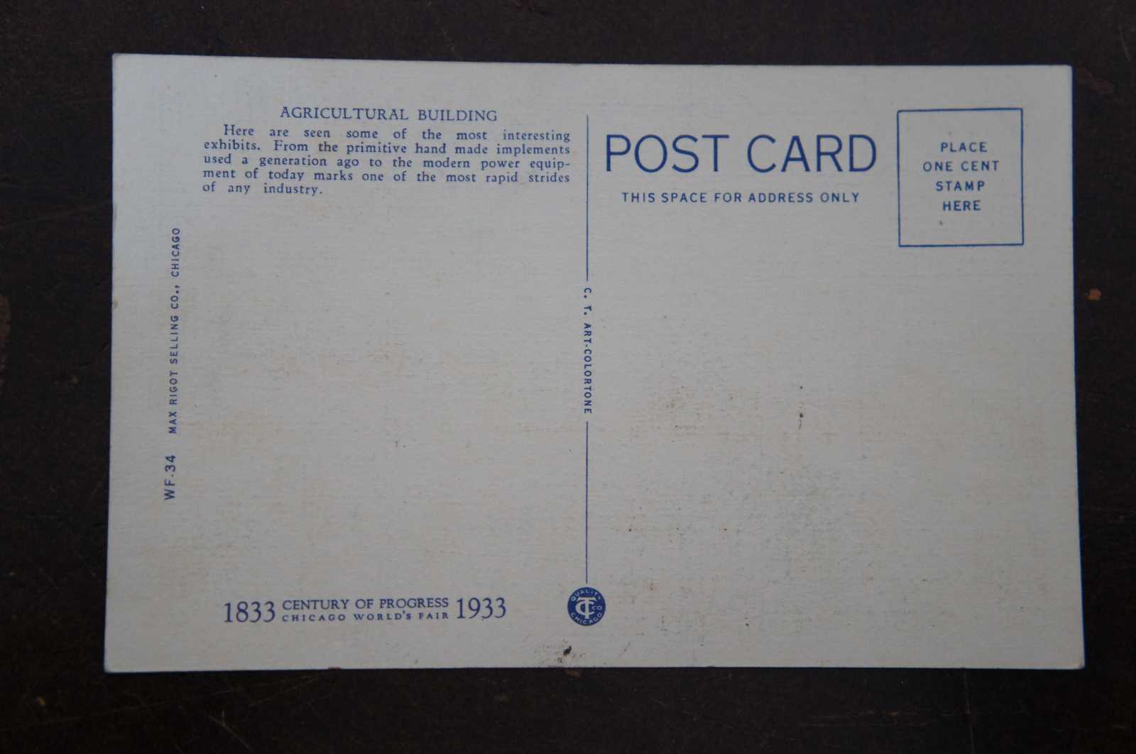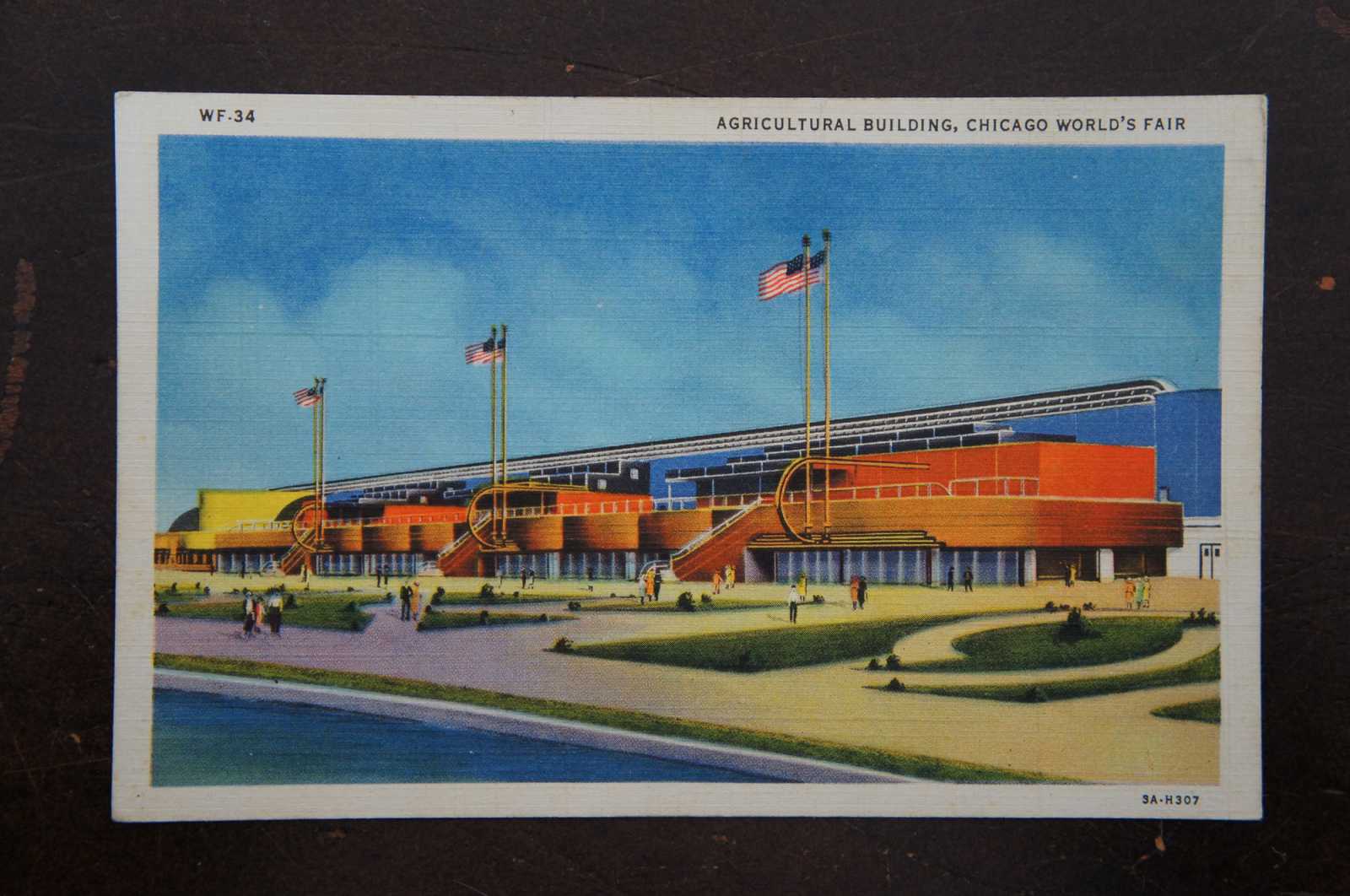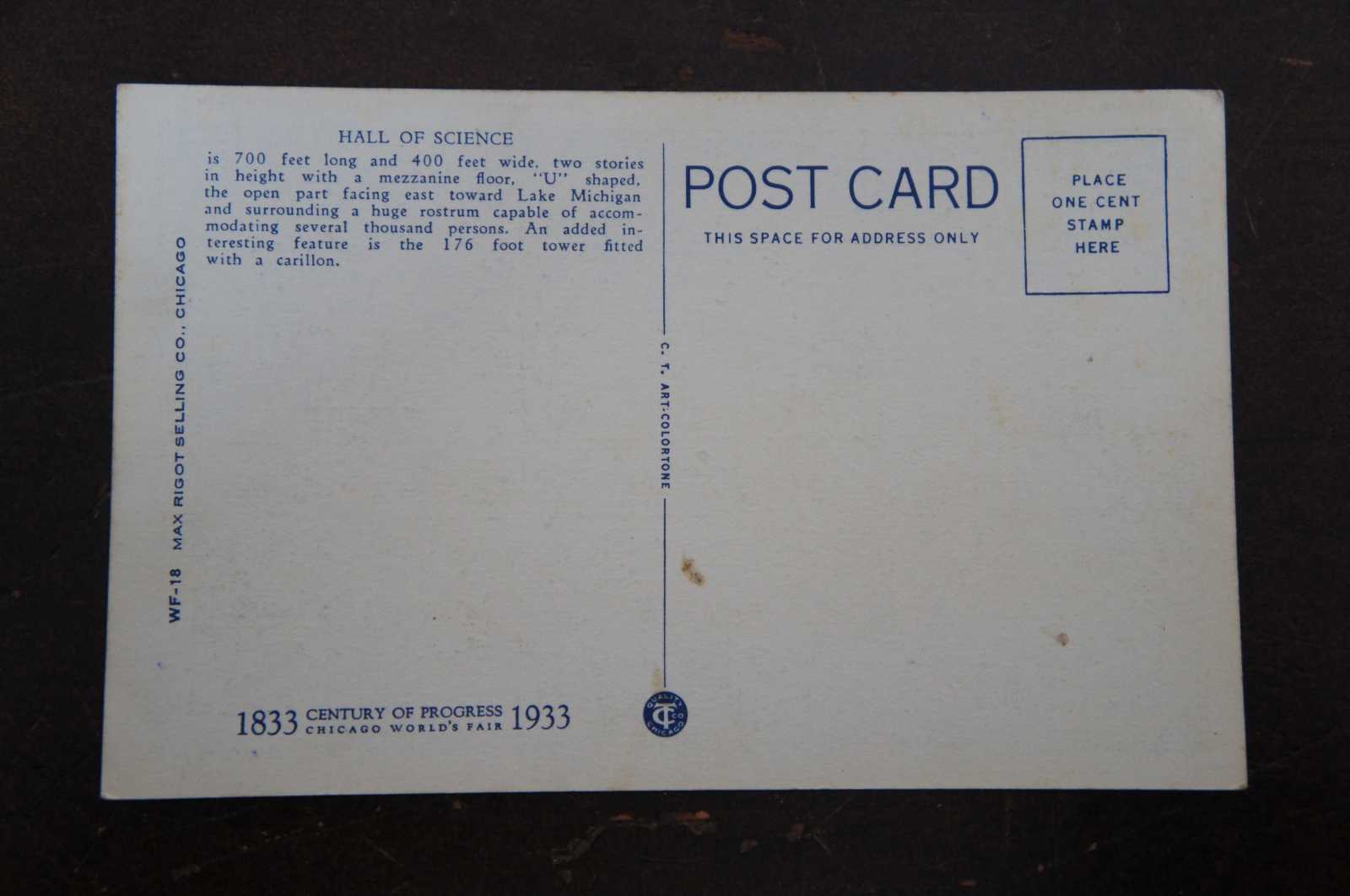 Three standard postcards (one used, two un-used) and souvenir picture postcard accordion fold booklet for the 1934 Chicago World’s Fair.