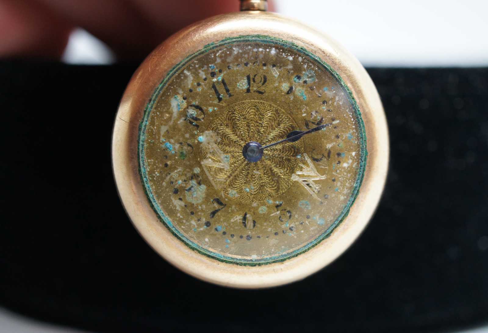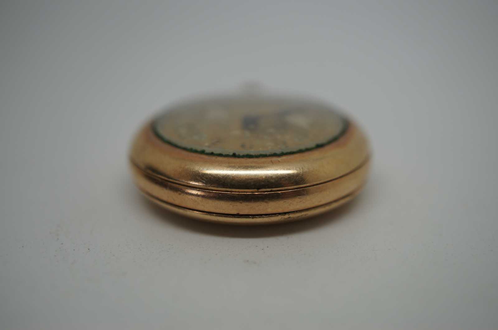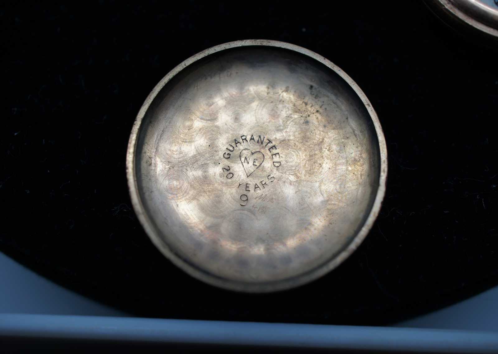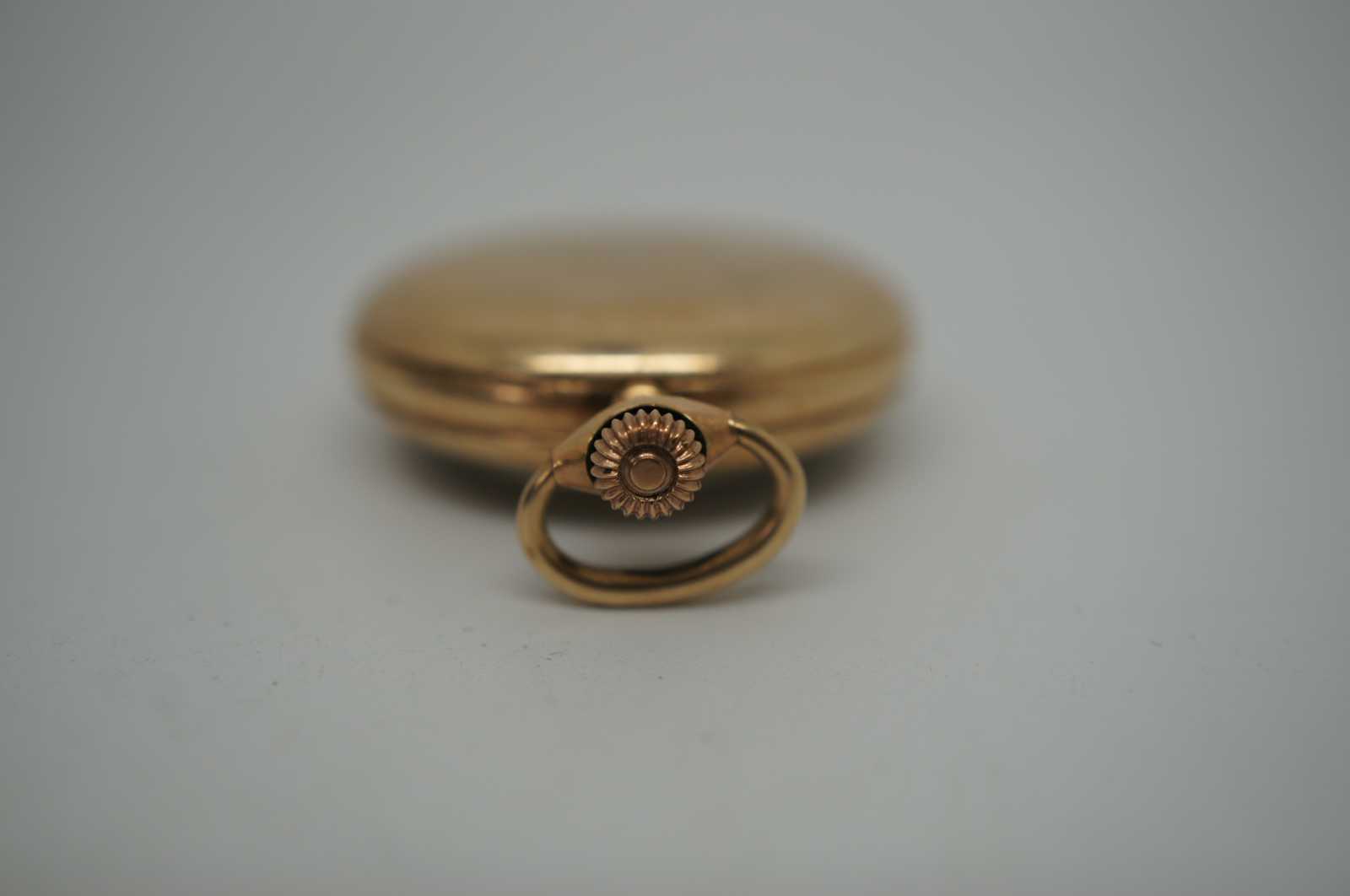 Petite antique pocket watch by the New England Watch Company with metallic gold face and gold filled case.