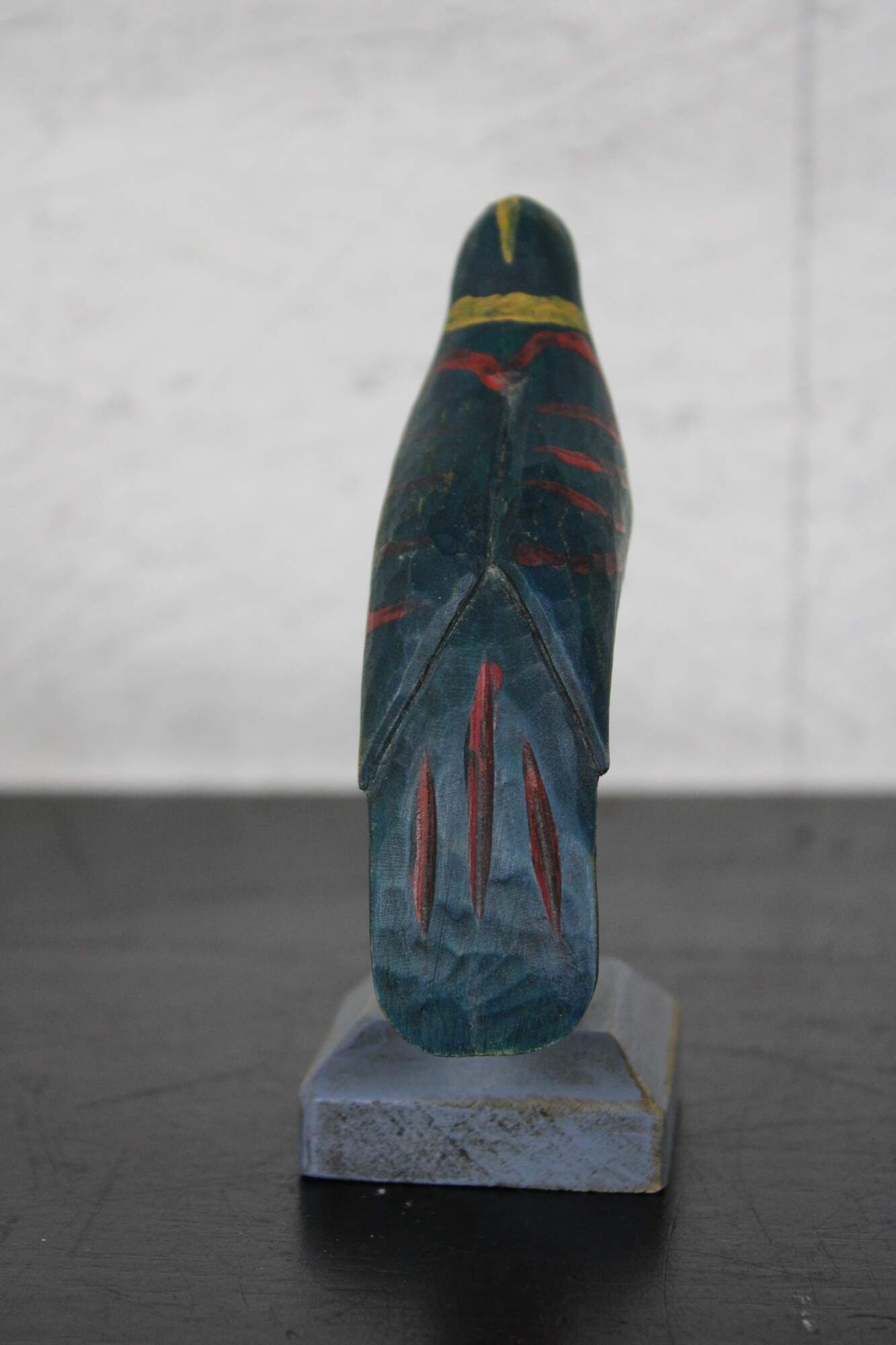 Vintage primitive folk art style wooden bird figurine on an acorn finial base; marked “CVP 1997.”
