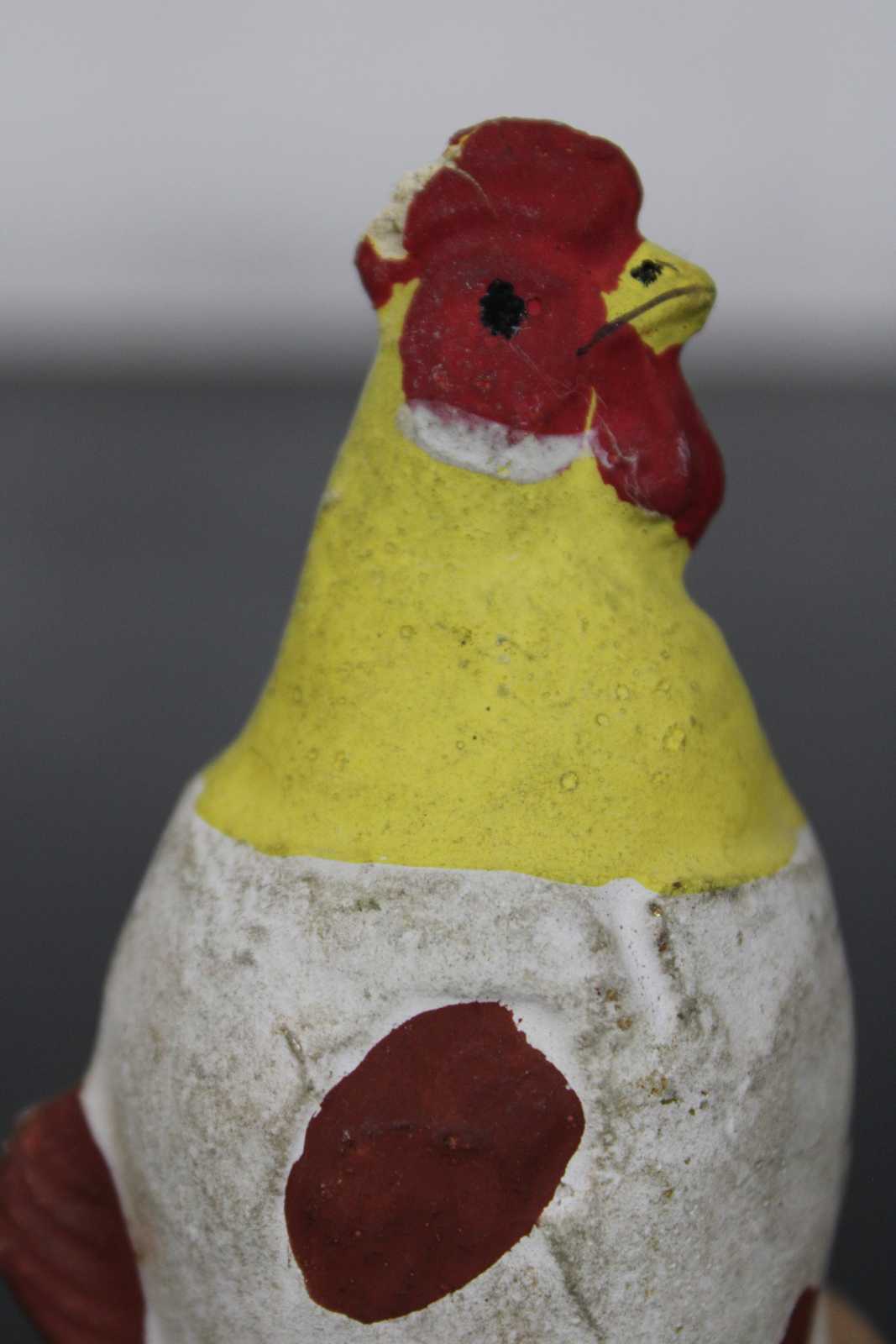 Antique German paper mache candy container with a round base decorated like a stone wall, topped with a seated chicken with a brown and white body, yellow head, and red wattle and comb.