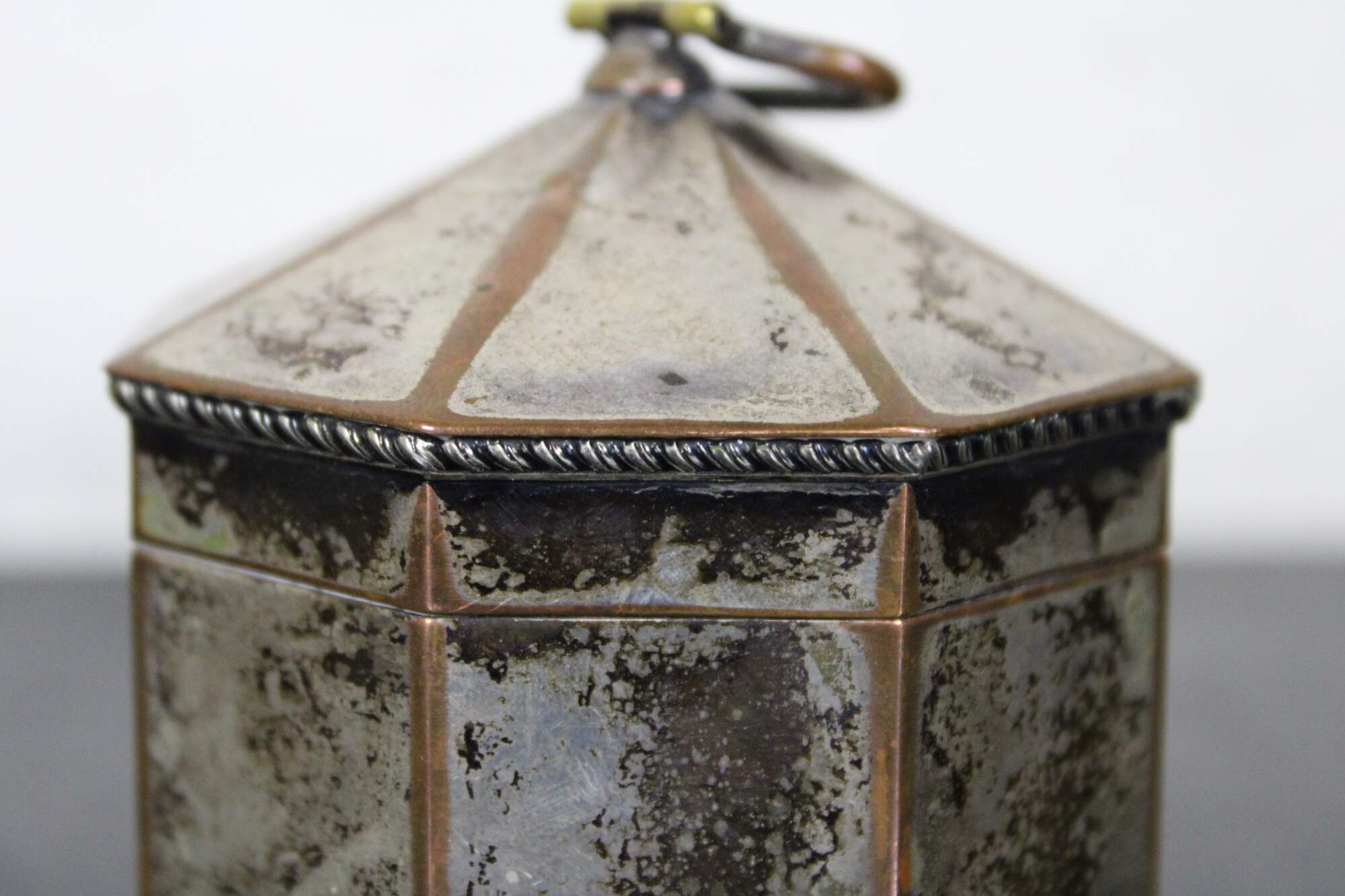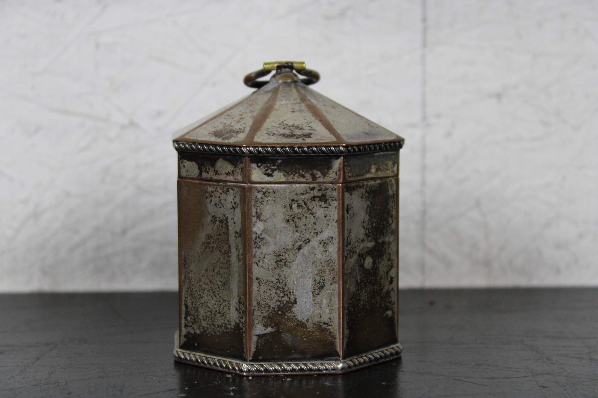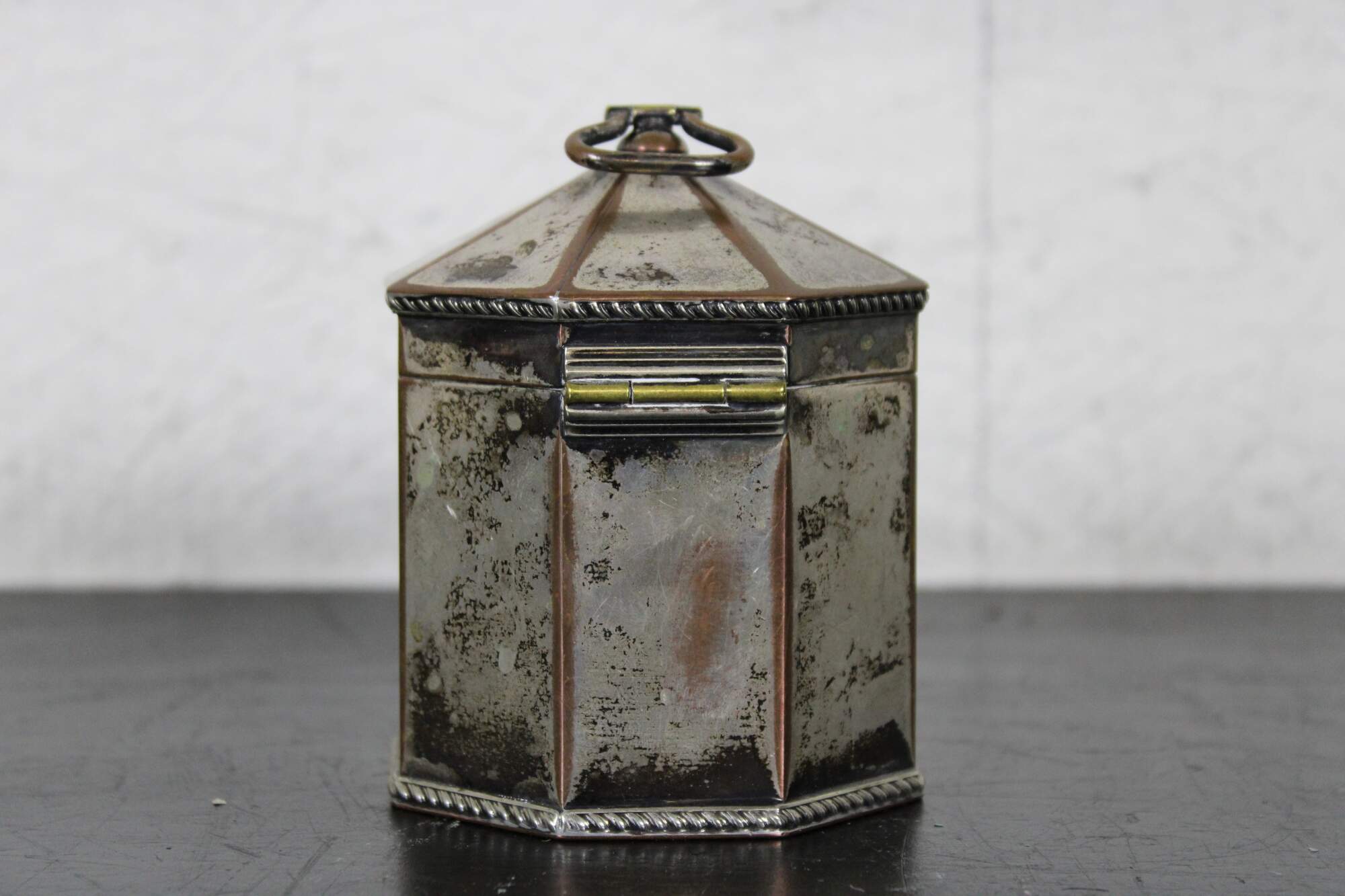 Antique silver plate on copper, octagonal tea caddy or trinket box.