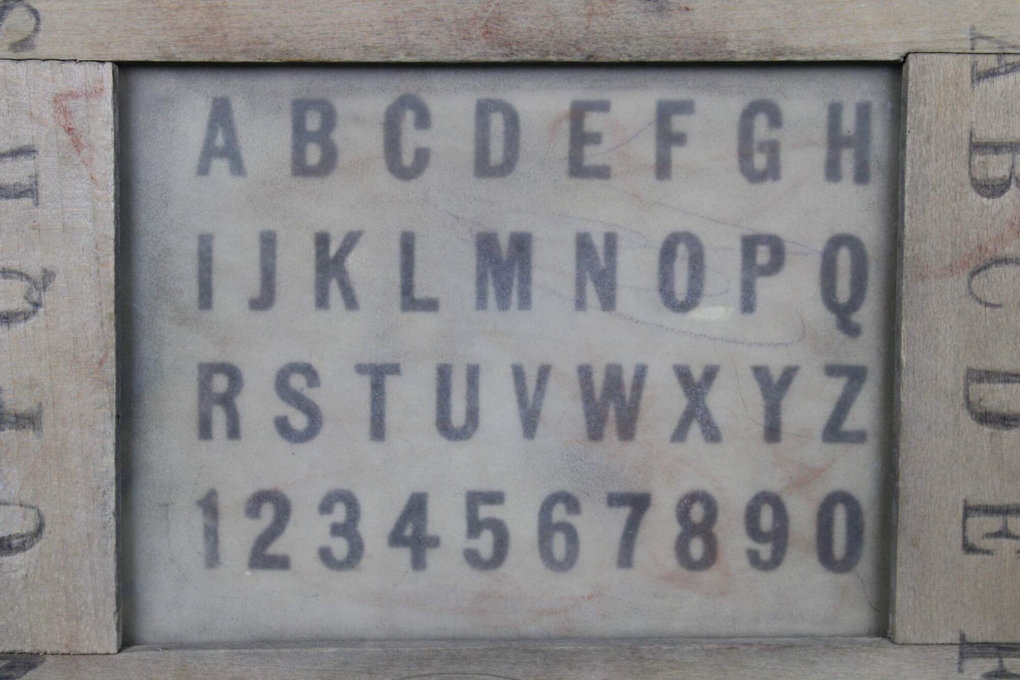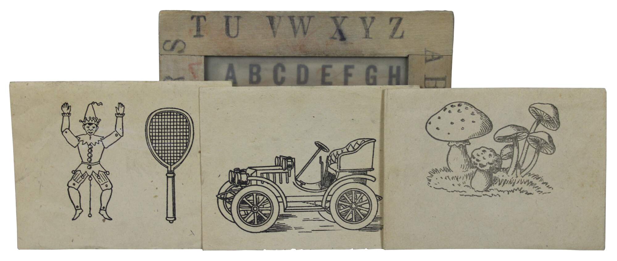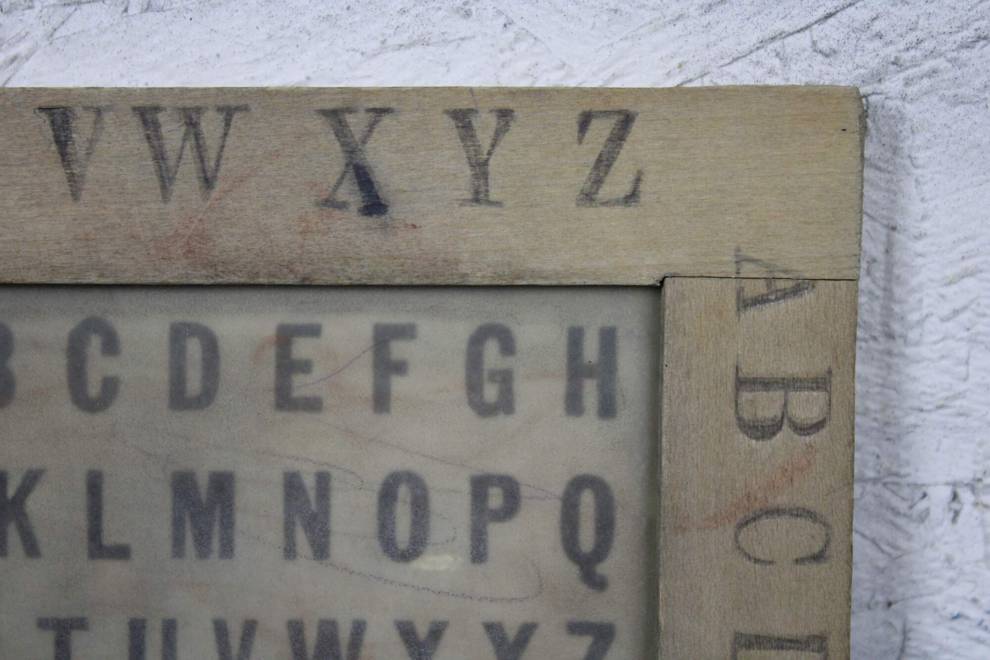 Antique primitive wooden frame with the alphabet stamped along the edges, plus four educational paper alphabet and coloring sheets.