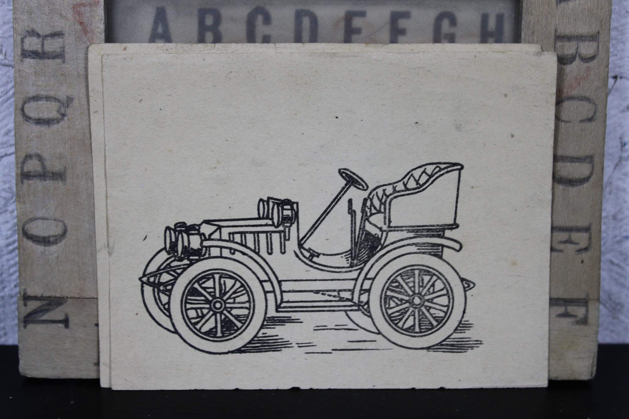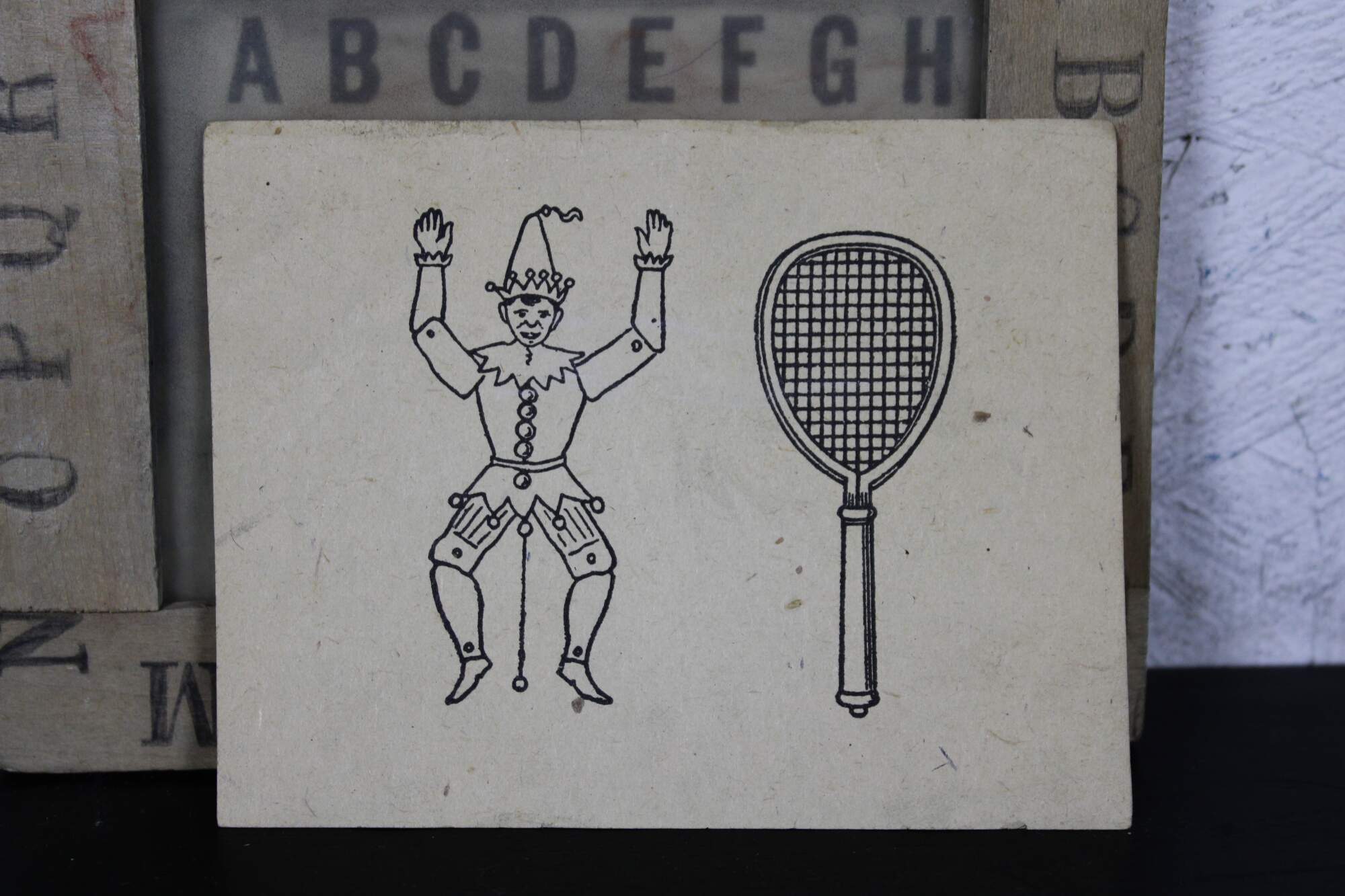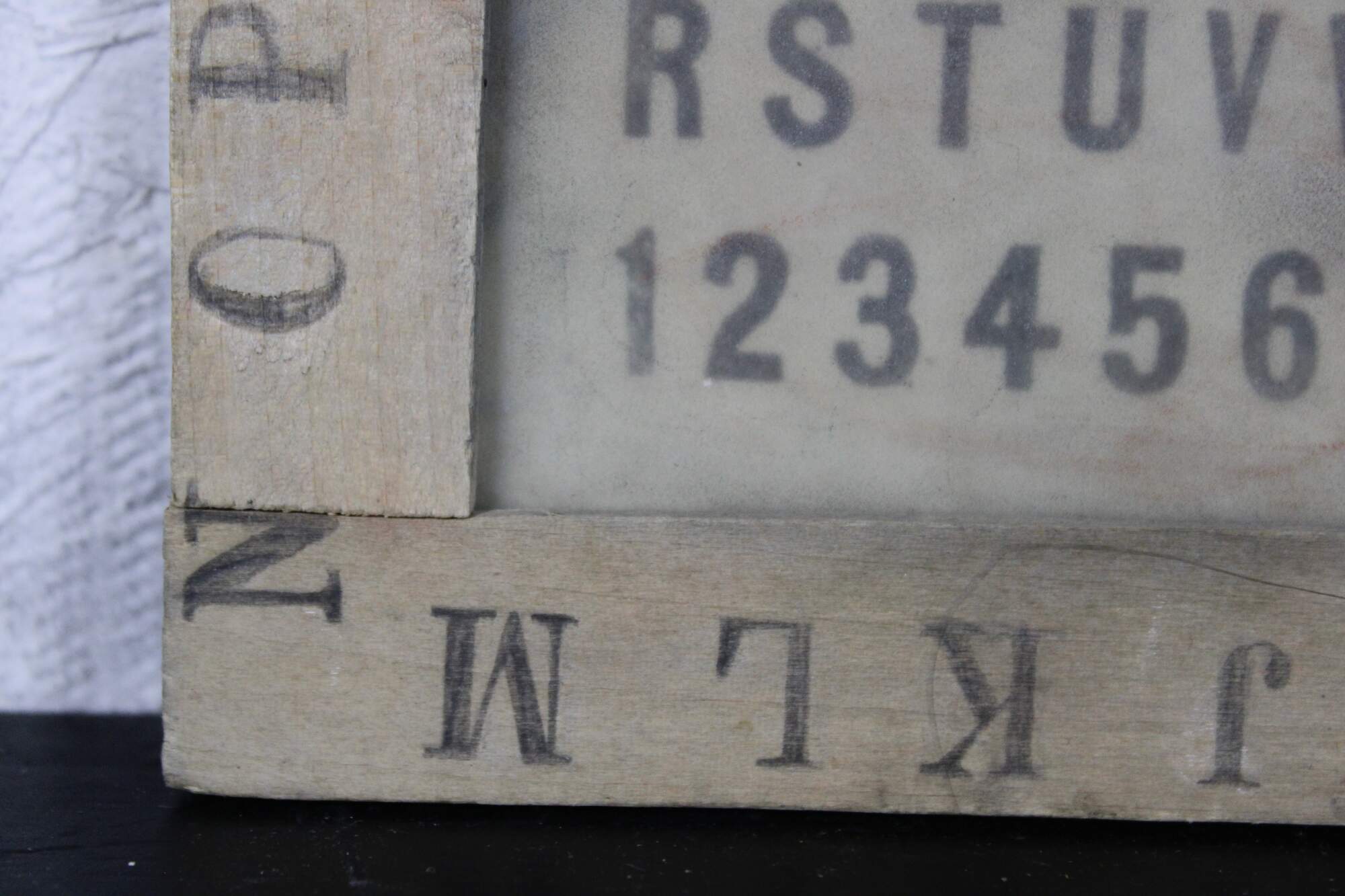 Antique primitive wooden frame with the alphabet stamped along the edges, plus four educational paper alphabet and coloring sheets.