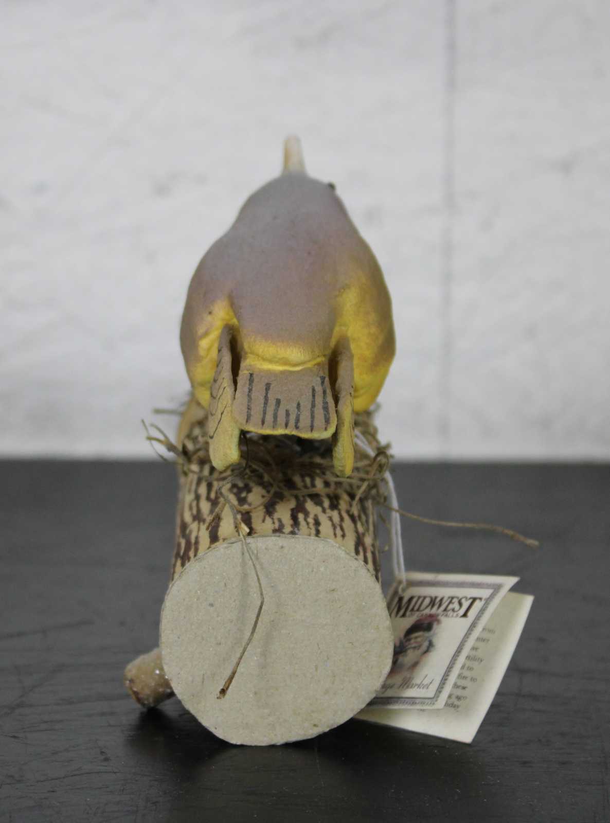 Robin on the Yule Log” paper mache figurine by Midwest of cannon Falls Heritage Market series; a reproduction of a real antique.