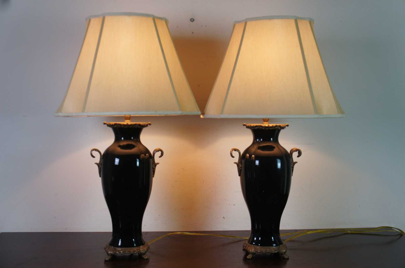 Pair of vintage table lamps by Castilian, featuring black ceramic ginger jar or urn shaped bodies overlaid with a scrolled rococo brass frame and lion’s paw feet, with two curved handles on the sides. #25051-CUI