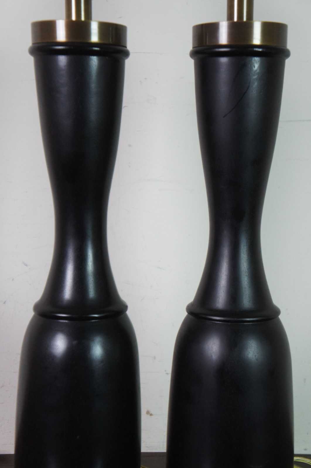 Two vintage designer table lamps featuring a turned trophy form with ebonized wood and brushed brass accents. Attributed to Baker Furniture.