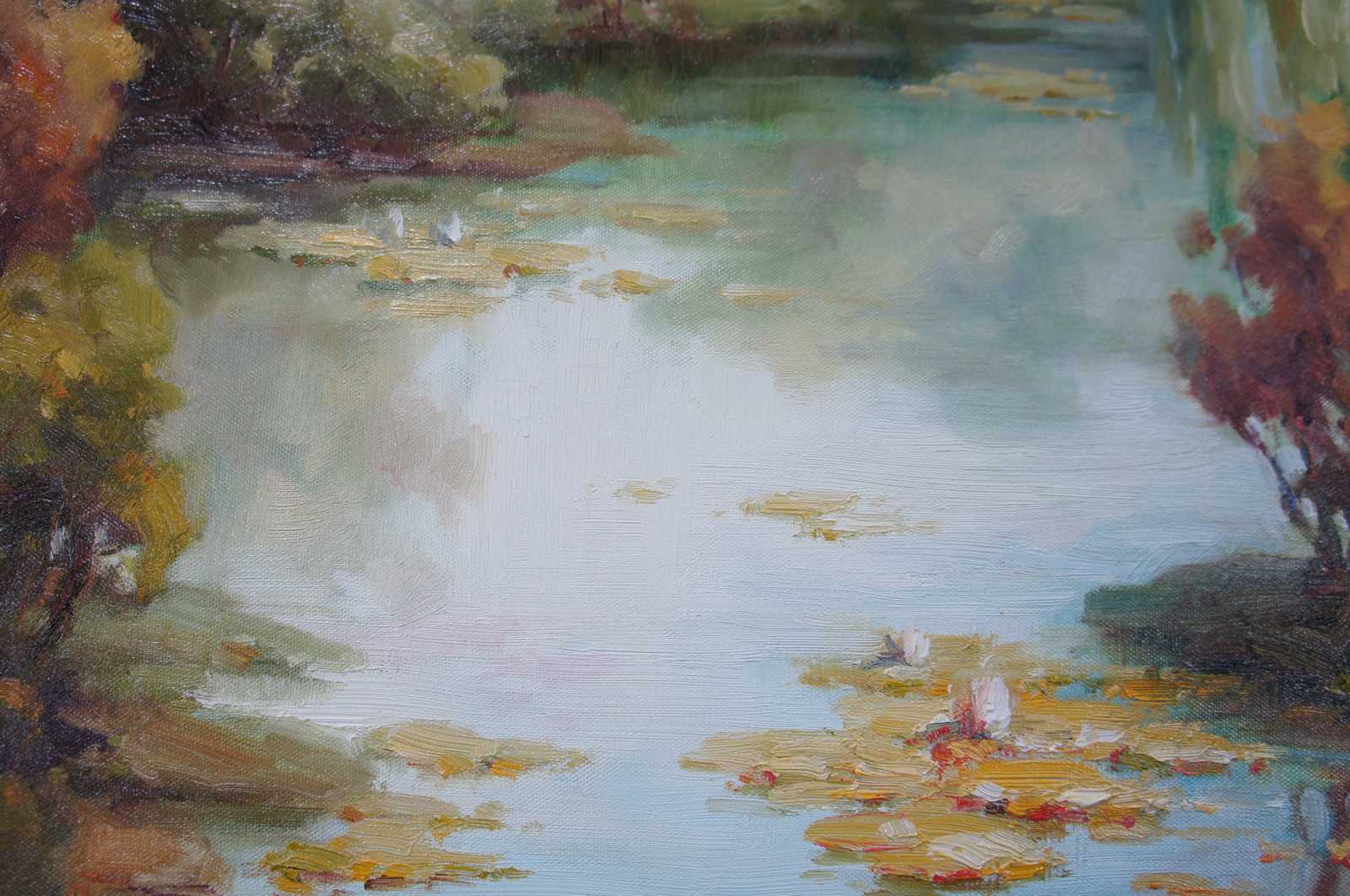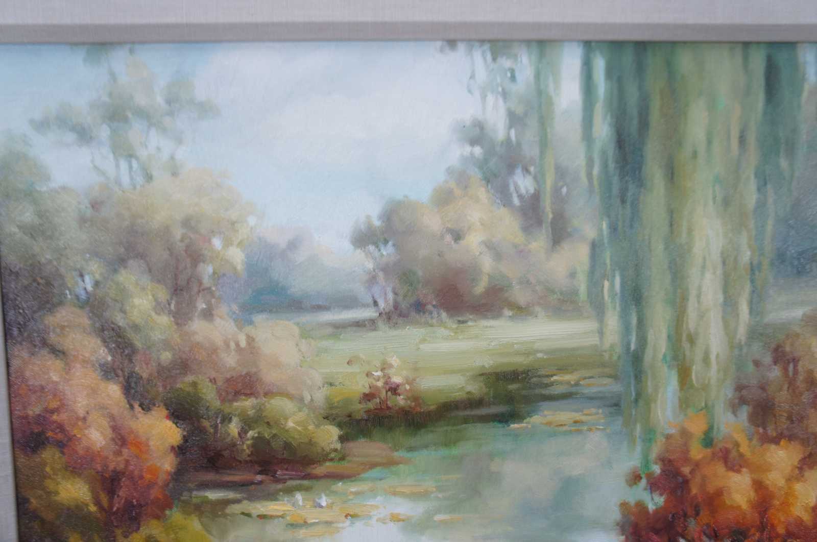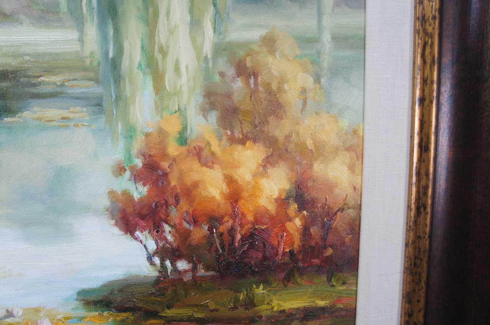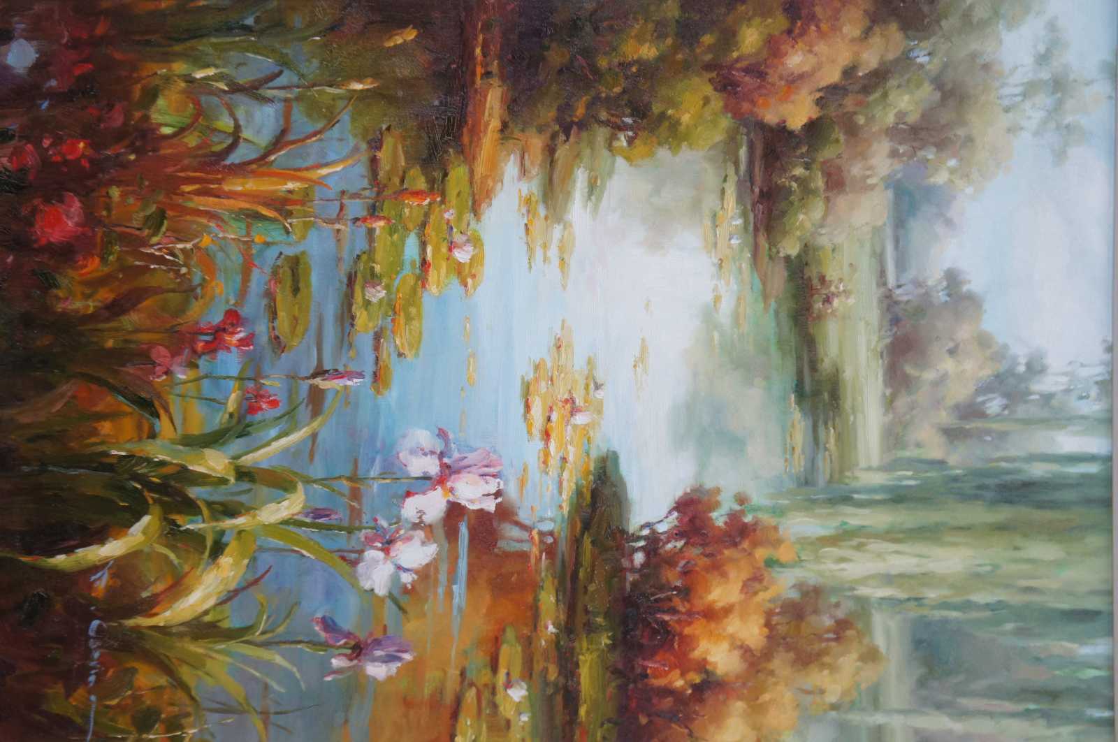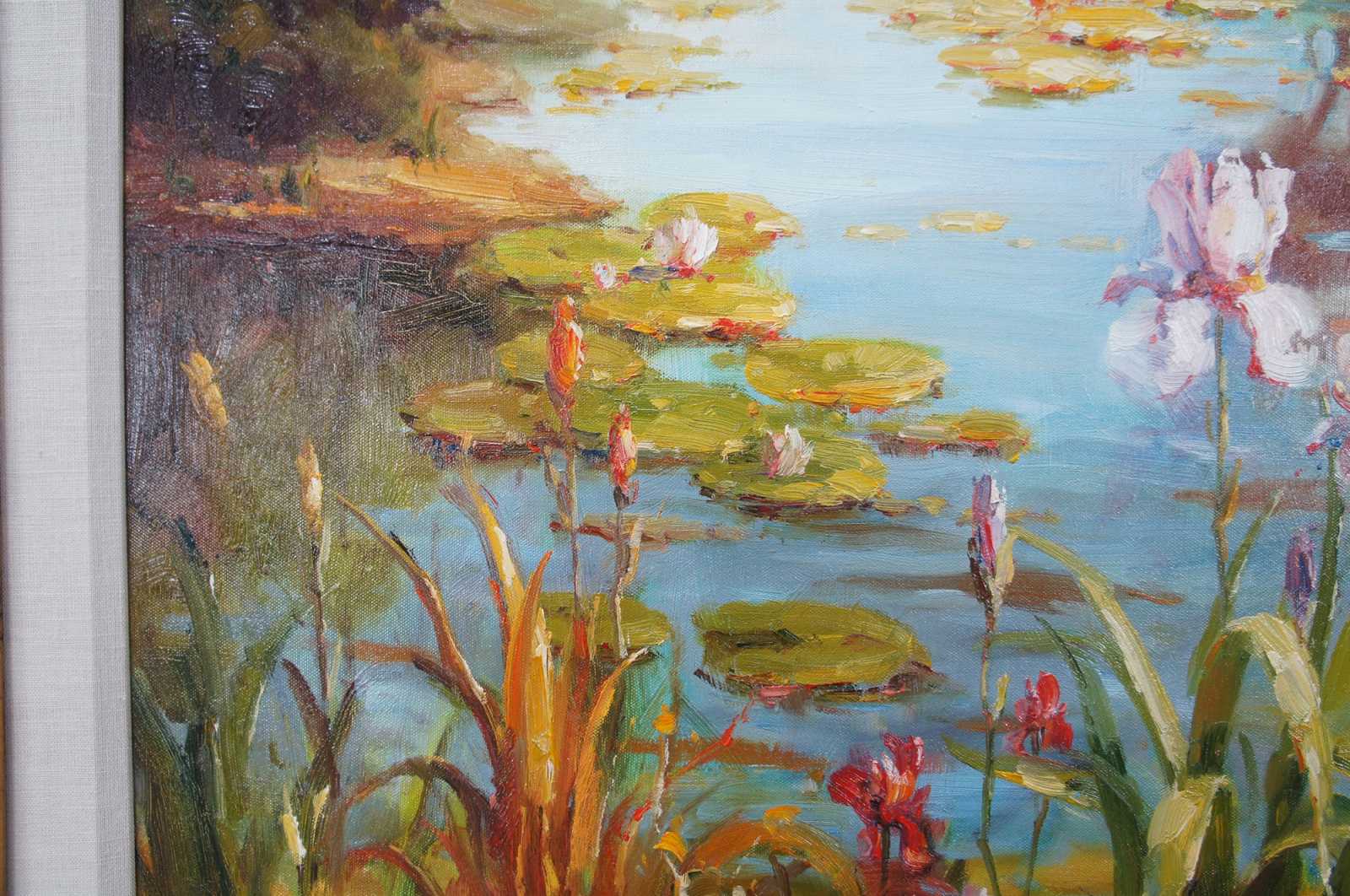 Original oil painting titled Lake Scene featuring flowers, foliage, trees and water lily's. Signed lower right.