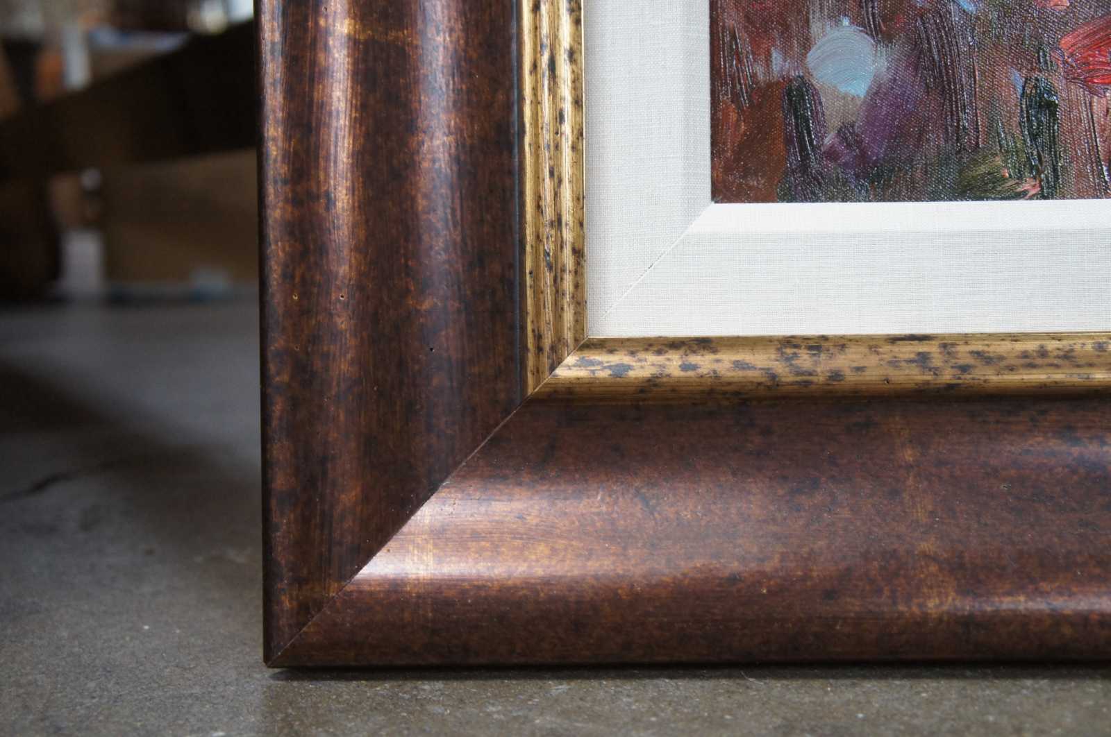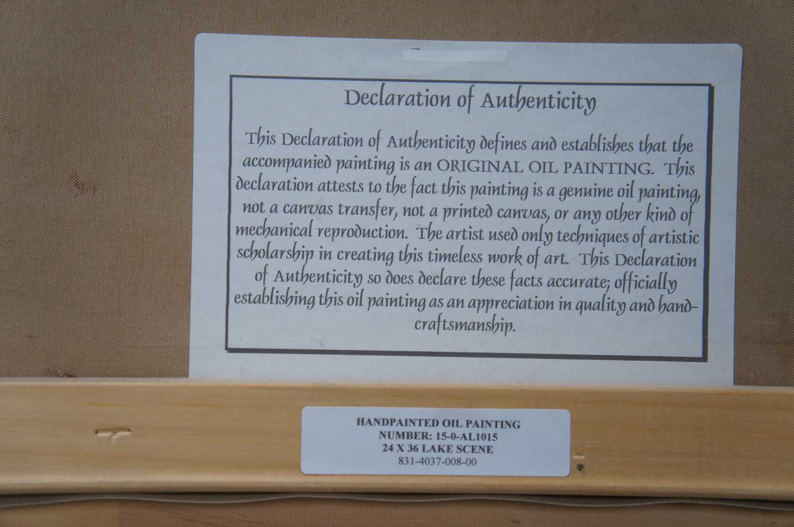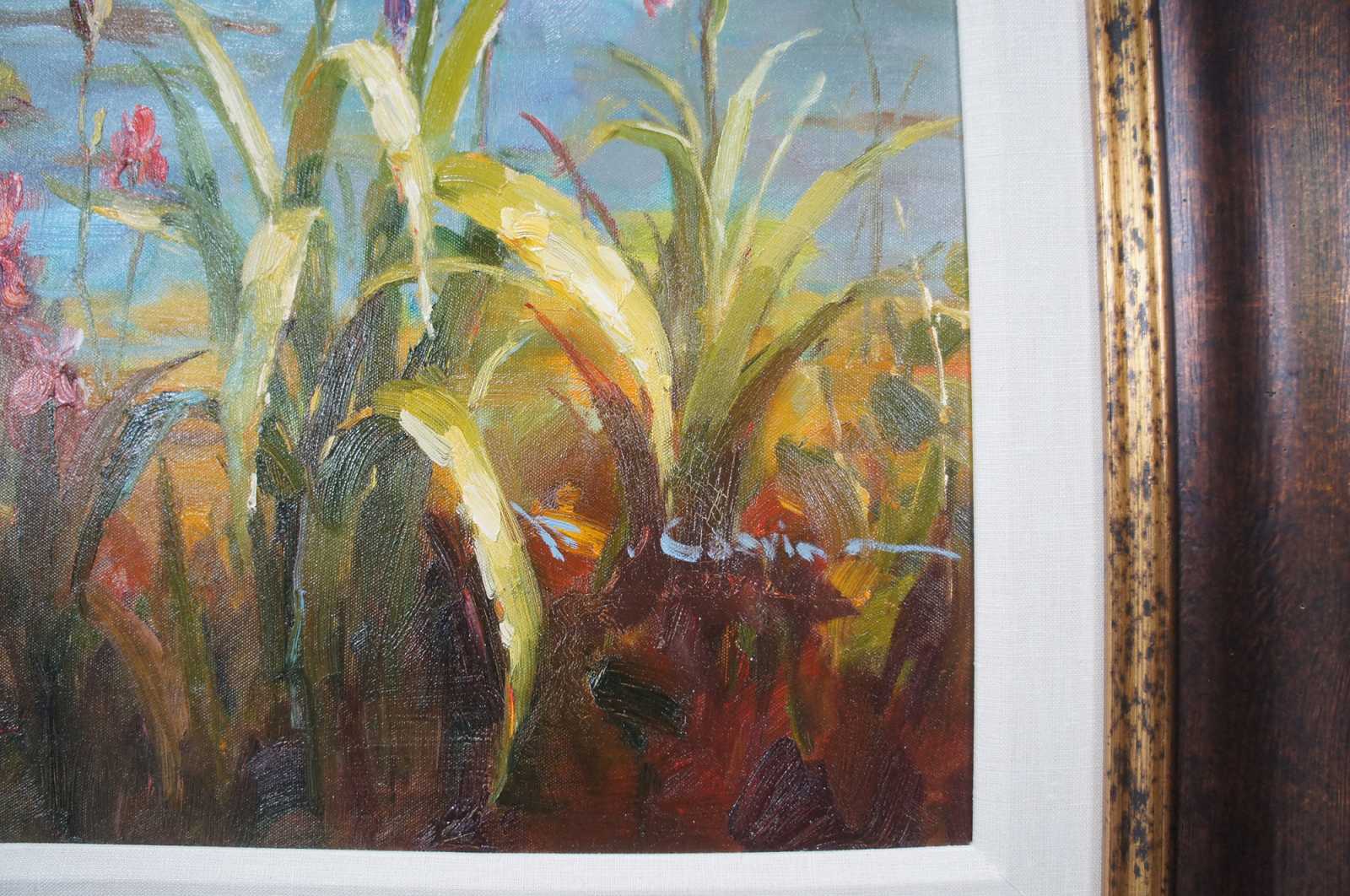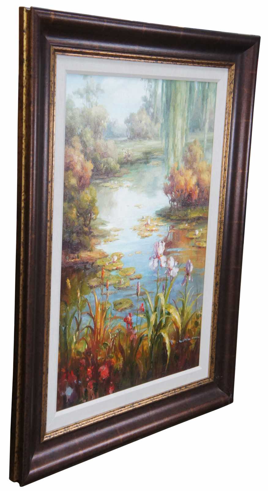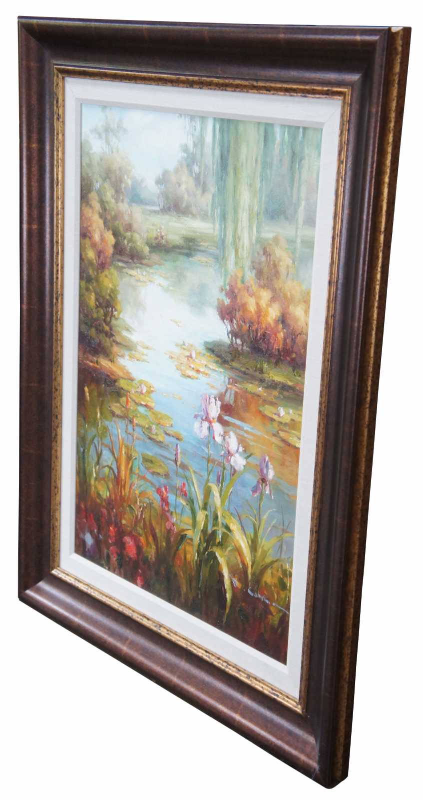 Original oil painting titled Lake Scene featuring flowers, foliage, trees and water lily's. Signed lower right.