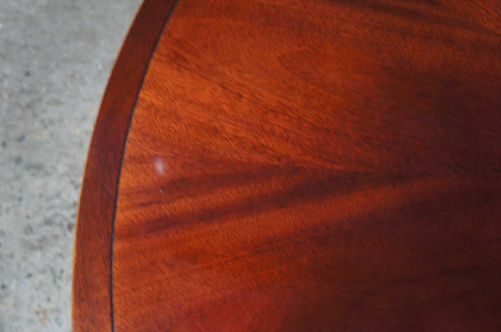 Designed by Barbara Barry for Baker, this pedestal table has a 60 inch round top with concave rim. Six curving legs are connected by a circular stretcher. The luxurious mahogany wood is covered in a rich, dark finish.