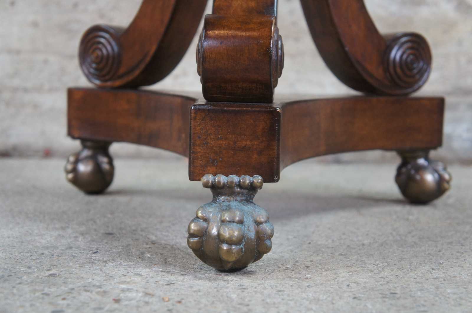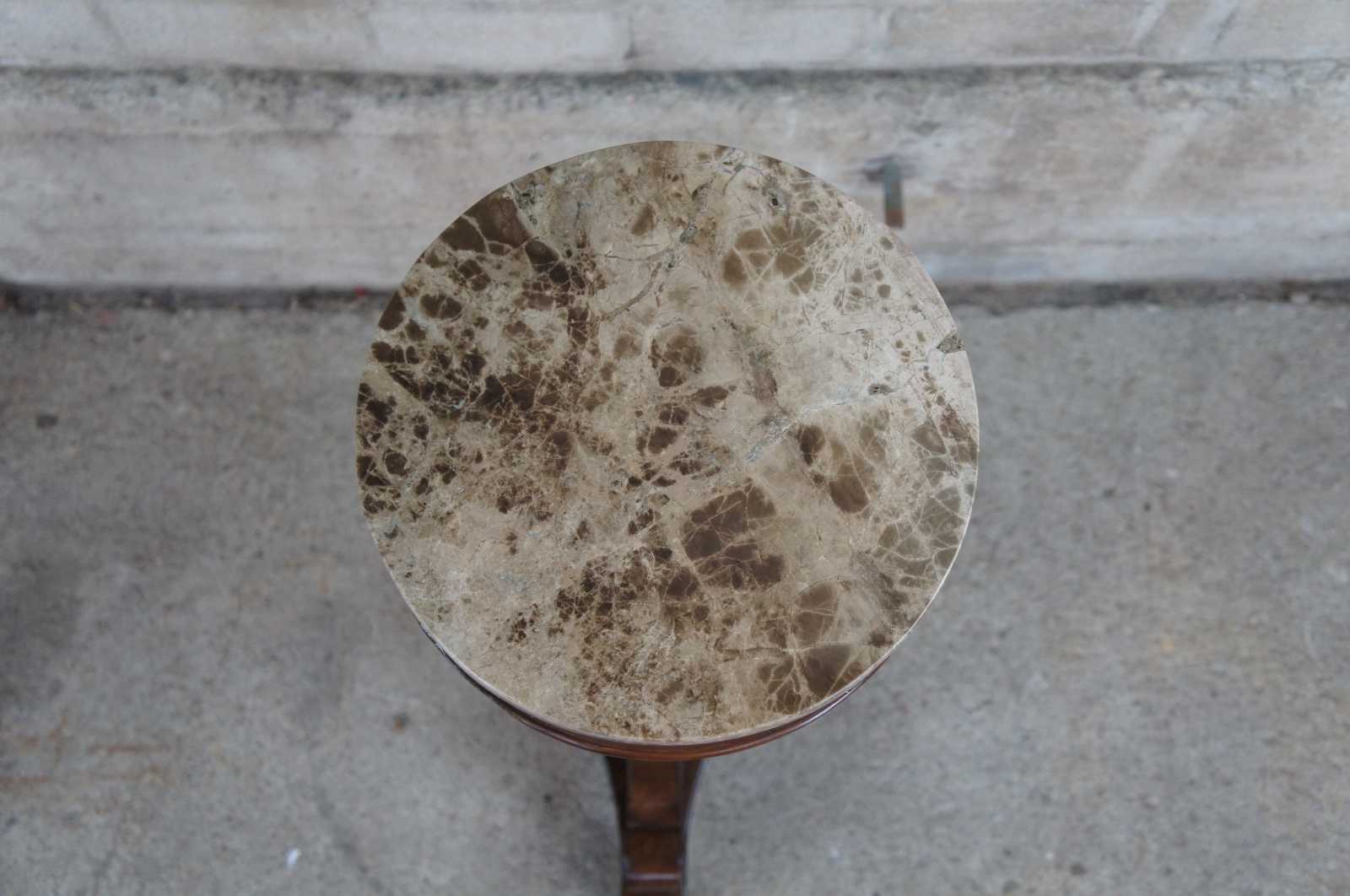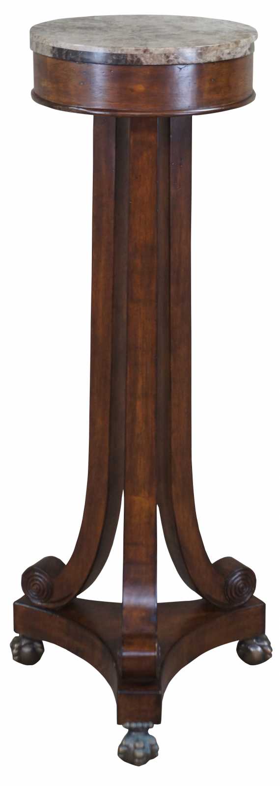 2 Sarreid Ltd marble top pedestals. Made from mahogany with tripod base over ball and claw feet. #18787