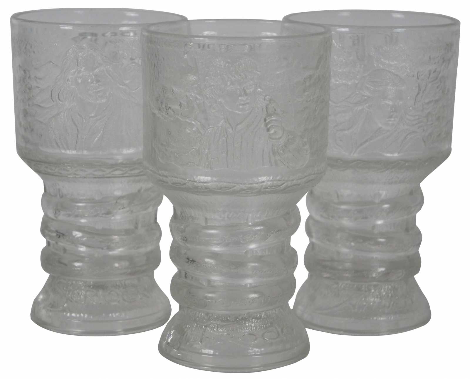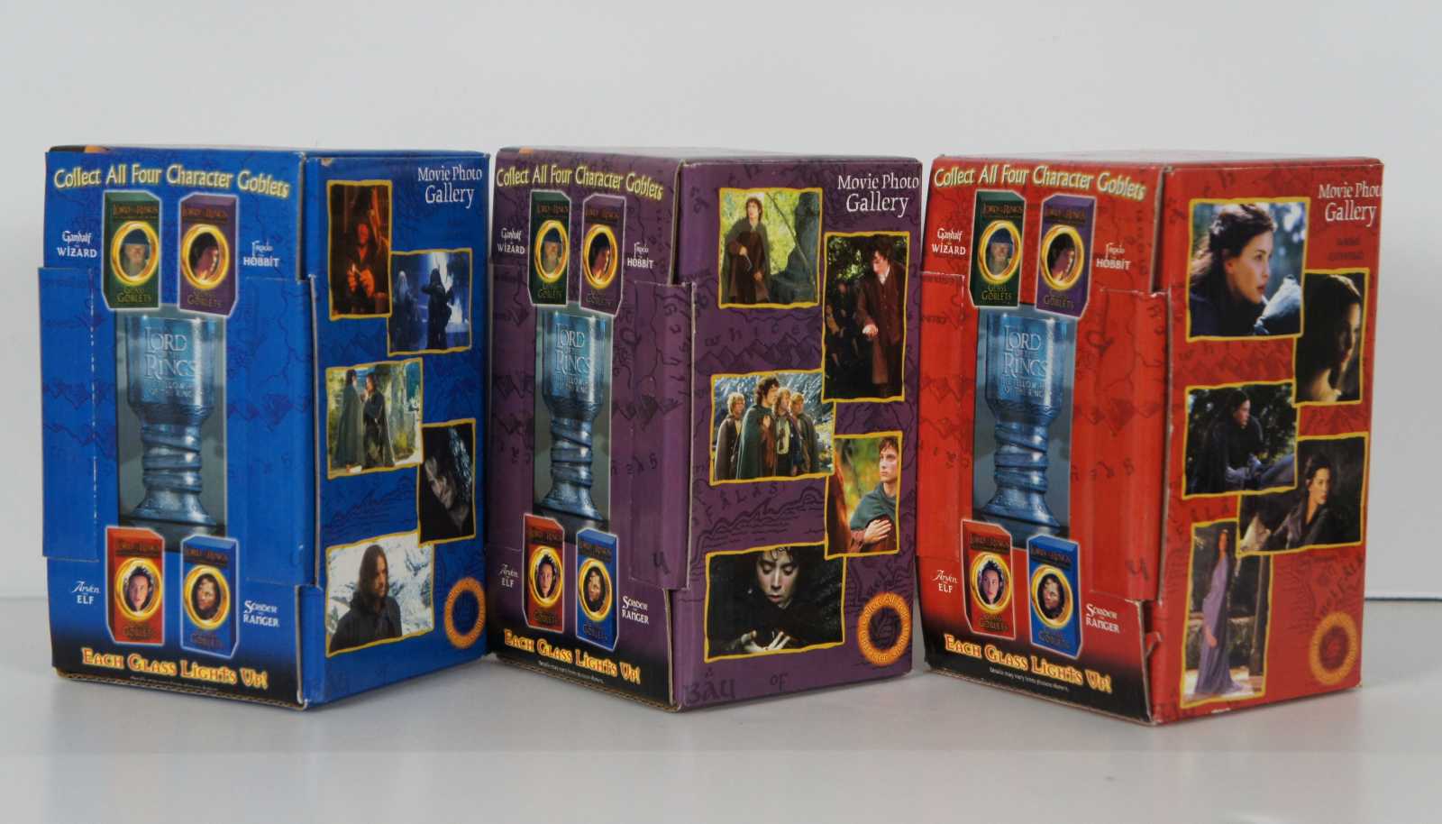 Set of 3 original Lord of the Rings: The Fellowship of the Ring promotional, collectible glass goblets with illuminated bases and original packaging, produced for Burger King in December 2001. Set includes Frodo, Arwen and Strider (Aragorn)